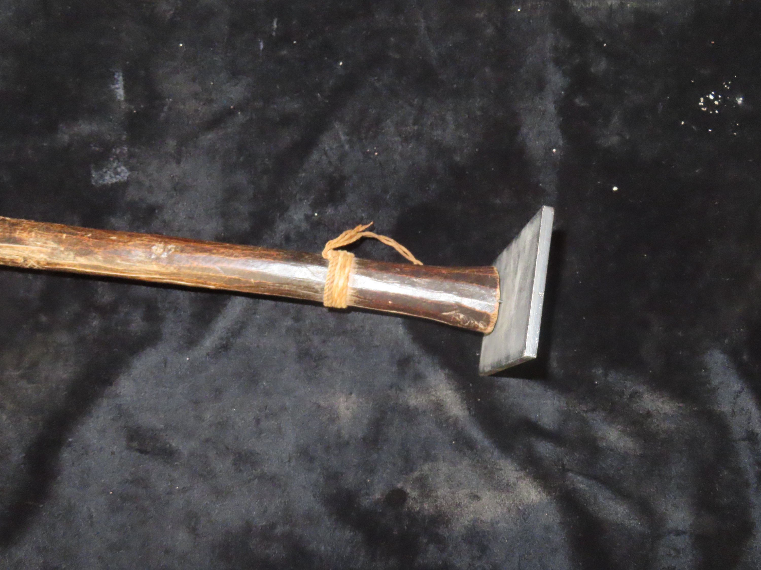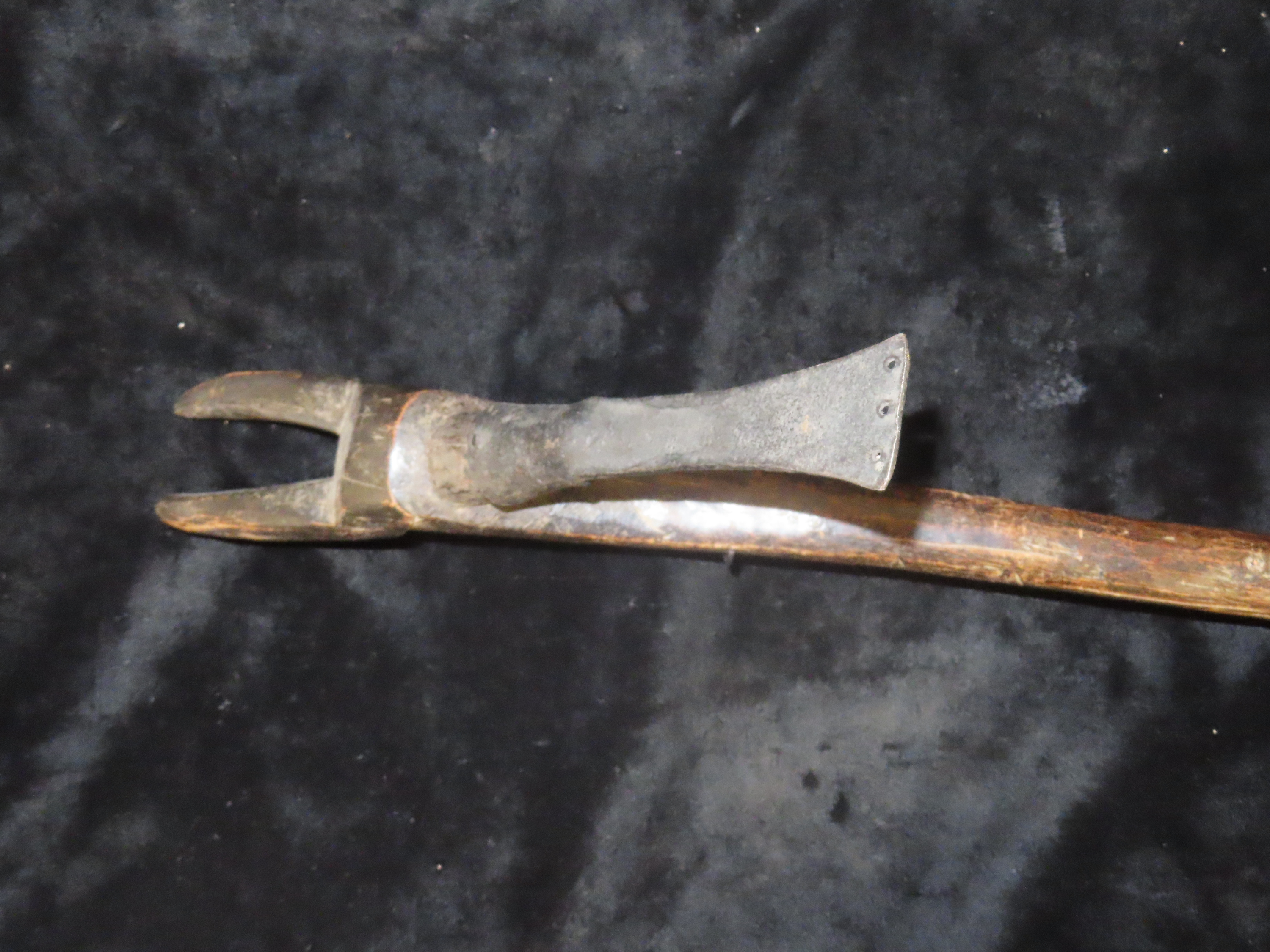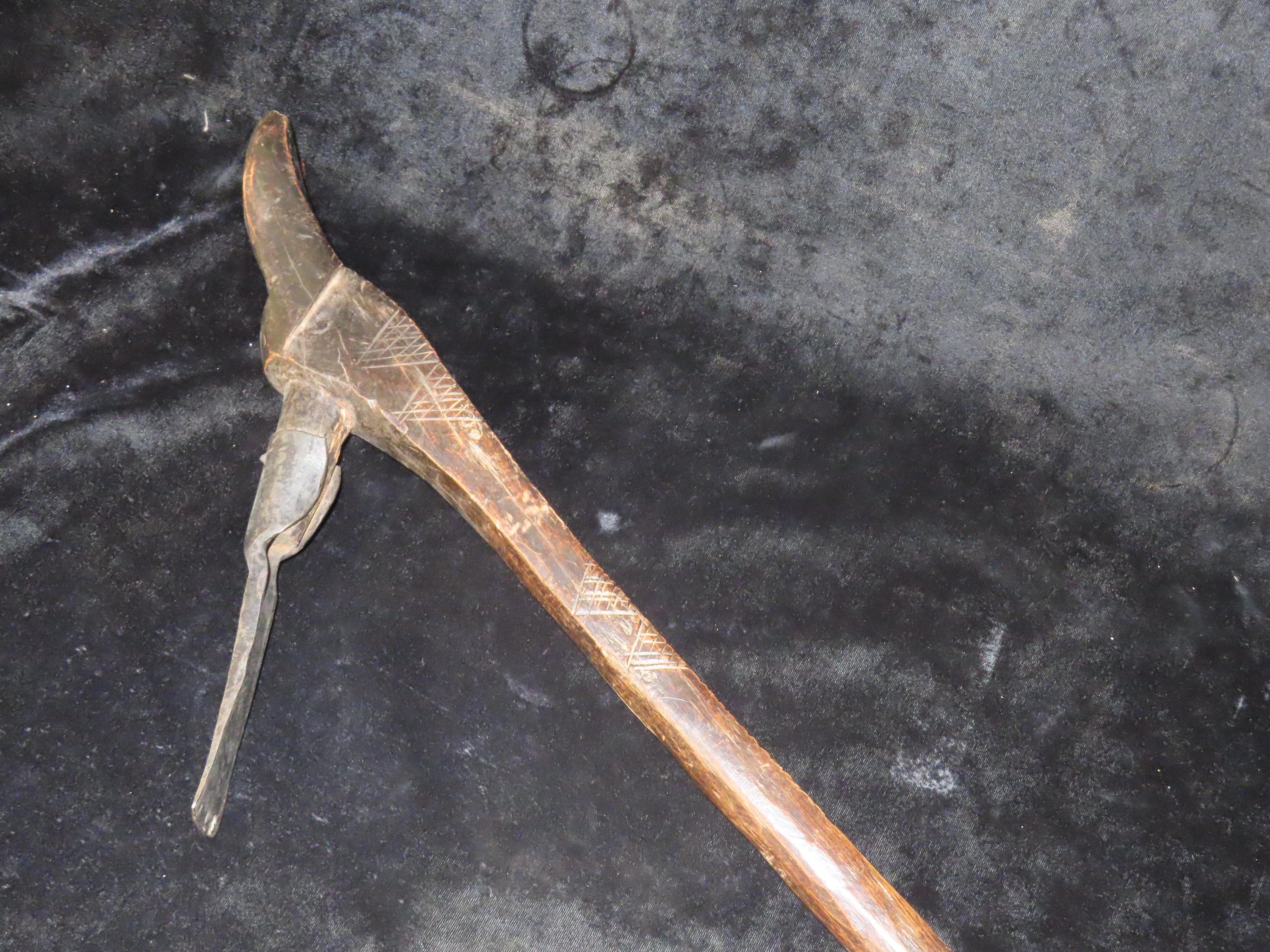 Amazing 24″ Animal Effigy Duckbill hafted Axe, Mali. Great, Well Designed handle with excellent age and patina. Comes with a Custom museum metal display stand.