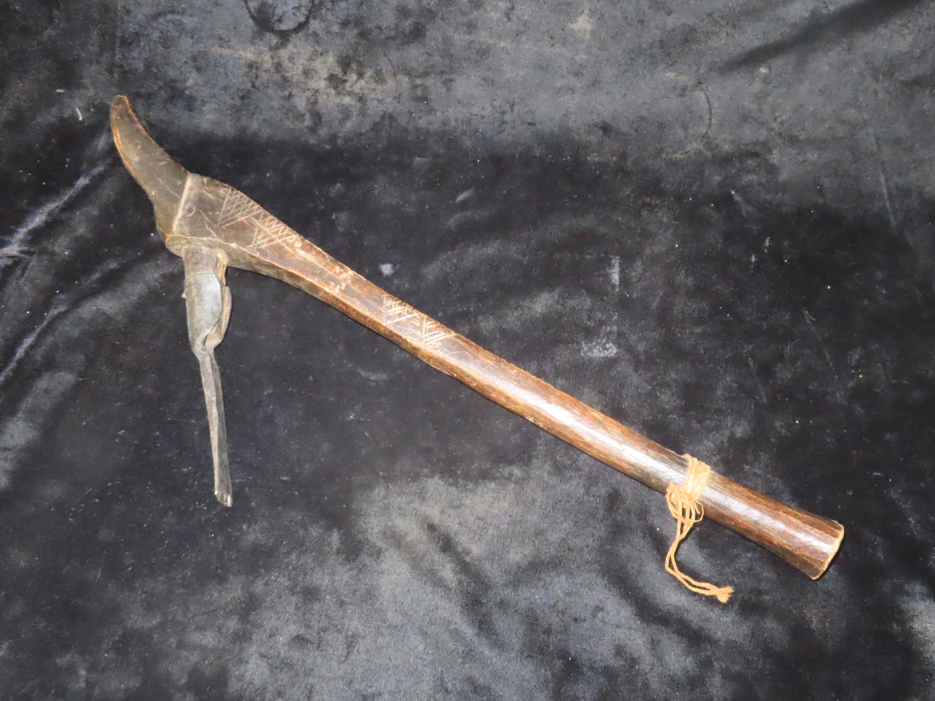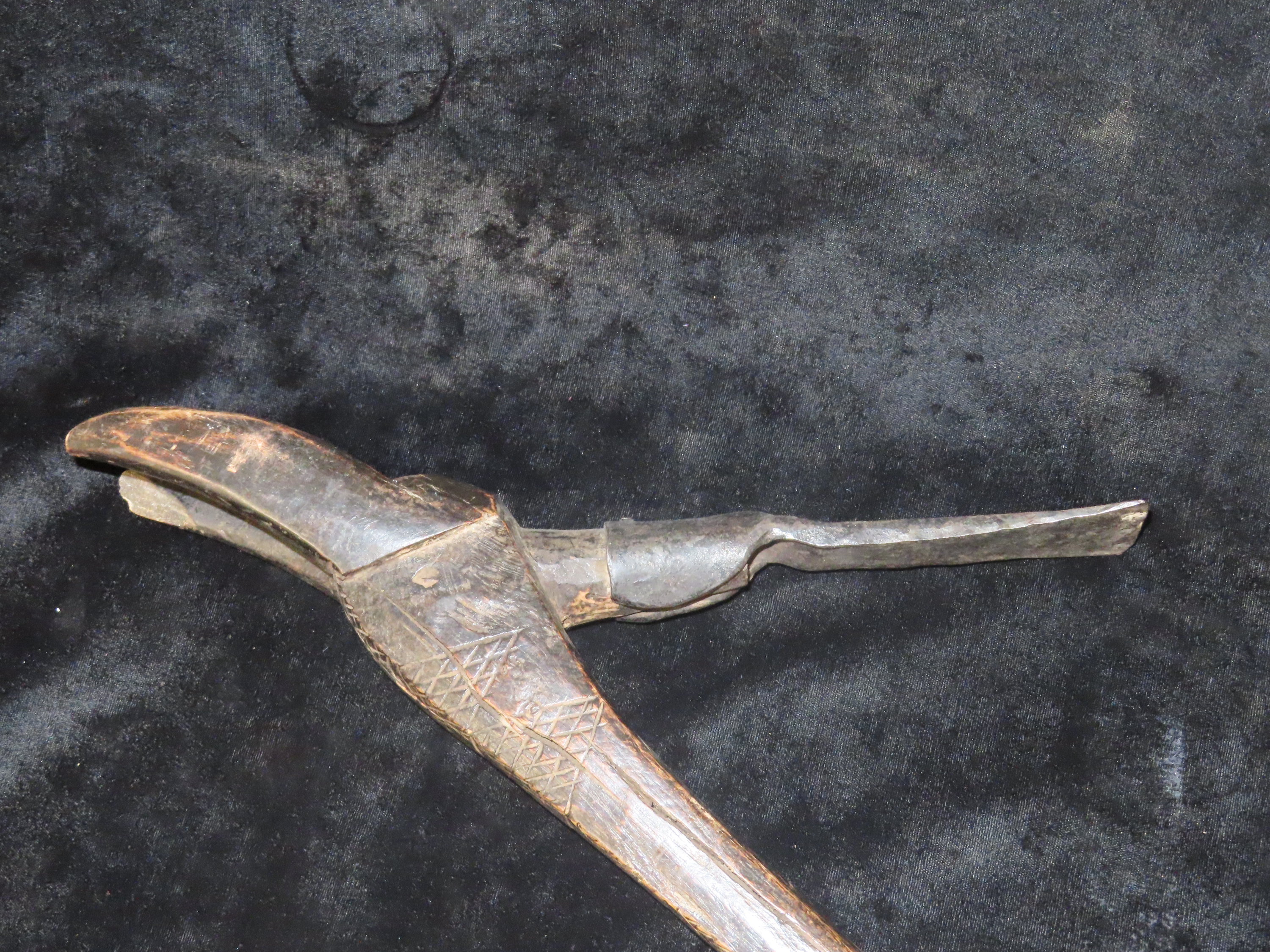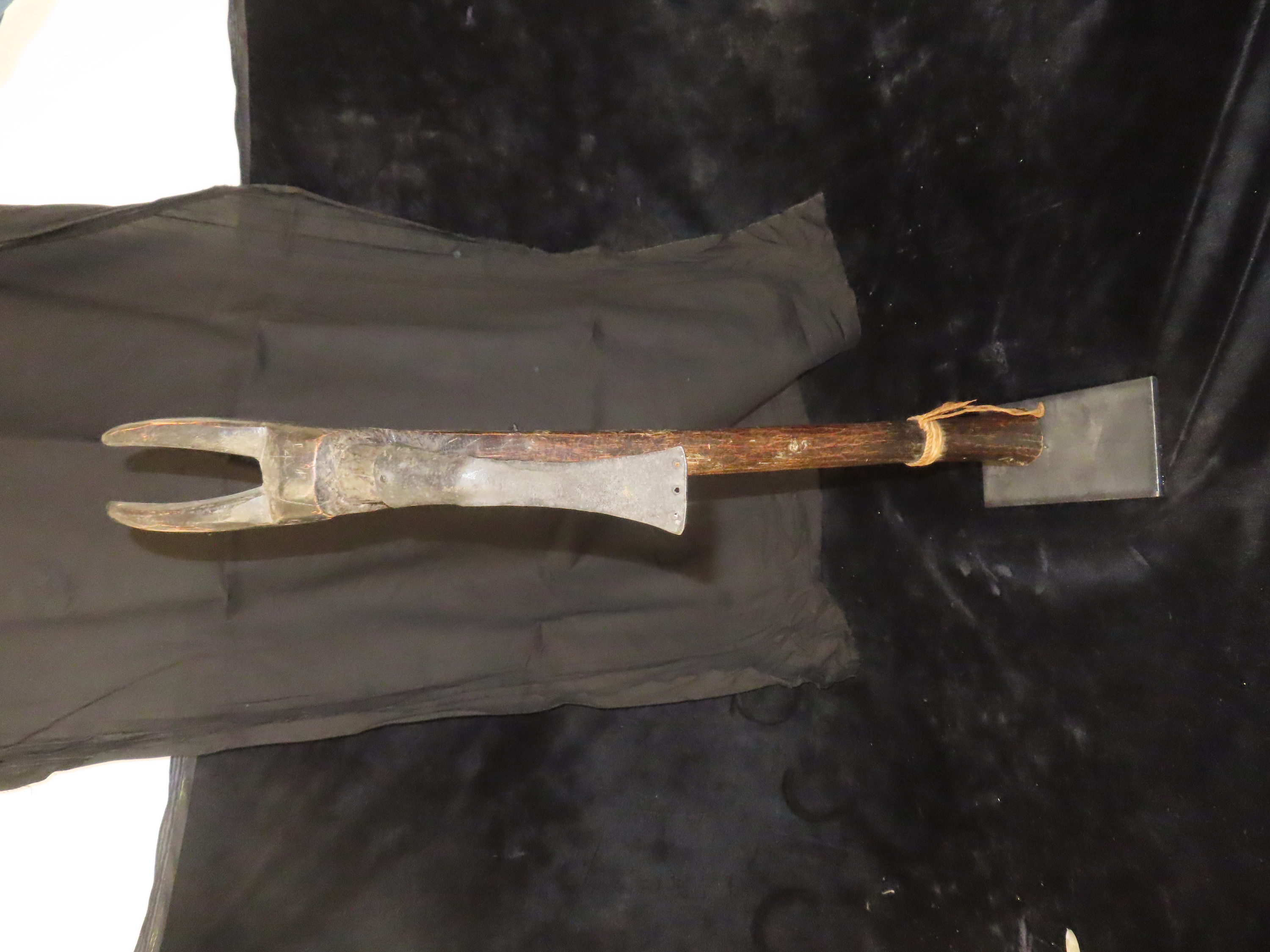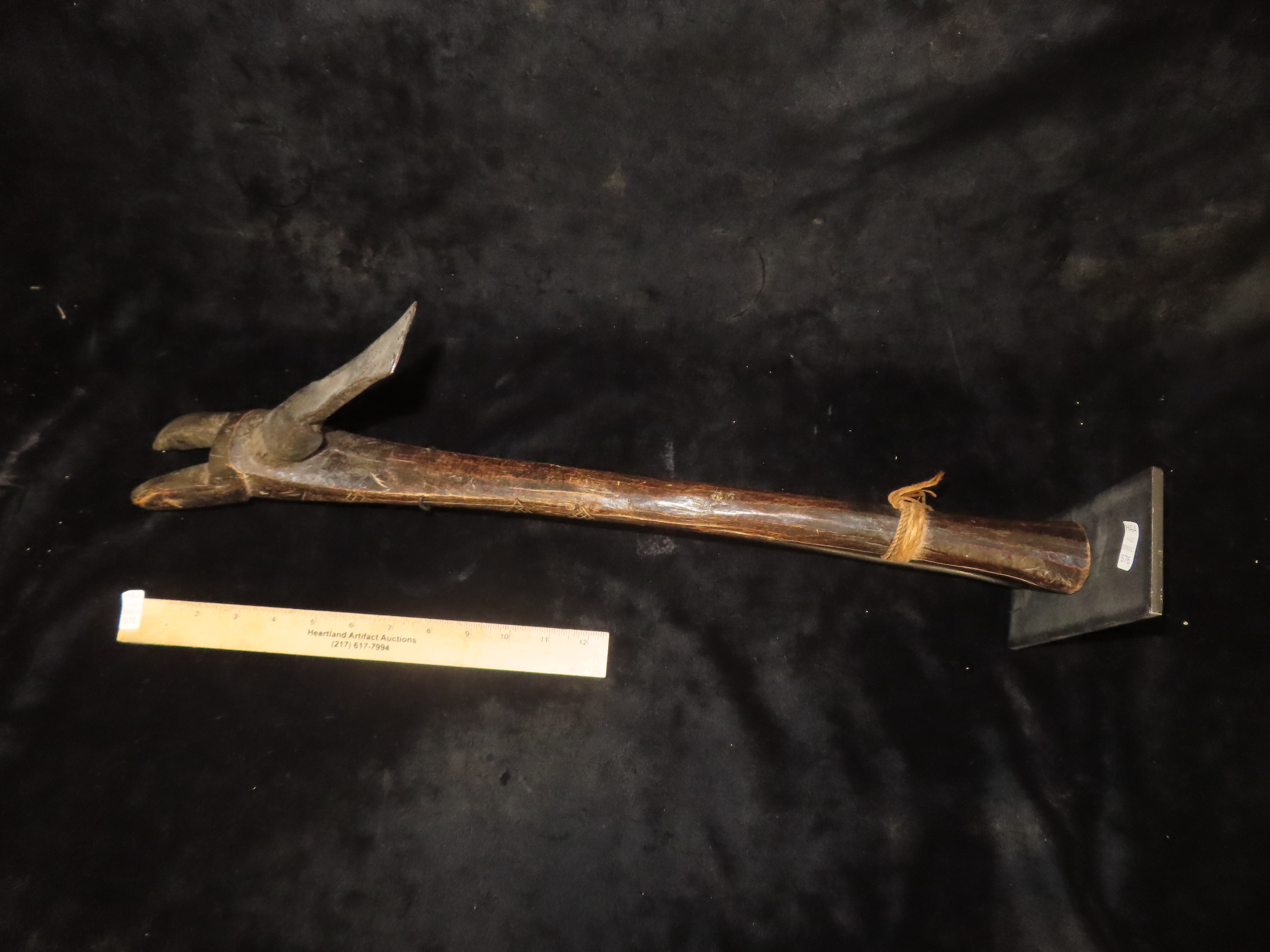 Amazing 24" Animal Effigy Duckbill hafted Axe, Mali. Great, Well Designed handle with excellent age and patina. Comes with a Custom museum metal display stand.