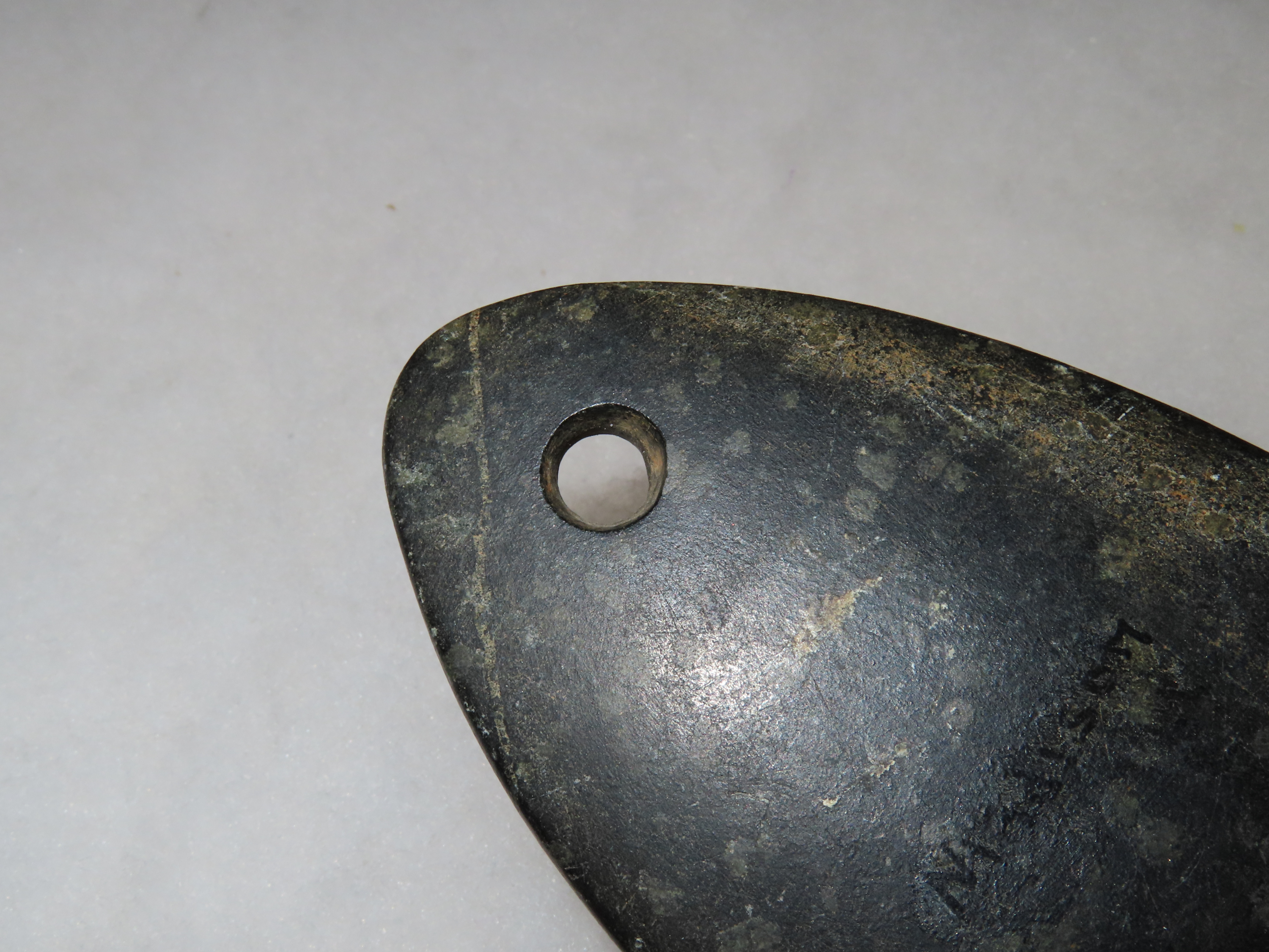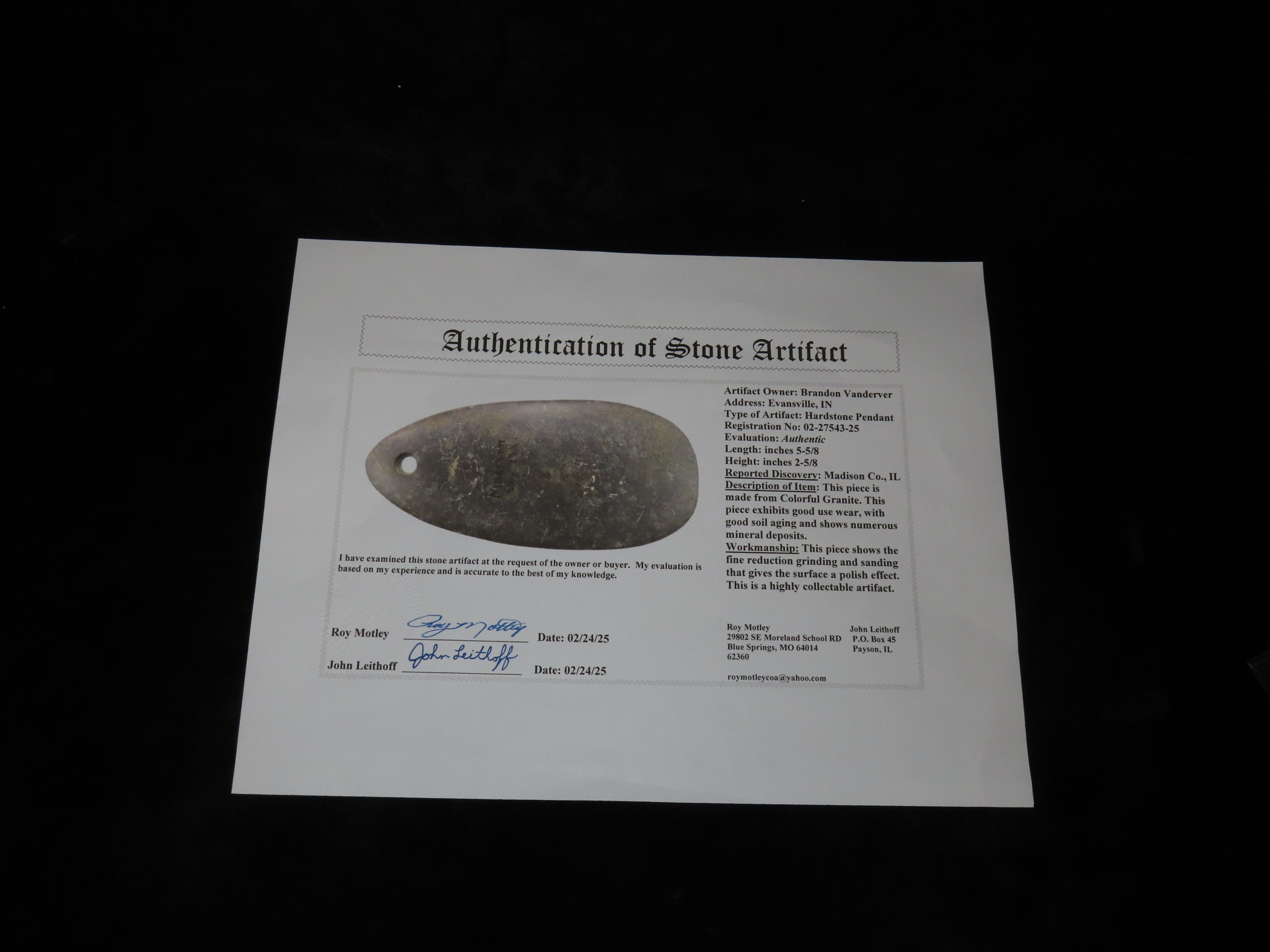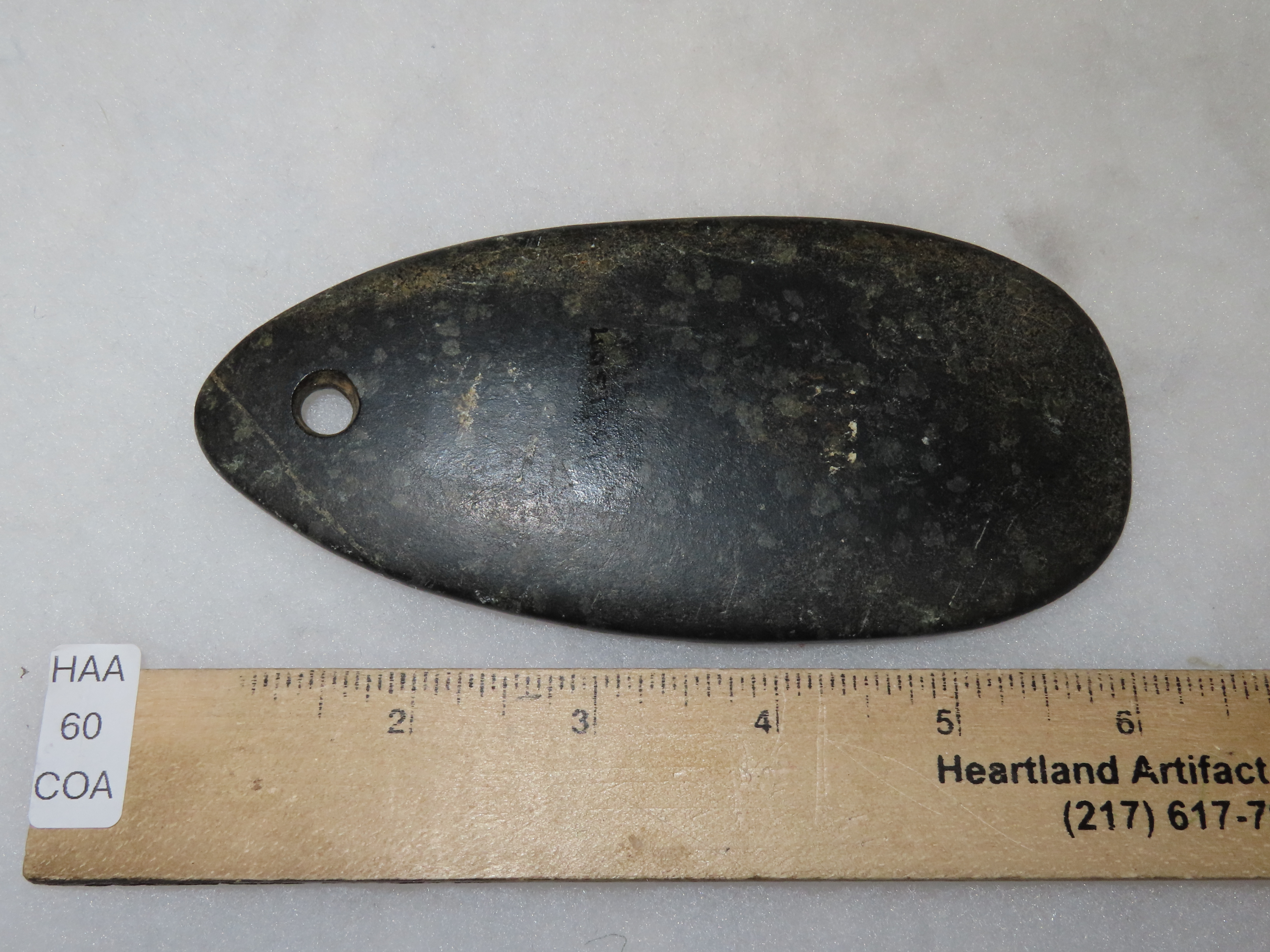 Amazing 5 5/8″ Hardstone Pendant, Madison Co. Illinois. Motley COA. Ex Floyd Ritter Collection. Nice large example with great polish and no brainer patina.