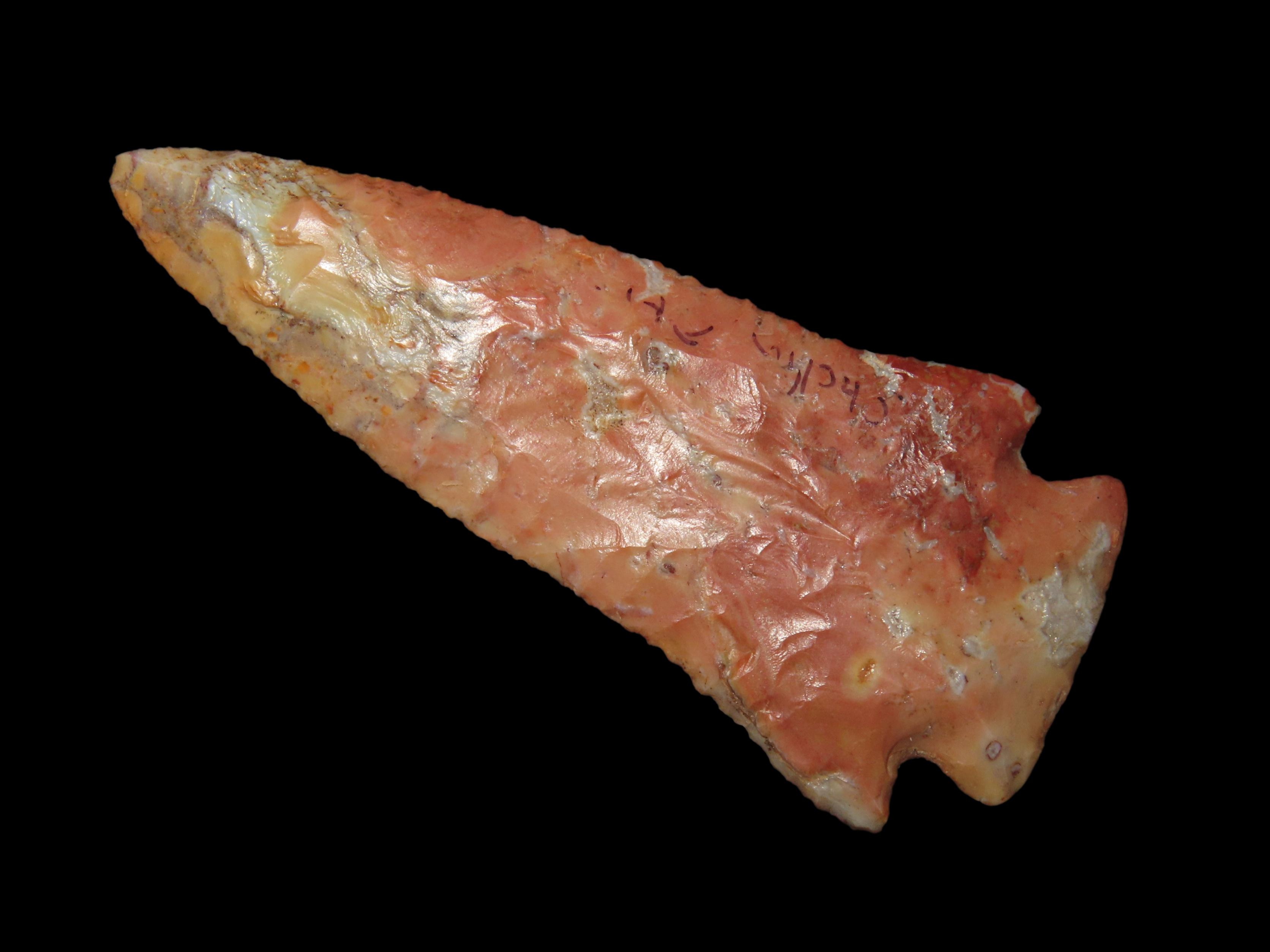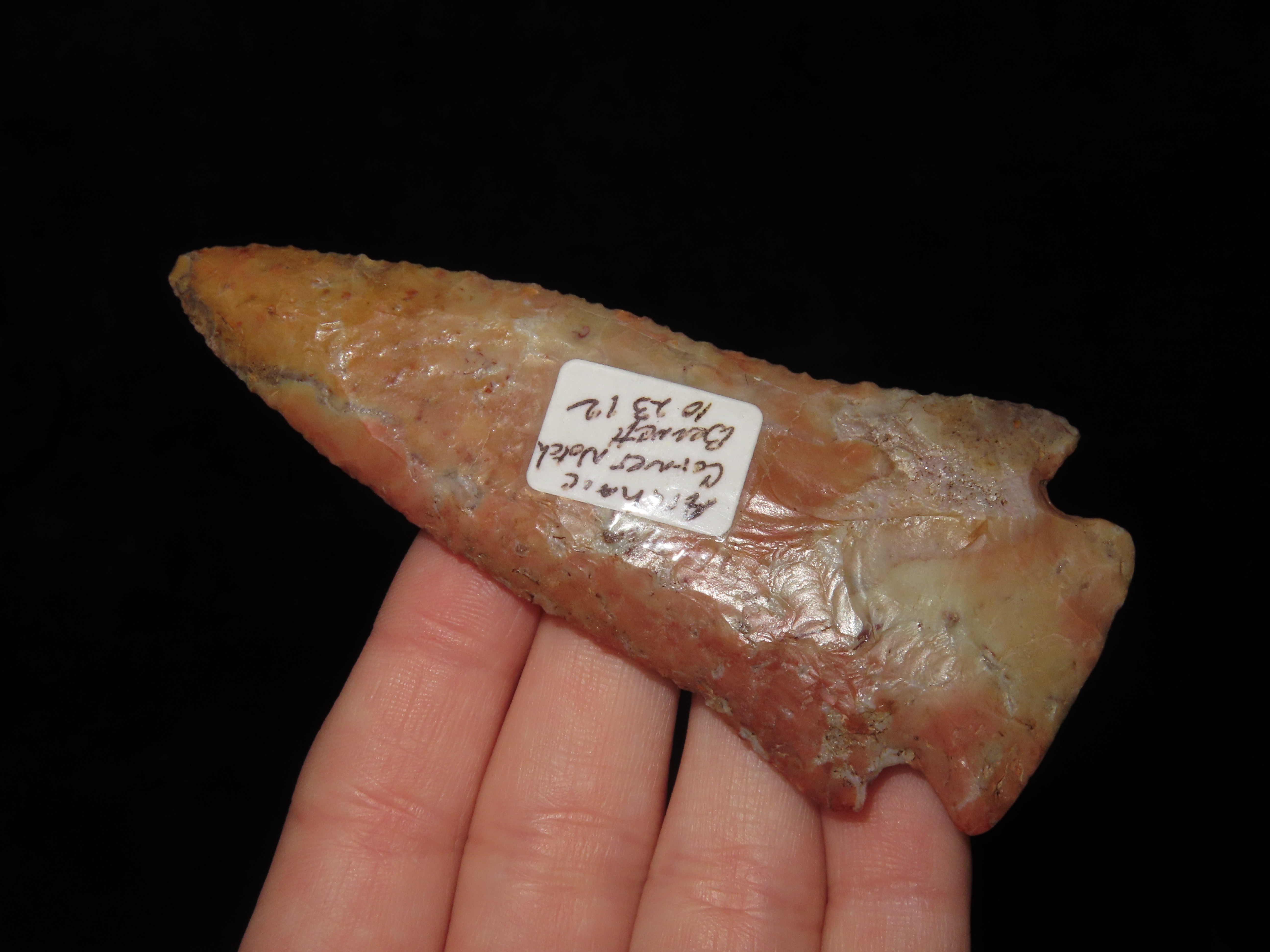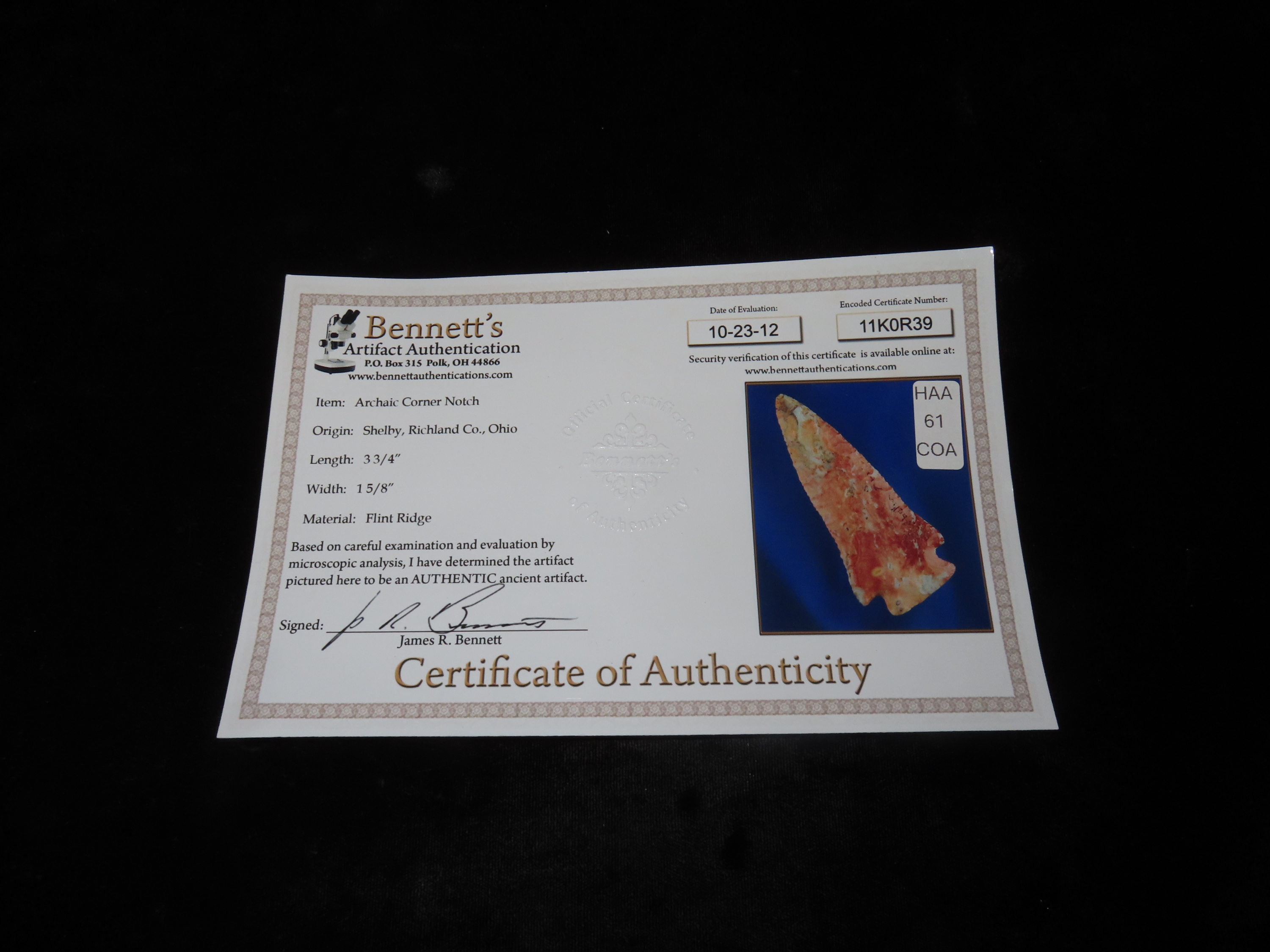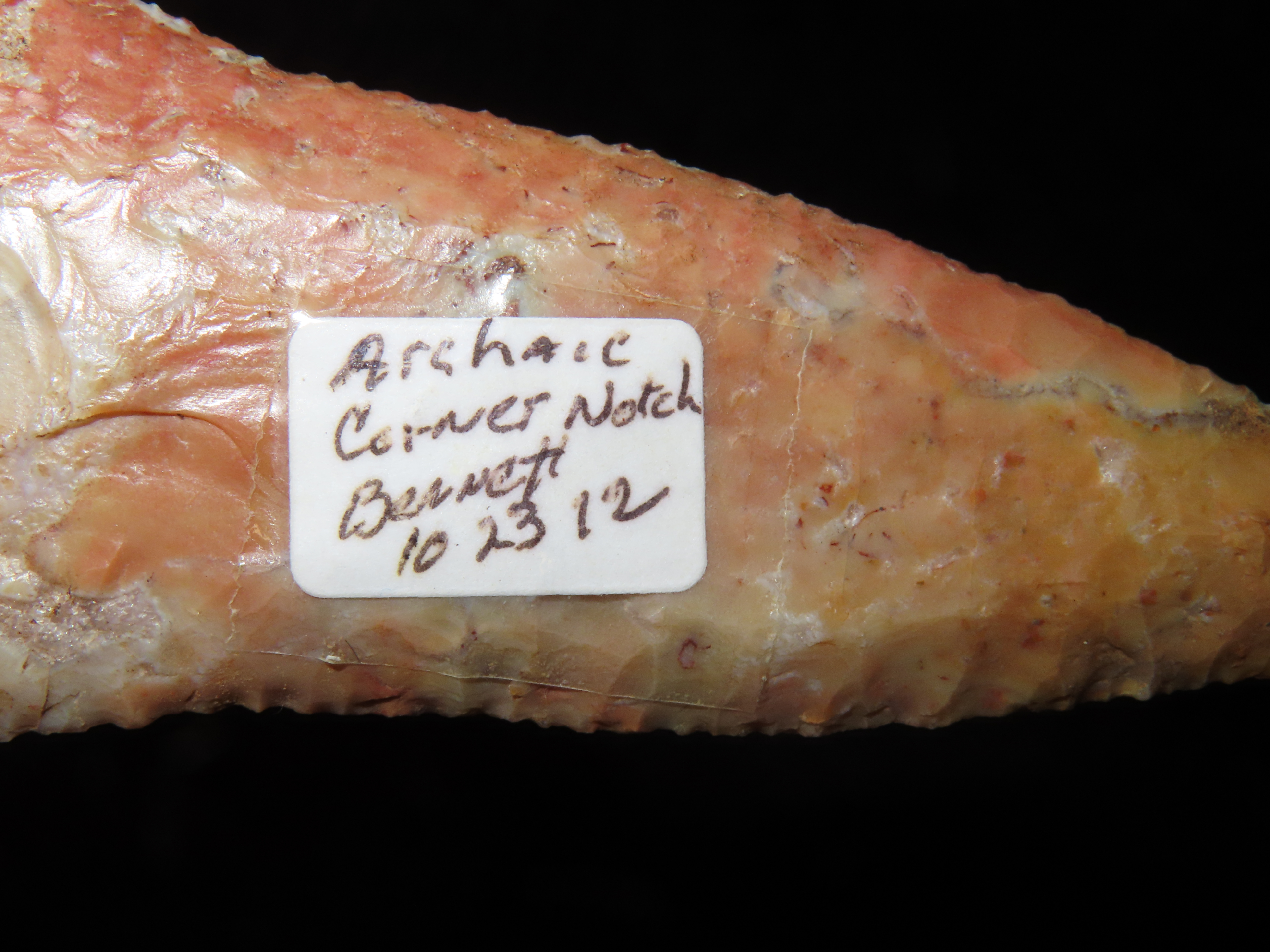 Incredible 3 3/4″ Archaic Corner Notch / Stillwell, Richland Co. Ohio. Bennett’s COA. Beautiful piece od Colorful Flint Ridge. Very well flaked example with outstanding color. Bought back on 2012 and has been tucked away ever since!