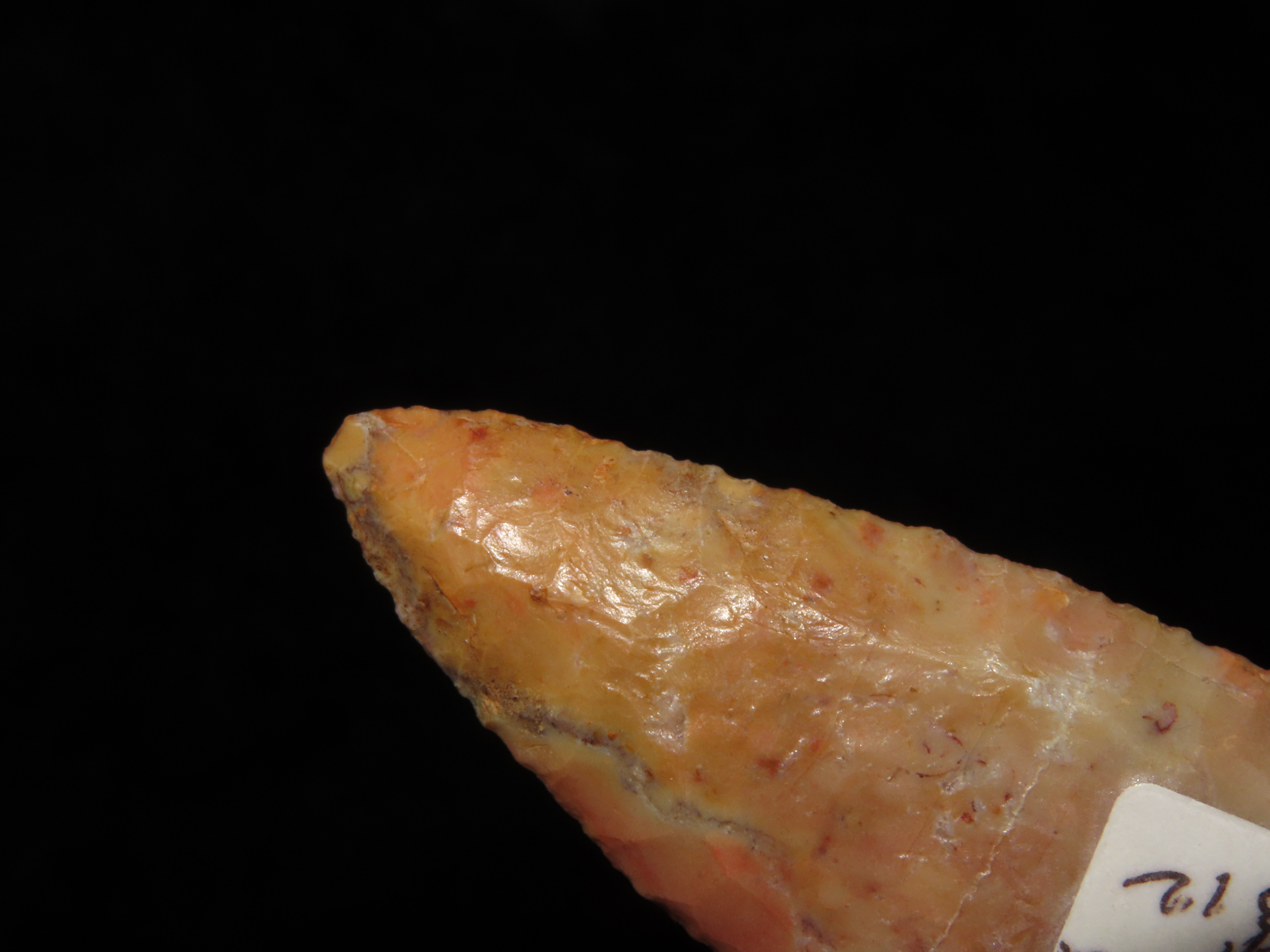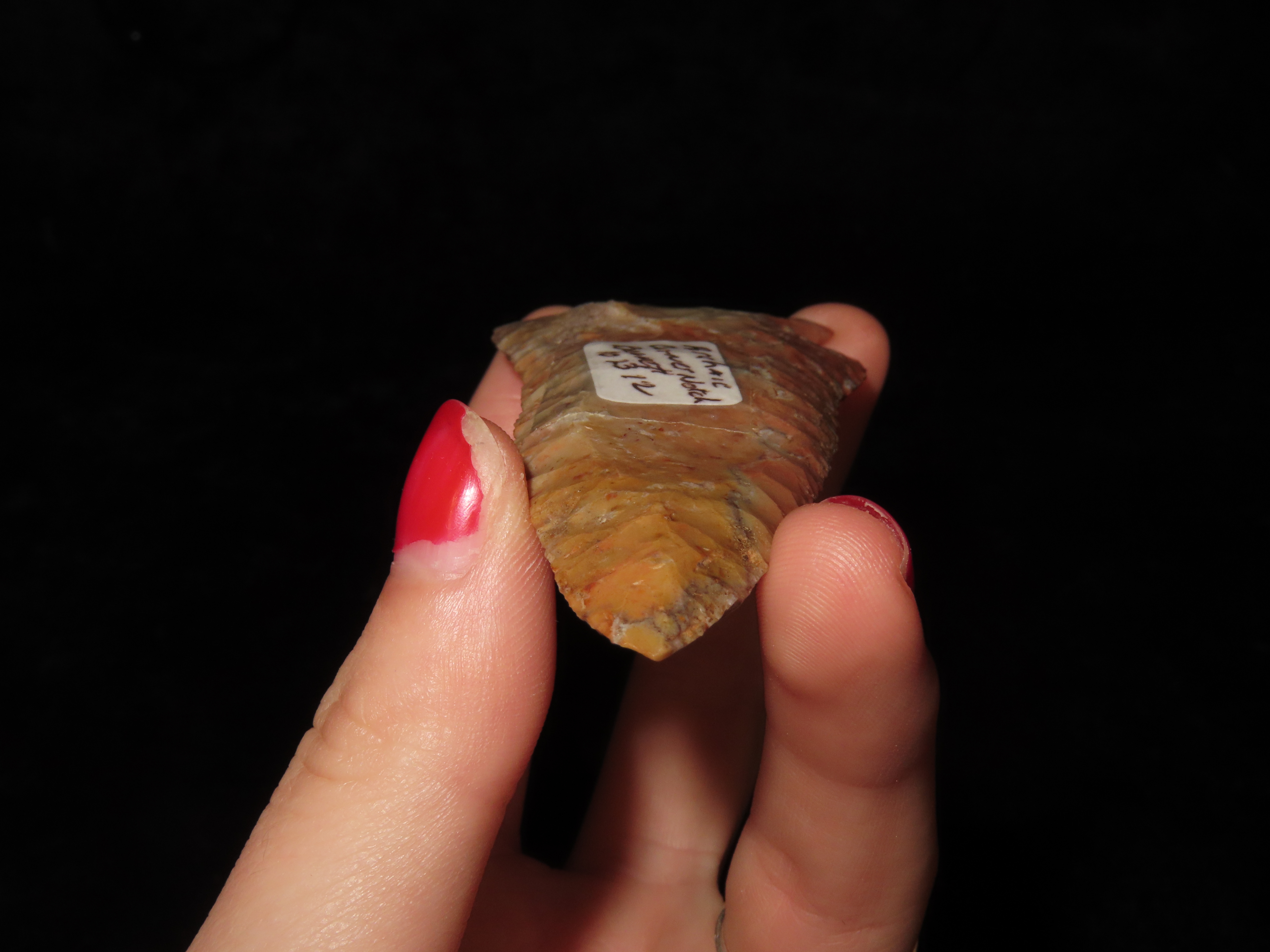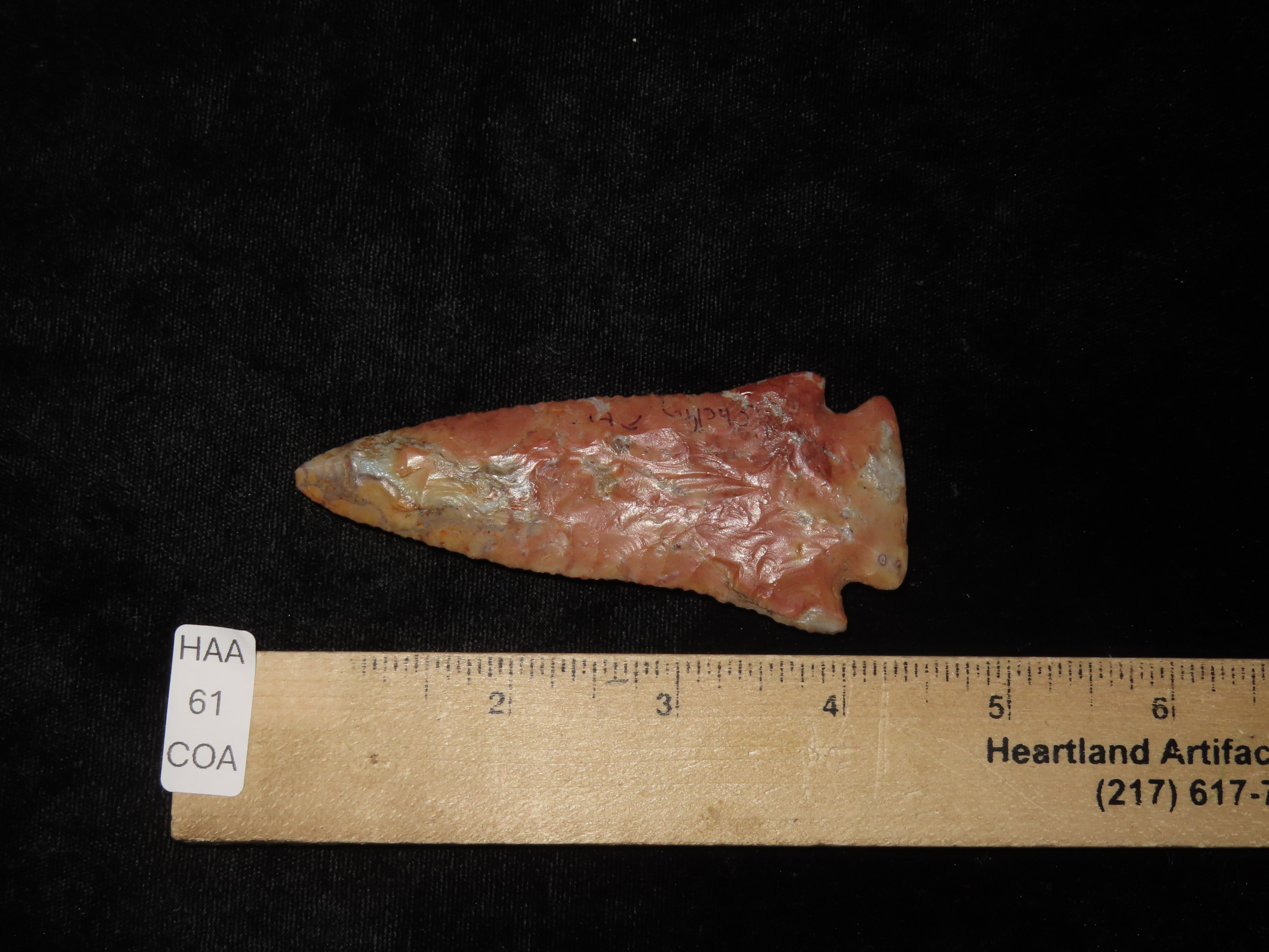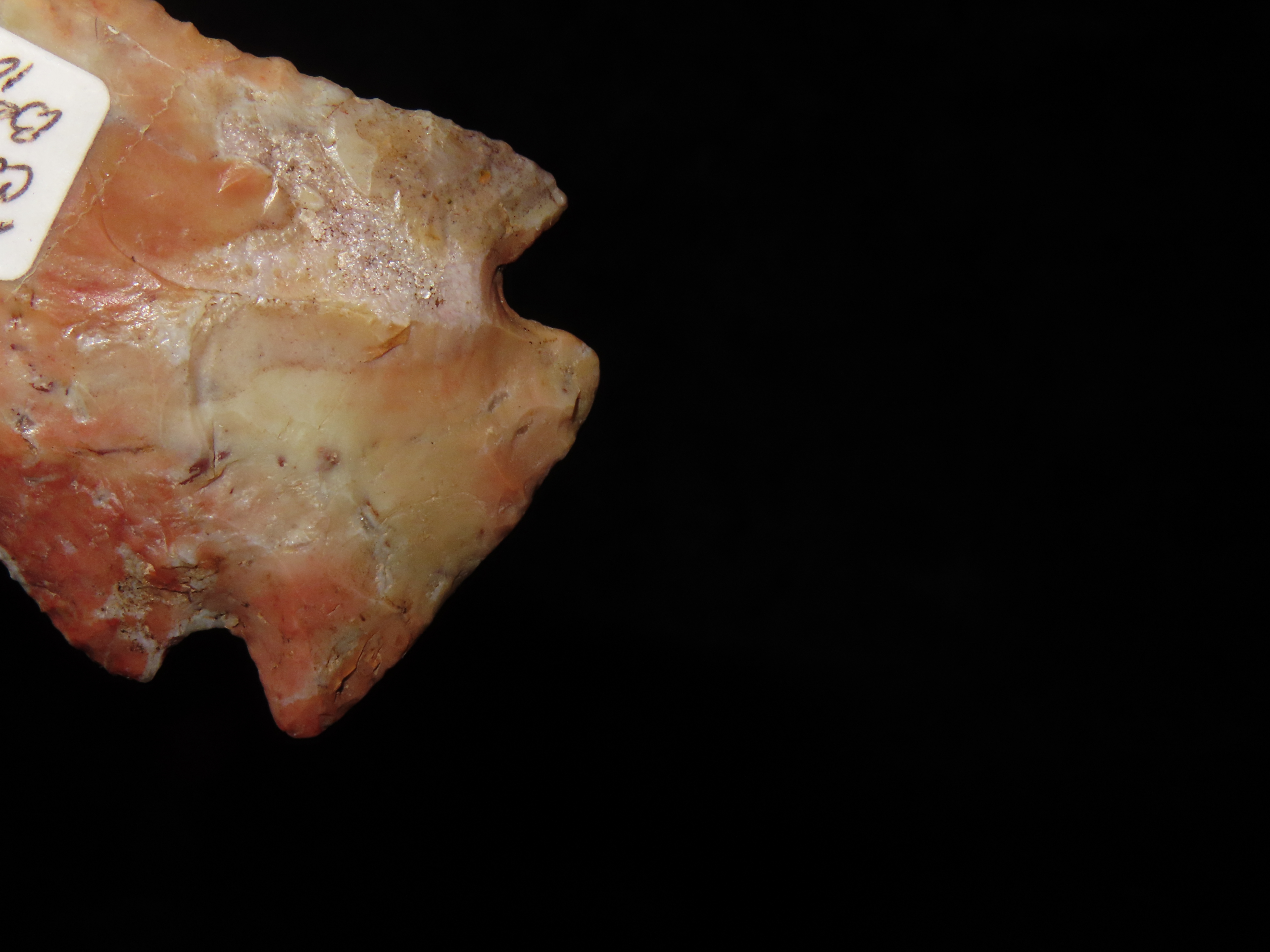 Incredible 3 3/4″ Archaic Corner Notch / Stillwell, Richland Co. Ohio. Bennett’s COA. Beautiful piece od Colorful Flint Ridge. Very well flaked example with outstanding color. Bought back on 2012 and has been tucked away ever since!