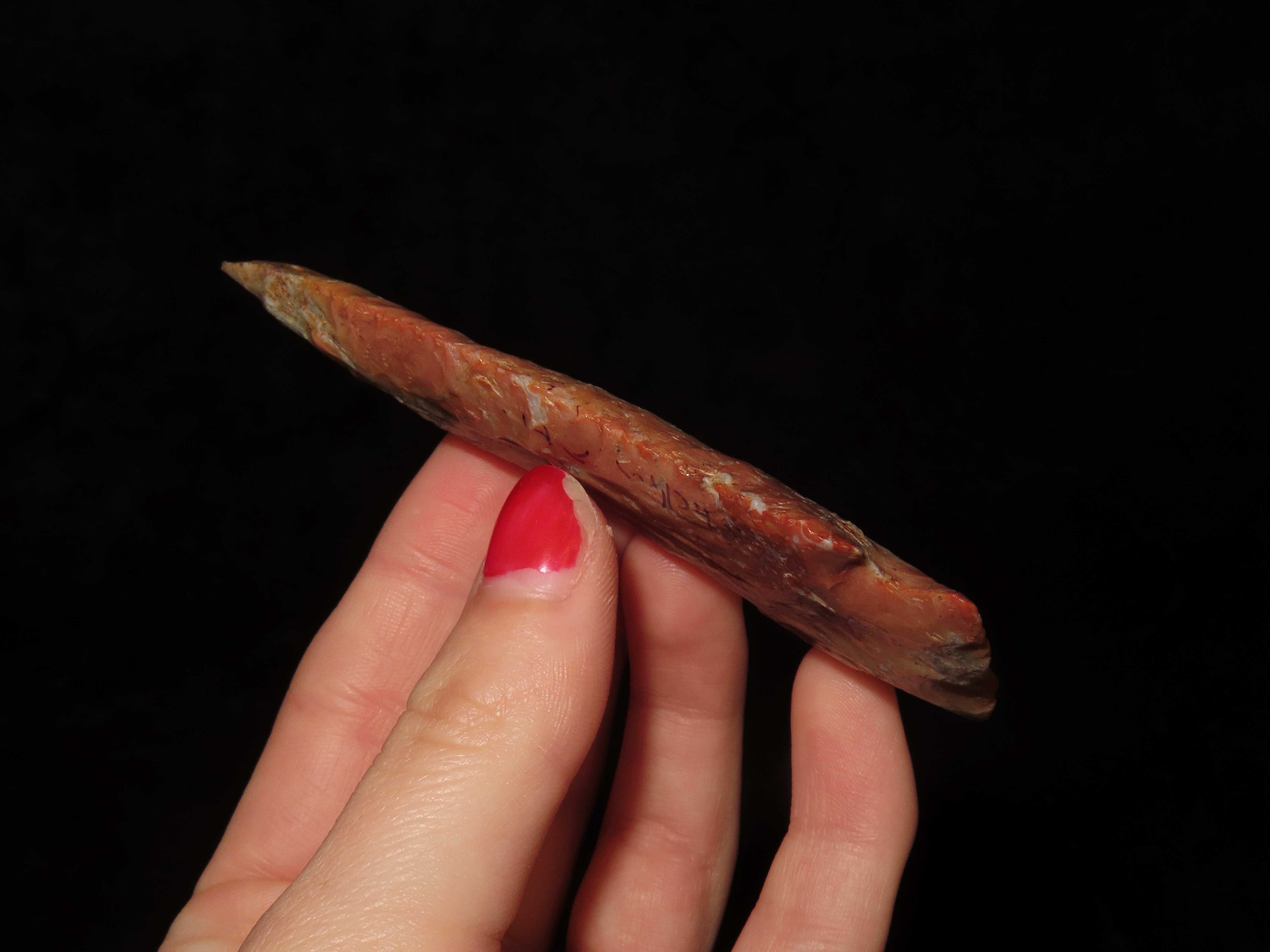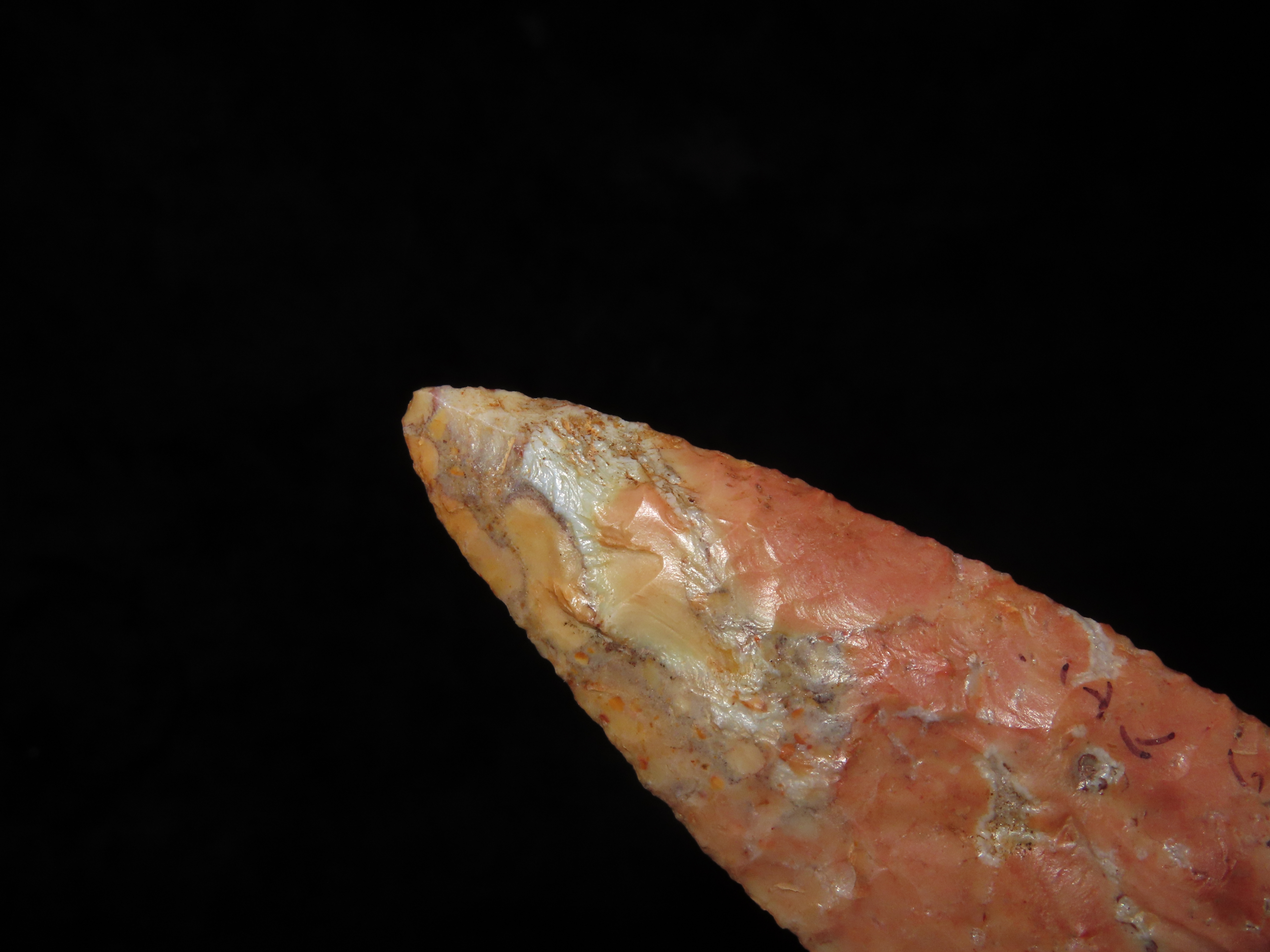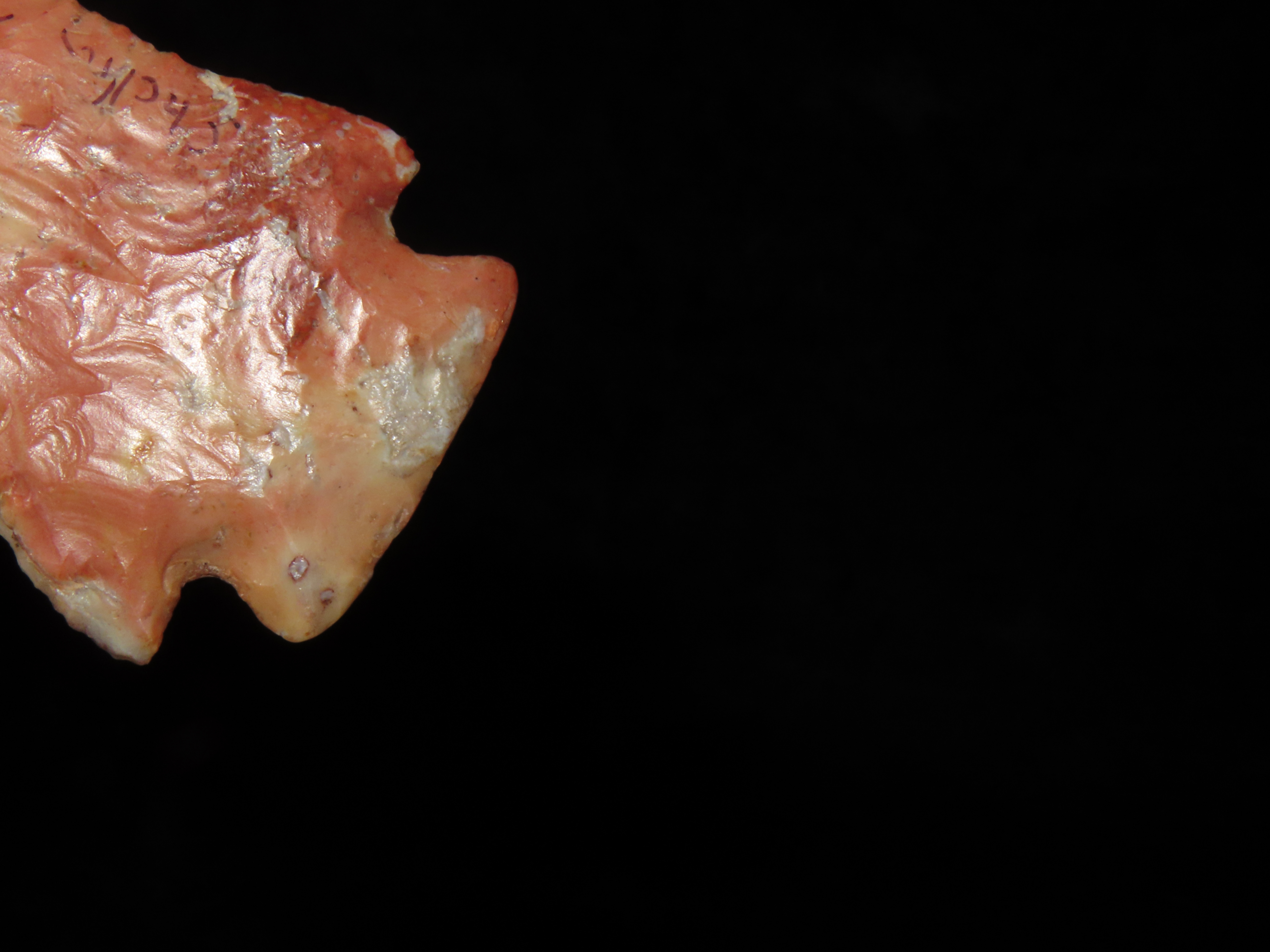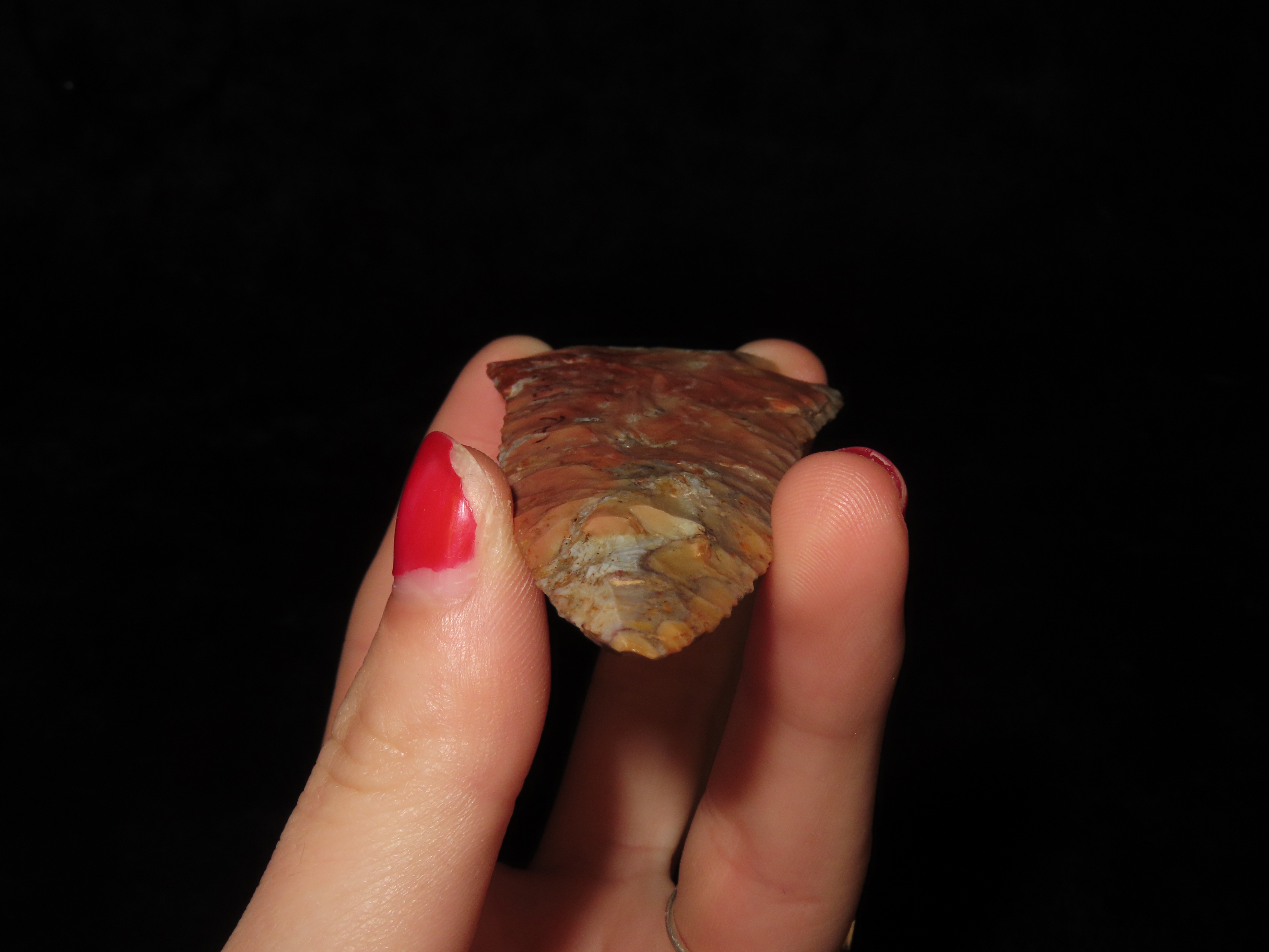 Incredible 3 3/4″ Archaic Corner Notch / Stillwell, Richland Co. Ohio. Bennett’s COA. Beautiful piece od Colorful Flint Ridge. Very well flaked example with outstanding color. Bought back on 2012 and has been tucked away ever since!