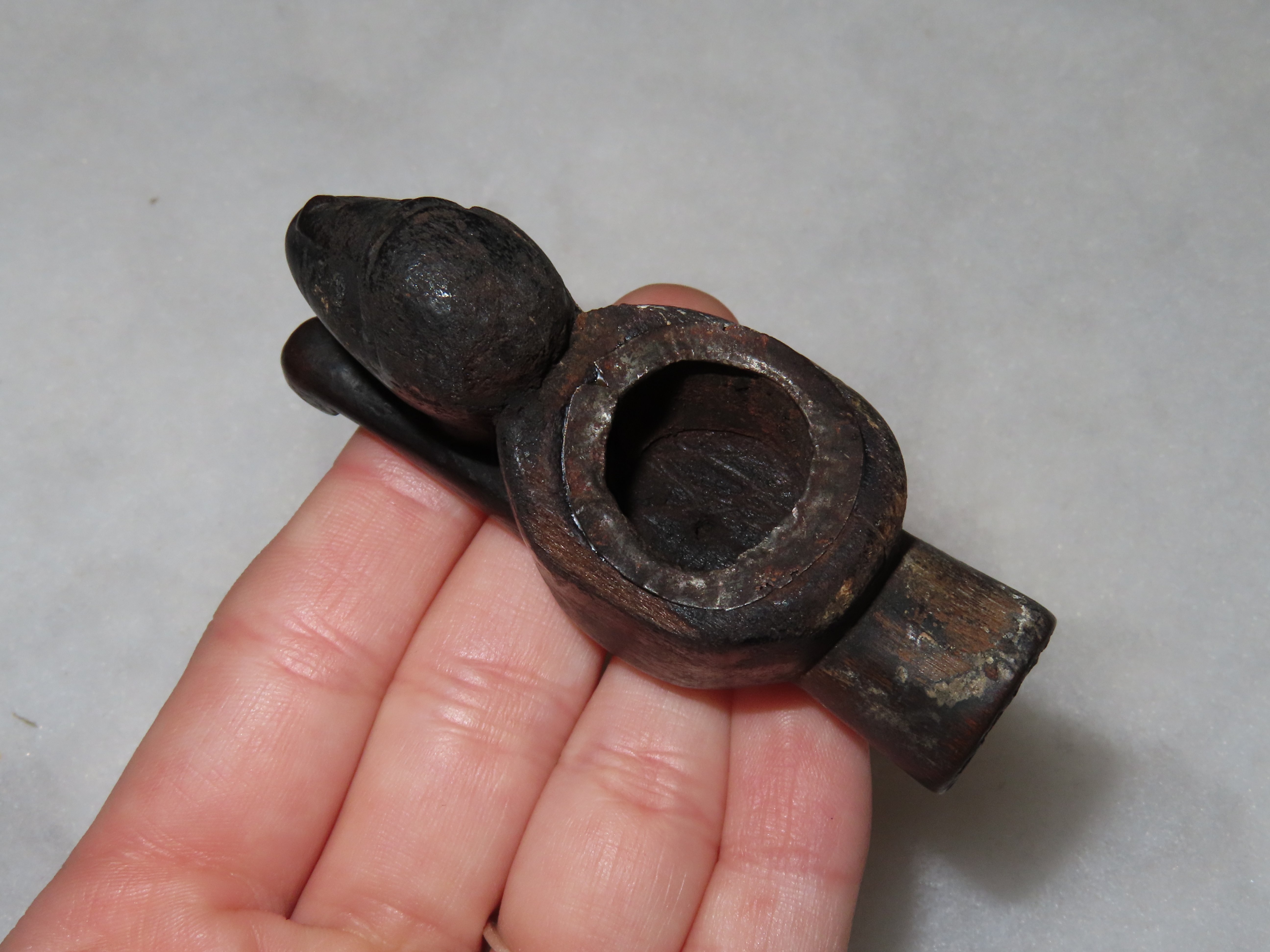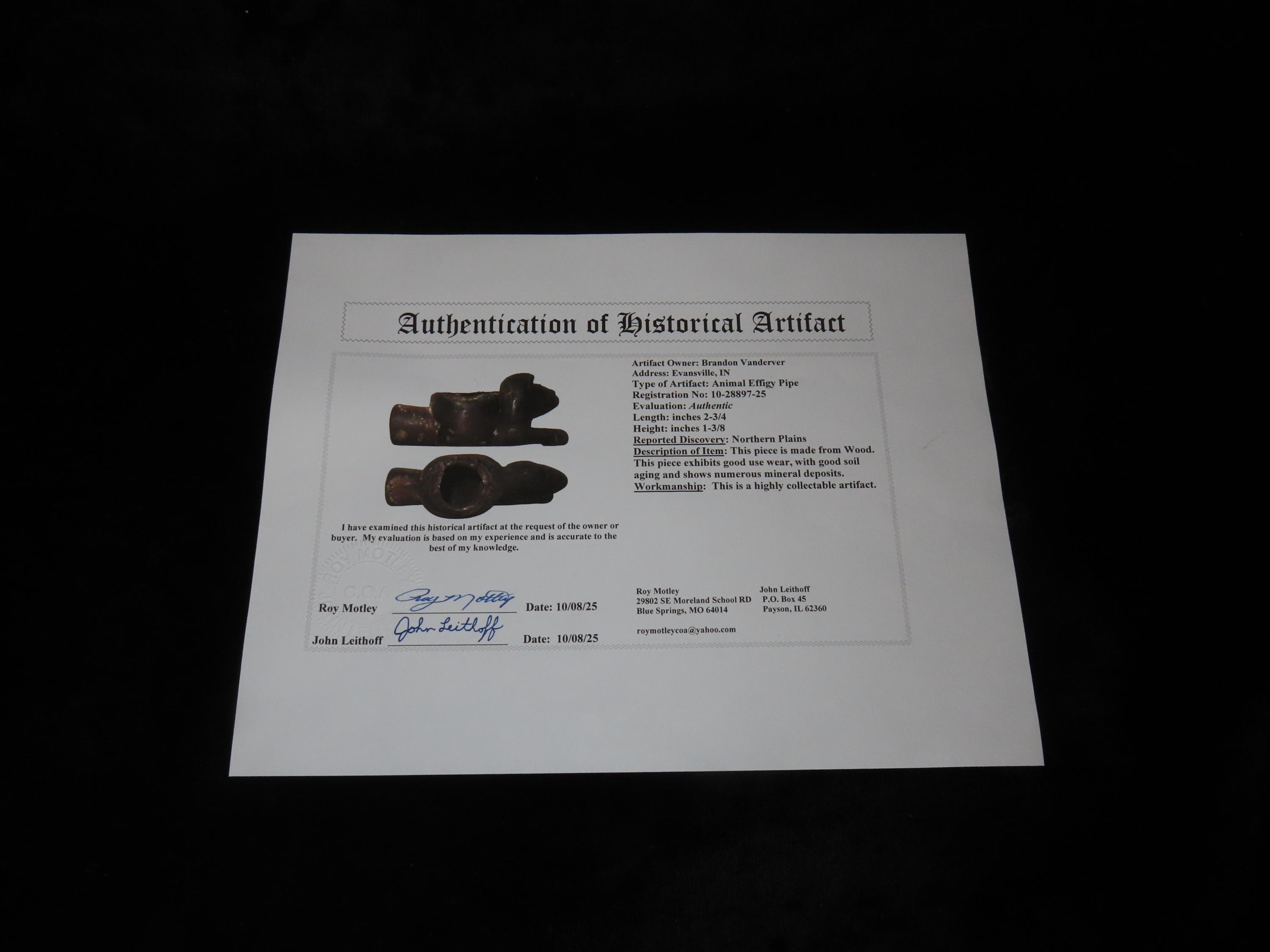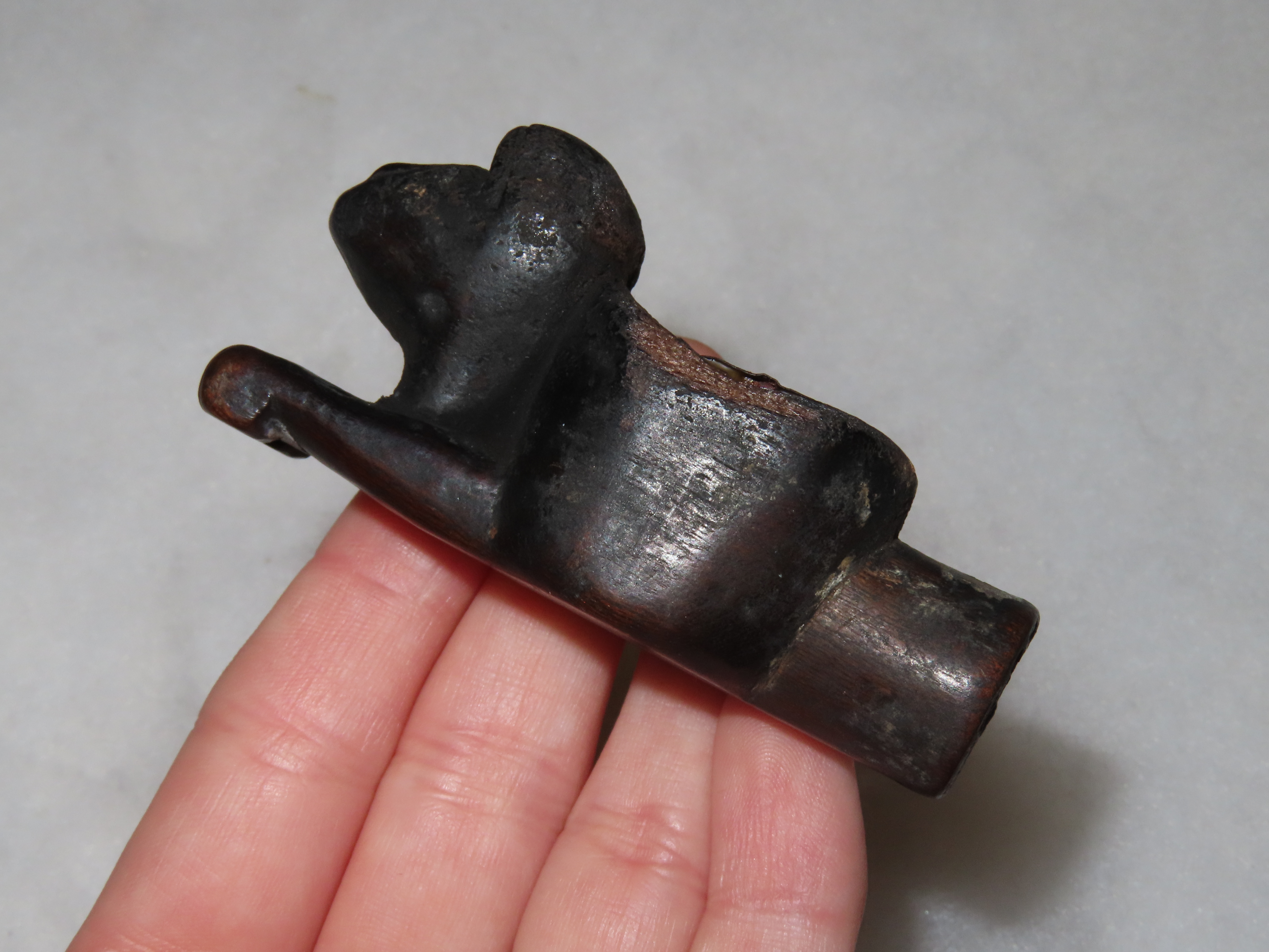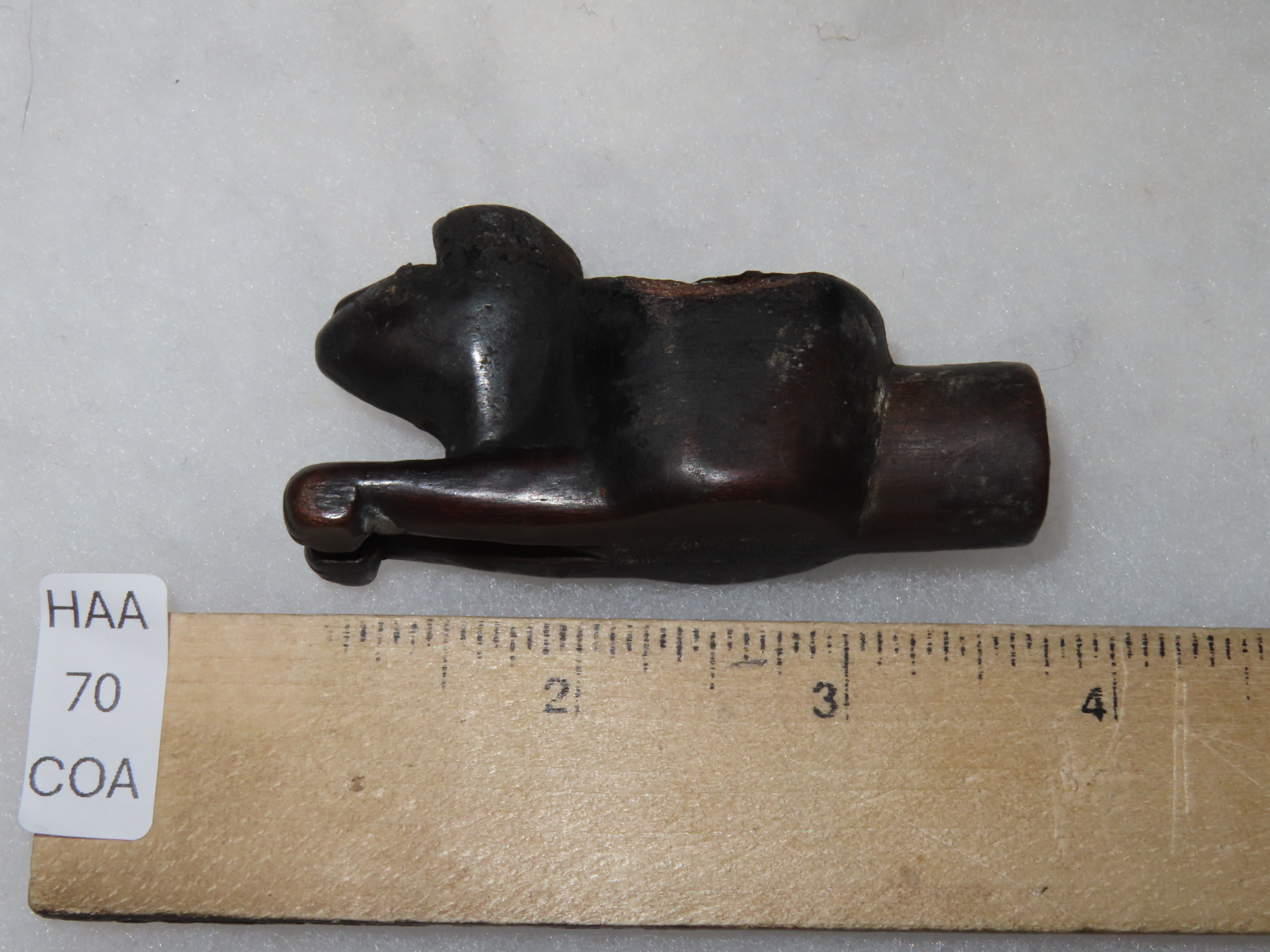 2 3/4″ Animal Effigy Pipe, Northern Plains, Motley COA. Rare Historic Example made from wood with a metal insert in the bowl. Heavy age & patina. Very neat old pipe!
