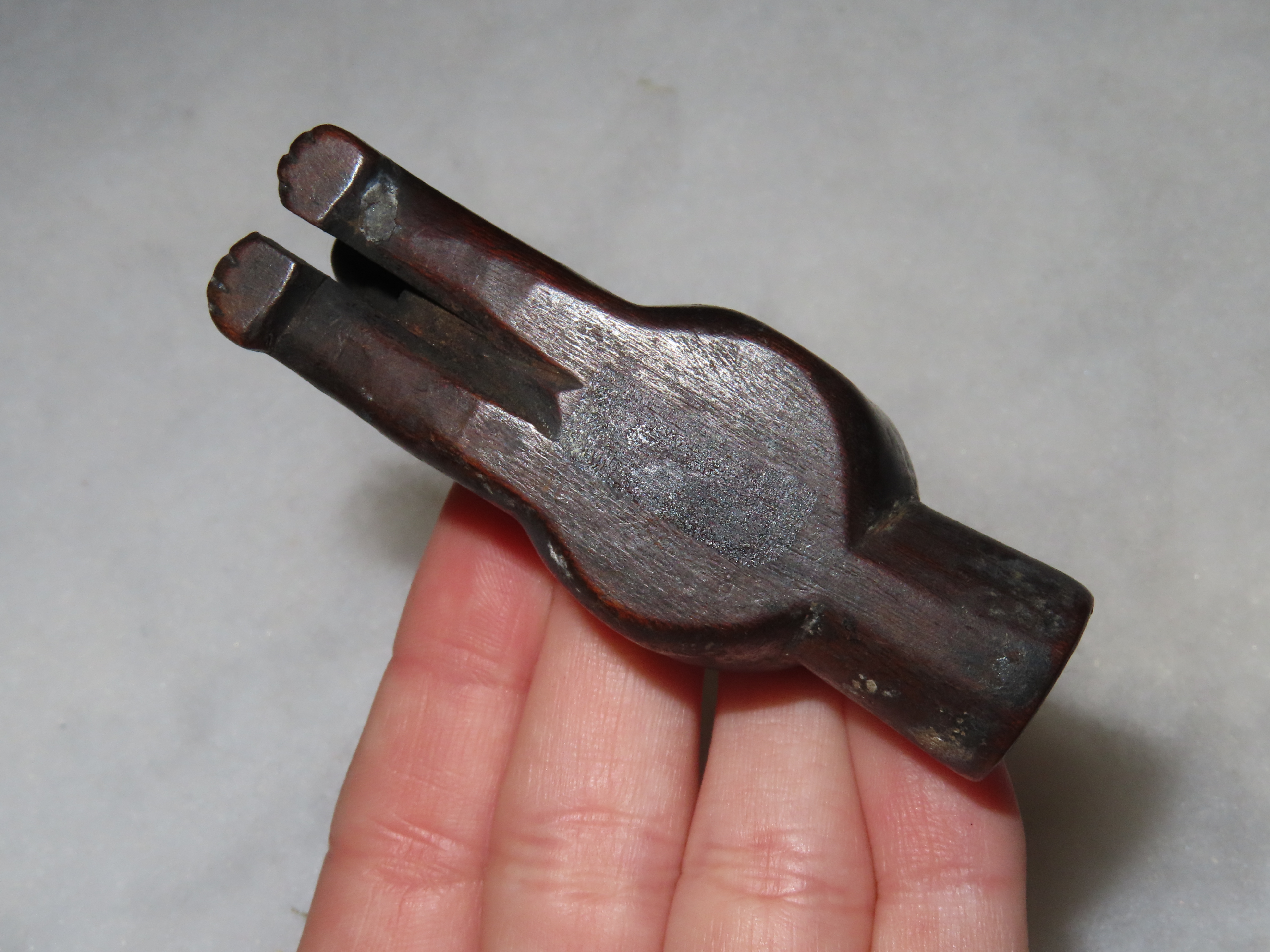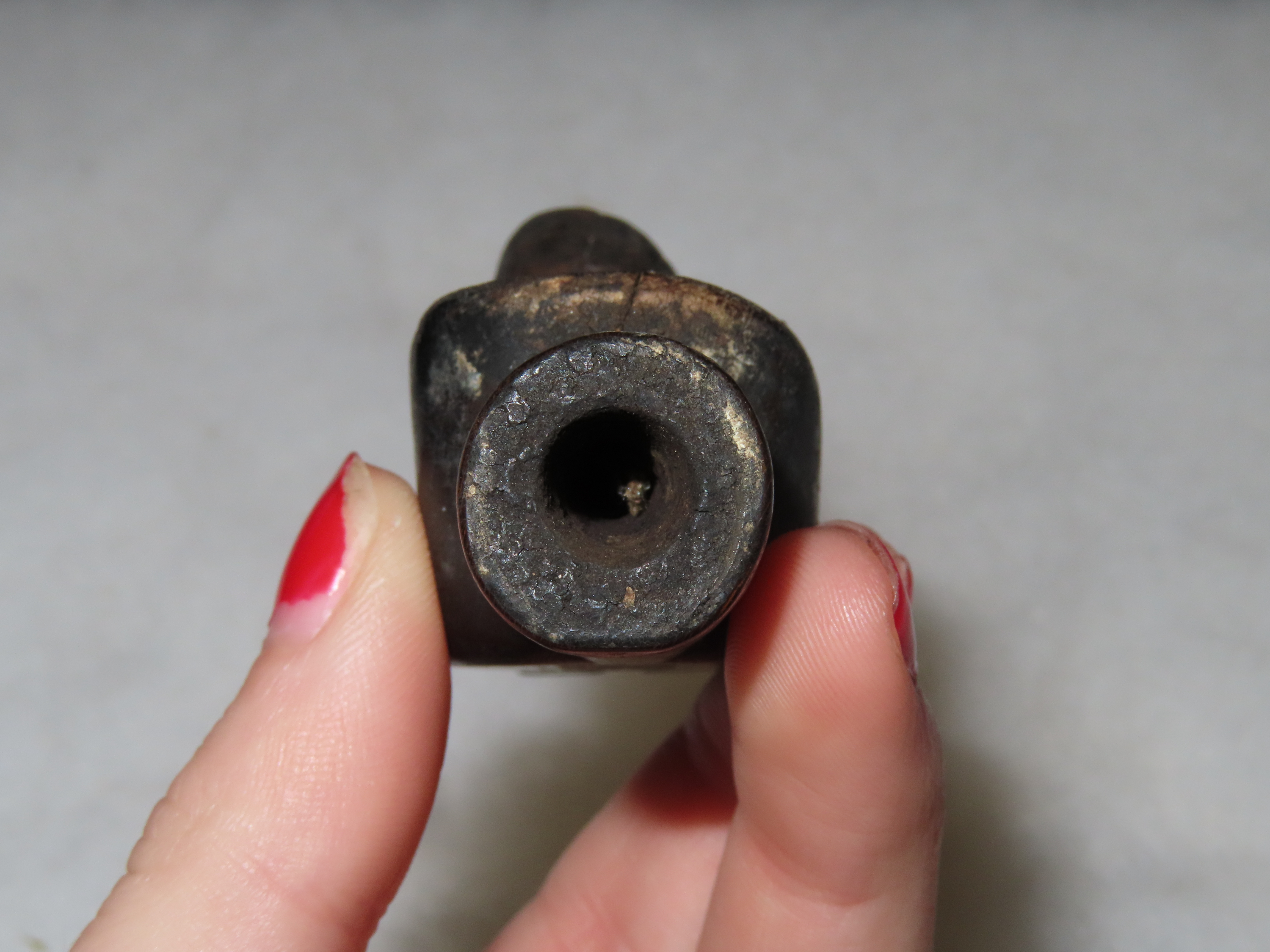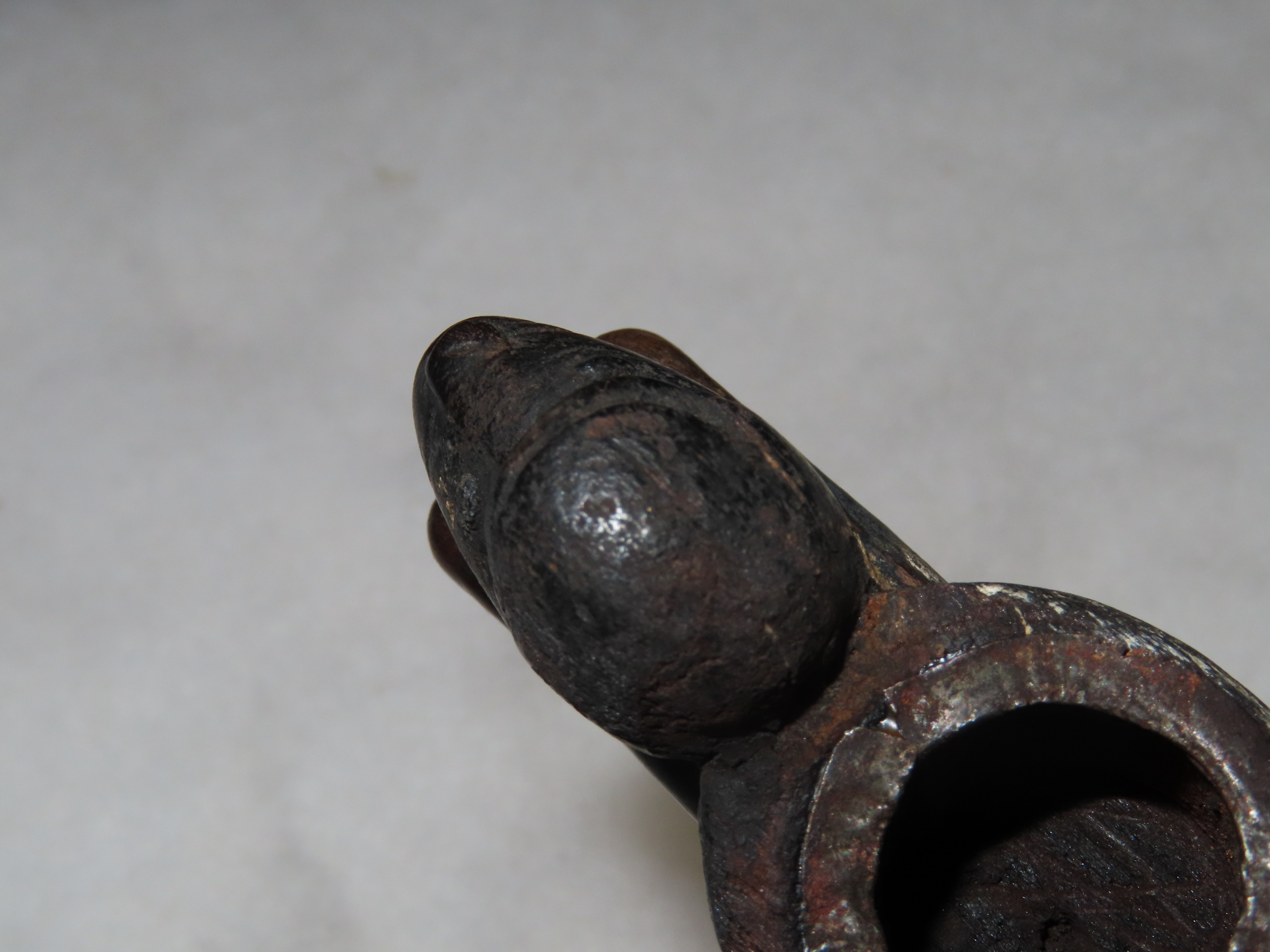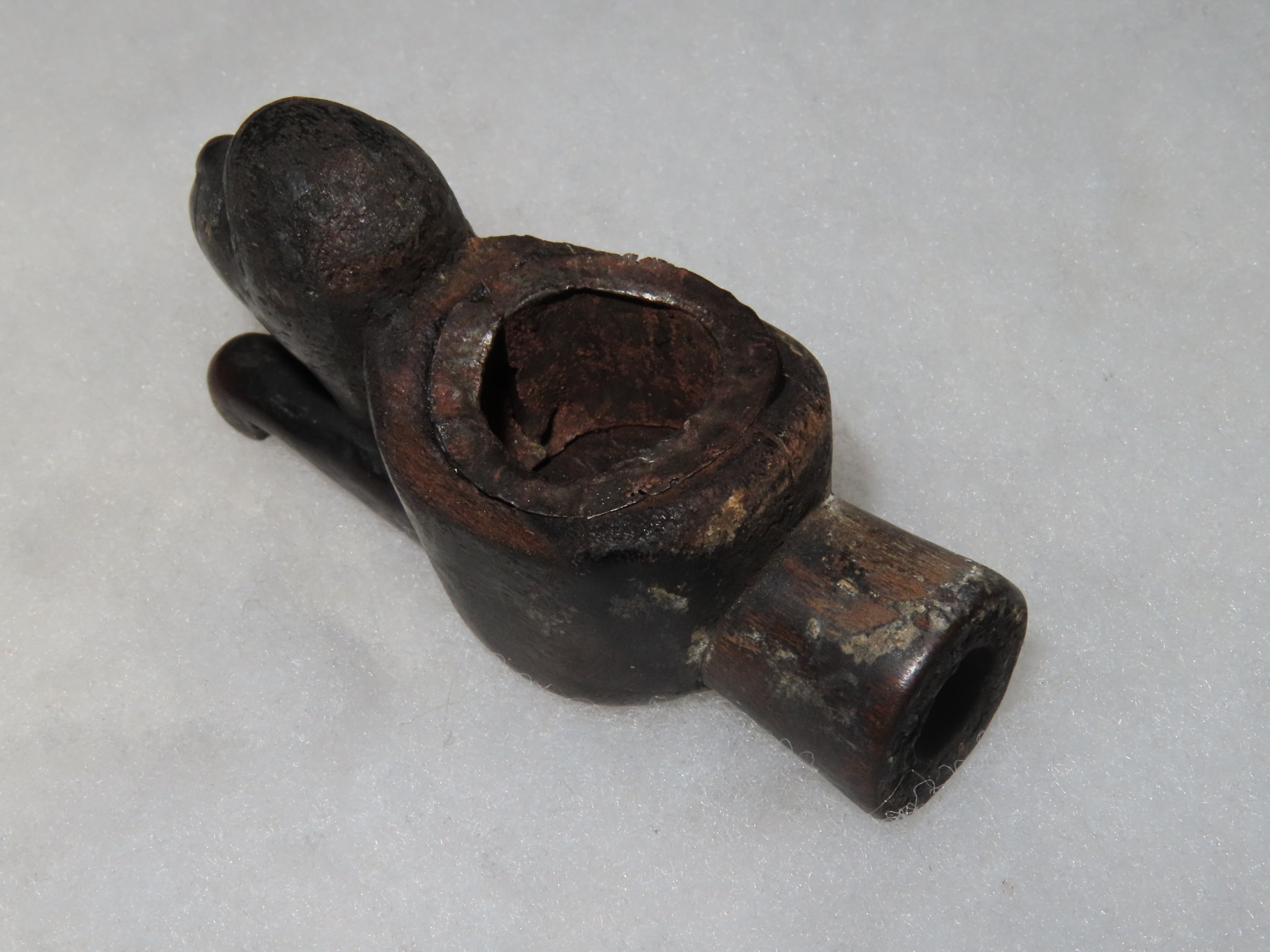 2 3/4″ Animal Effigy Pipe, Northern Plains, Motley COA. Rare Historic Example made from wood with a metal insert in the bowl. Heavy age & patina. Very neat old pipe!