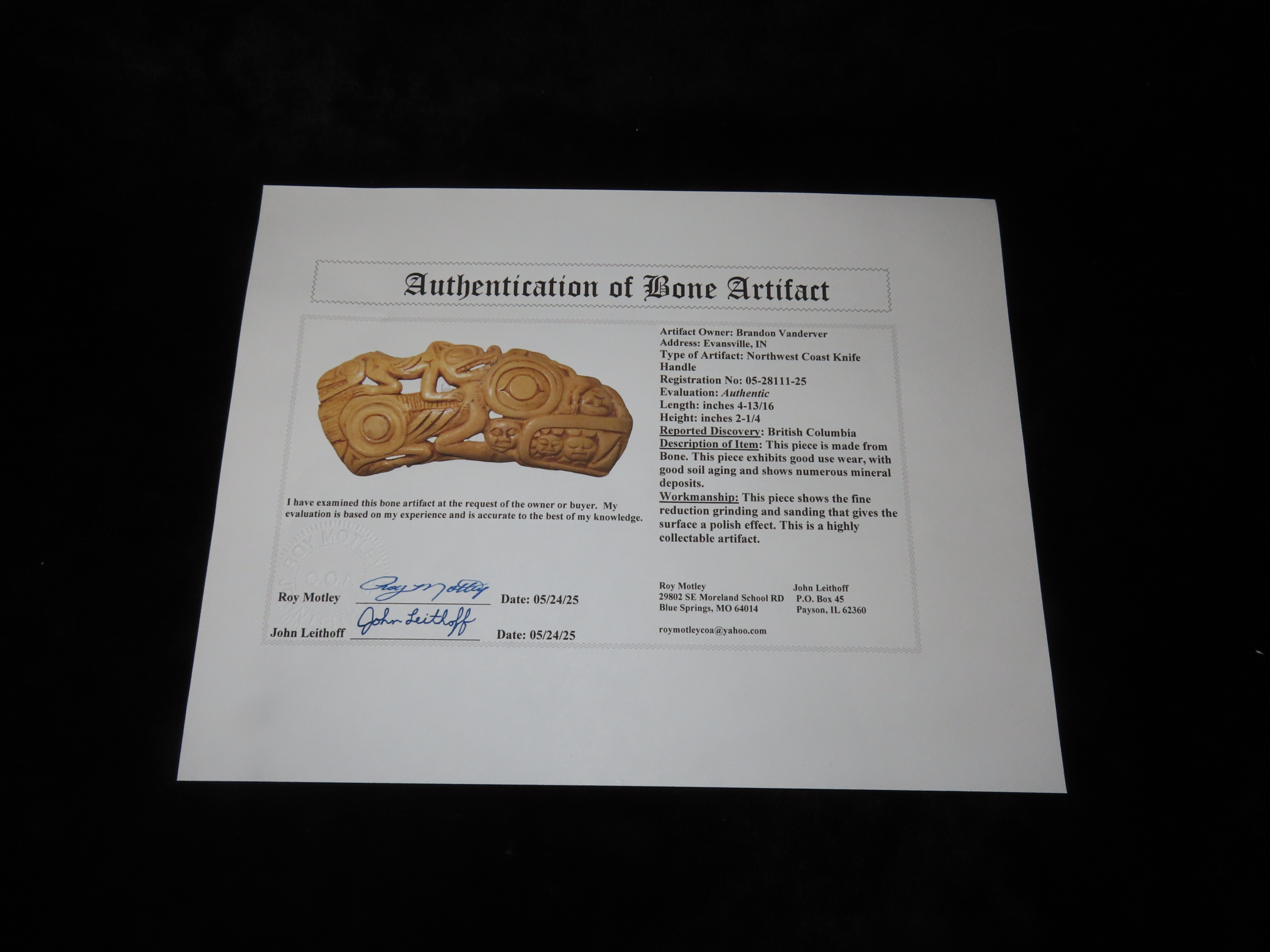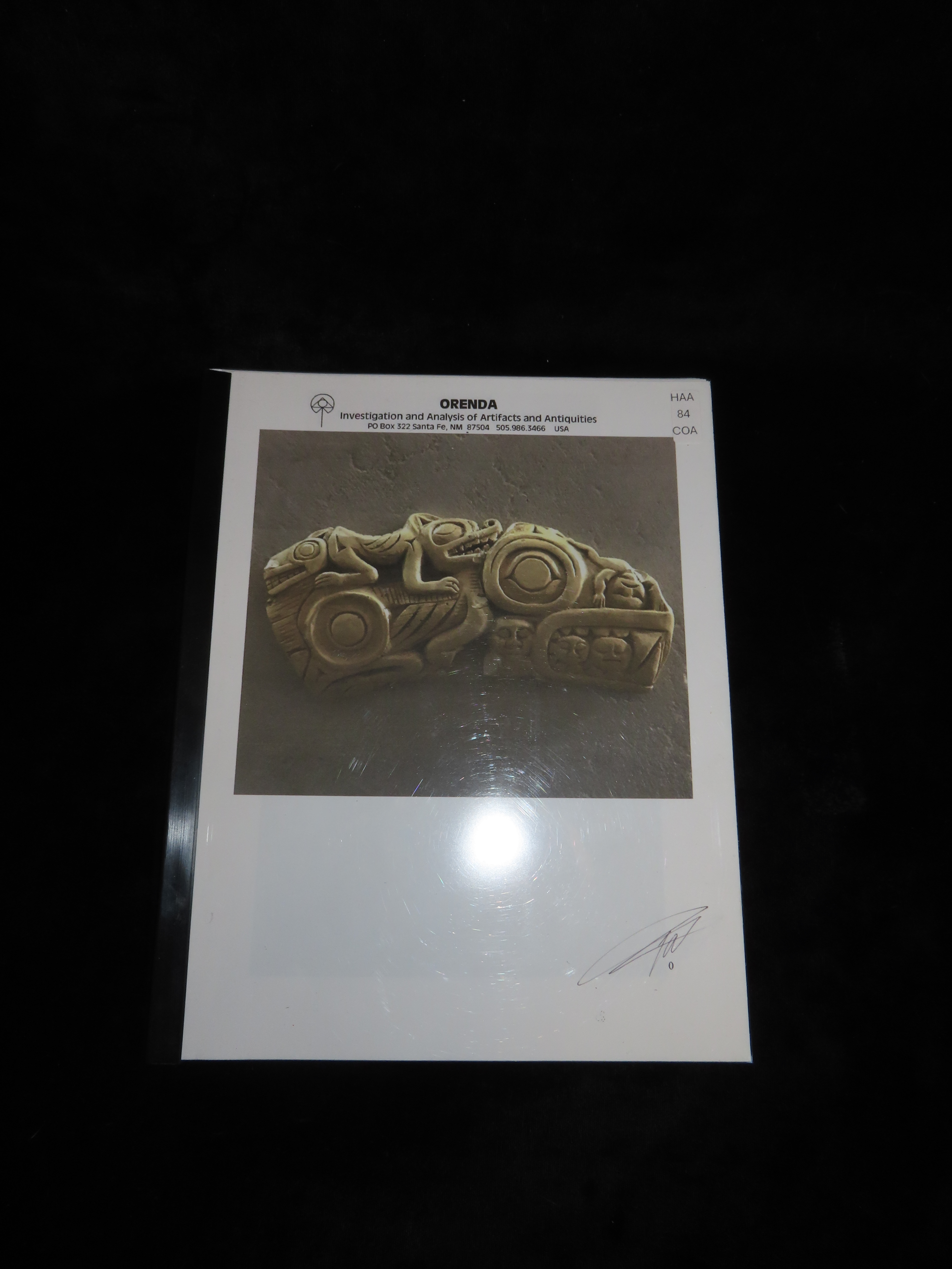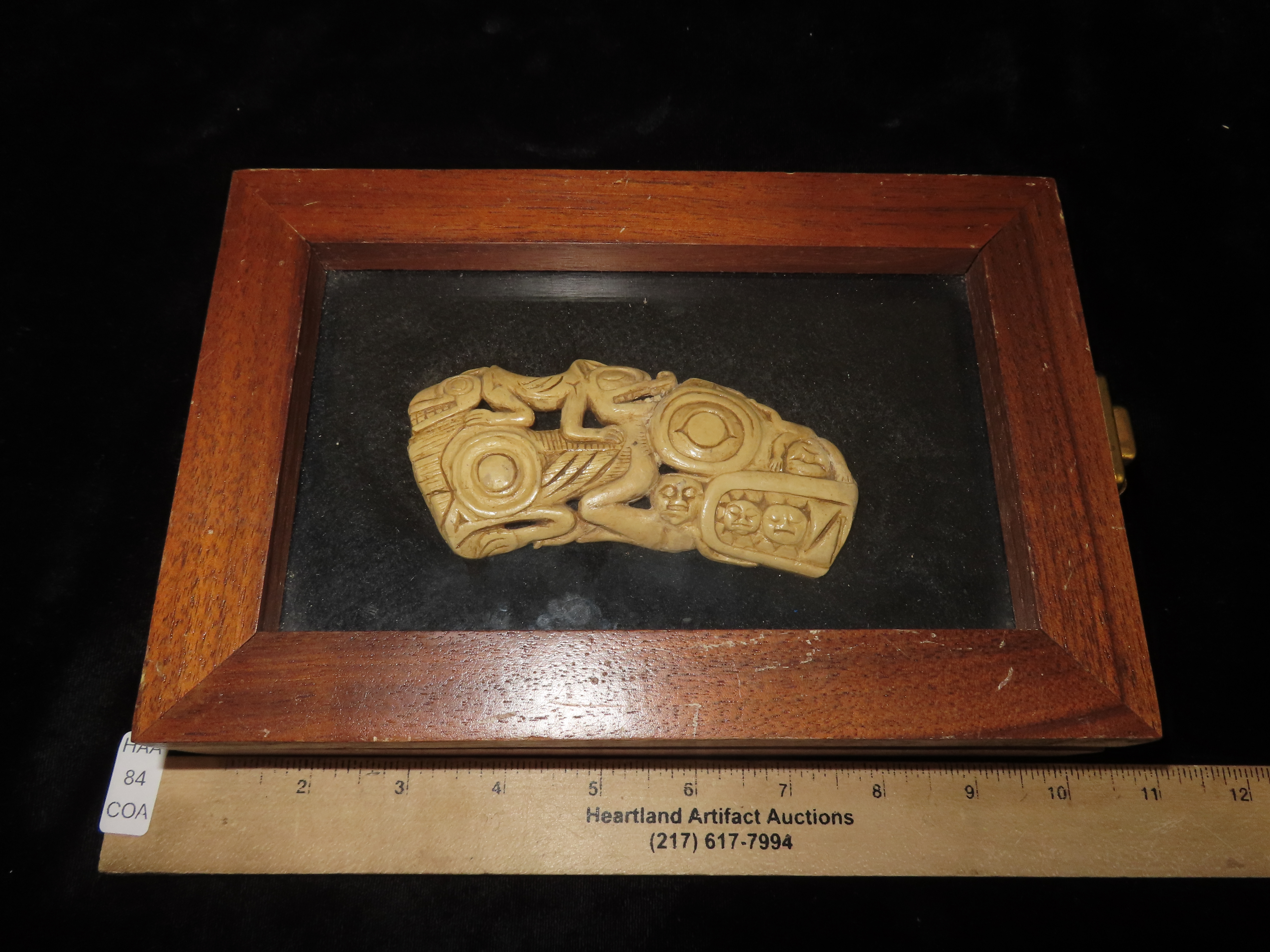 Extremely Rare Northwest Coast Effigy Knife Handle, British Columbia. Motley COA & Orenda Analysis Report. Ancient Haida Engraved Effigy Handle, 1300-1400 C.E.. Very Minor repair to a tiny chip on one end and a small 1/4″ piece in bottom center, before pictures included on the Orenda report.