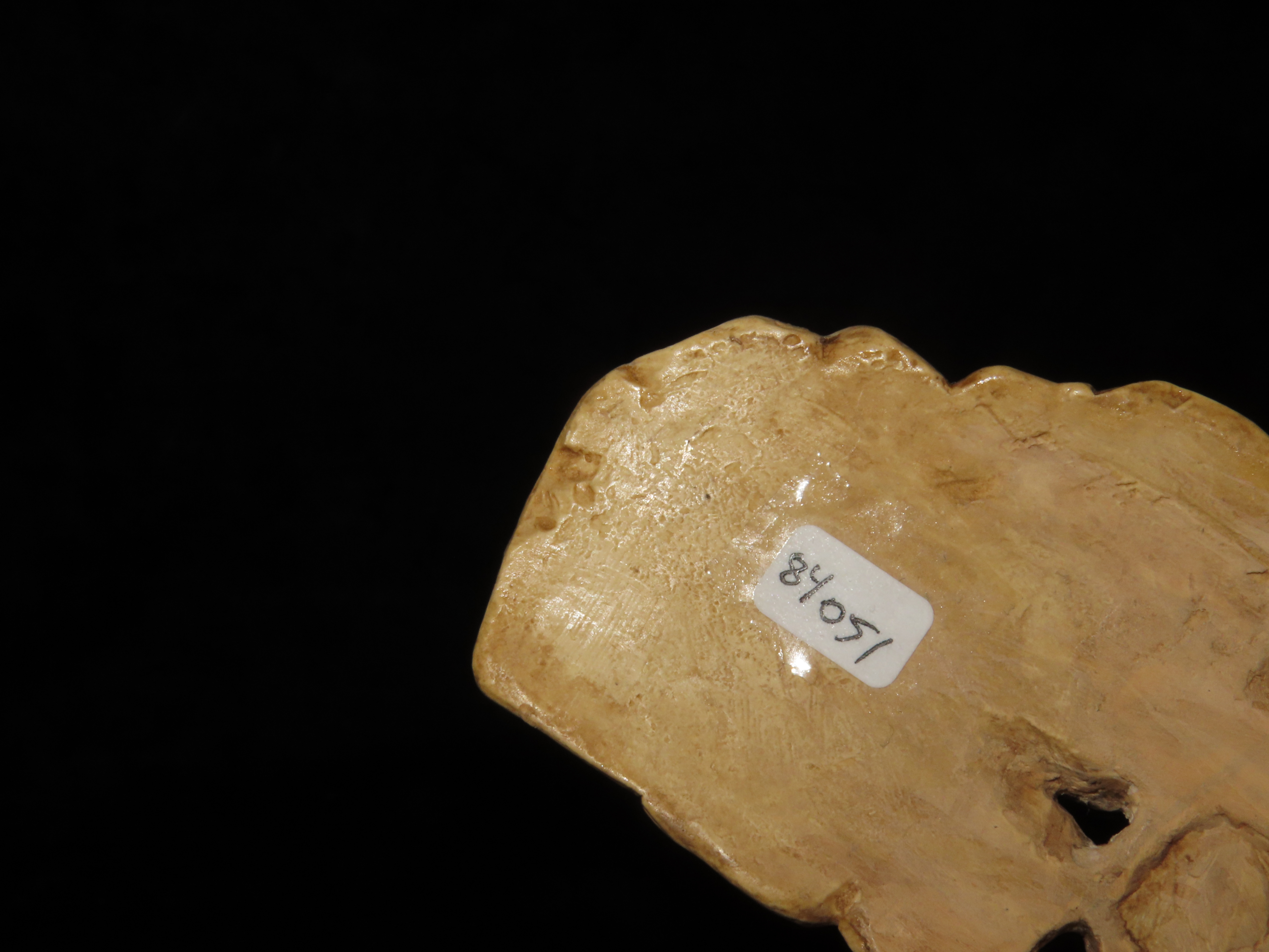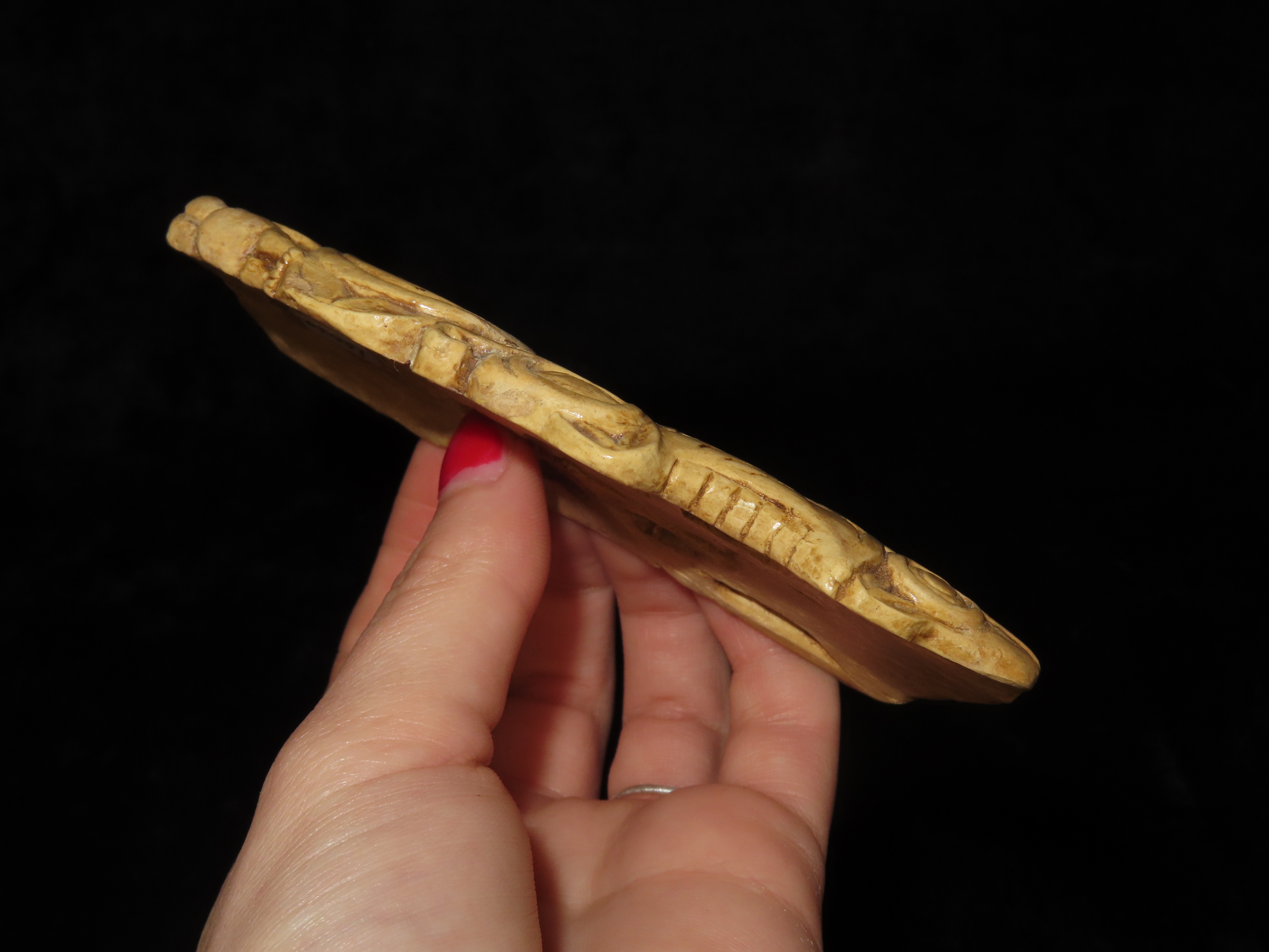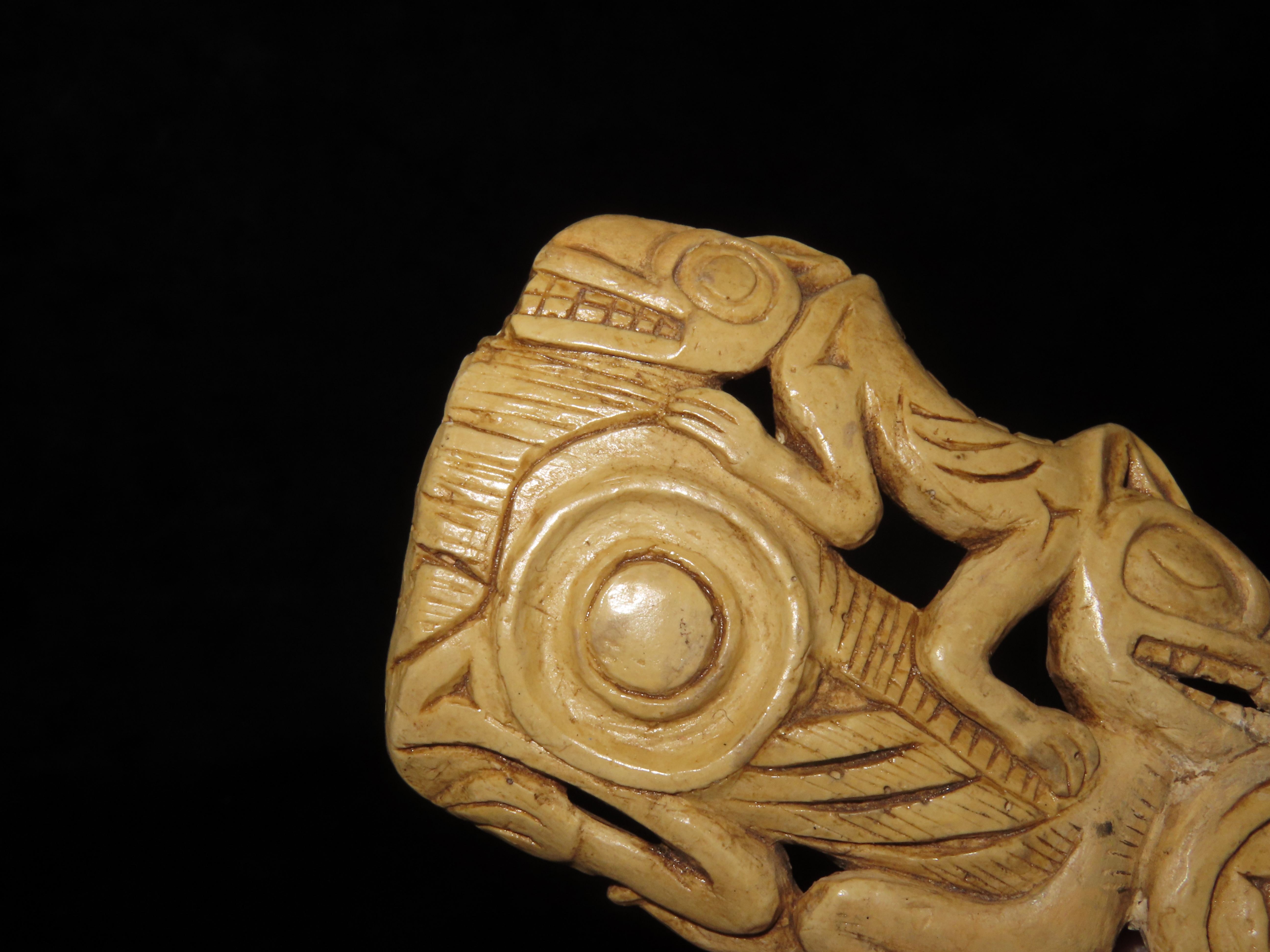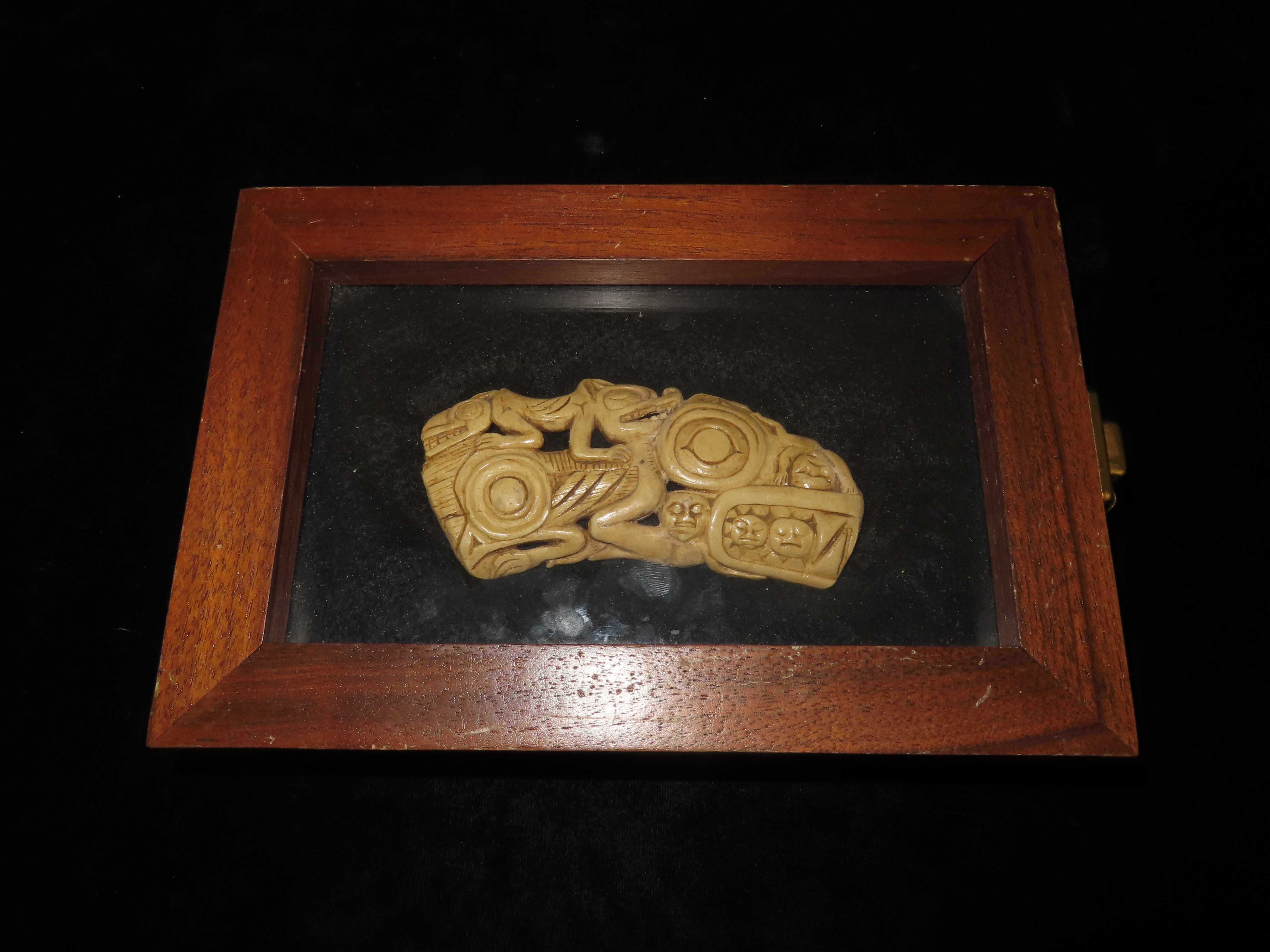 Extremely Rare Northwest Coast Effigy Knife Handle, British Columbia. Motley COA & Orenda Analysis Report. Ancient Haida Engraved Effigy Handle, 1300-1400 C.E.. Very Minor repair to a tiny chip on one end and a small 1/4″ piece in bottom center, before pictures included on the Orenda report.