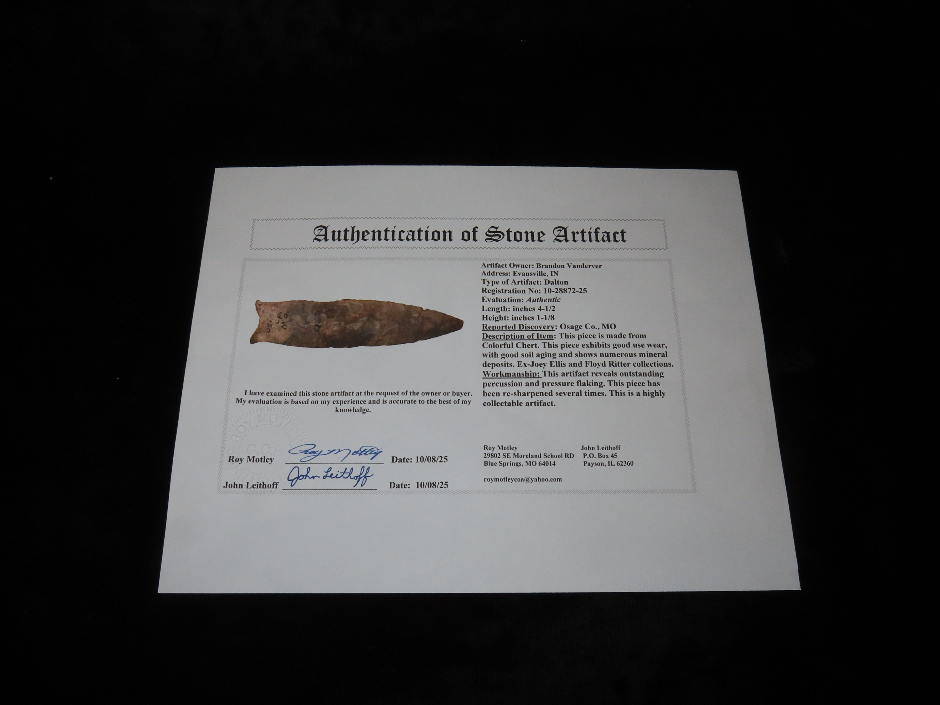 Colorful 4 1/2″ Dalton, Osage Co. Missouri. Motley COA. Ex Floyd Ritter & Joey Ellis Collections. Super thin with Great color!