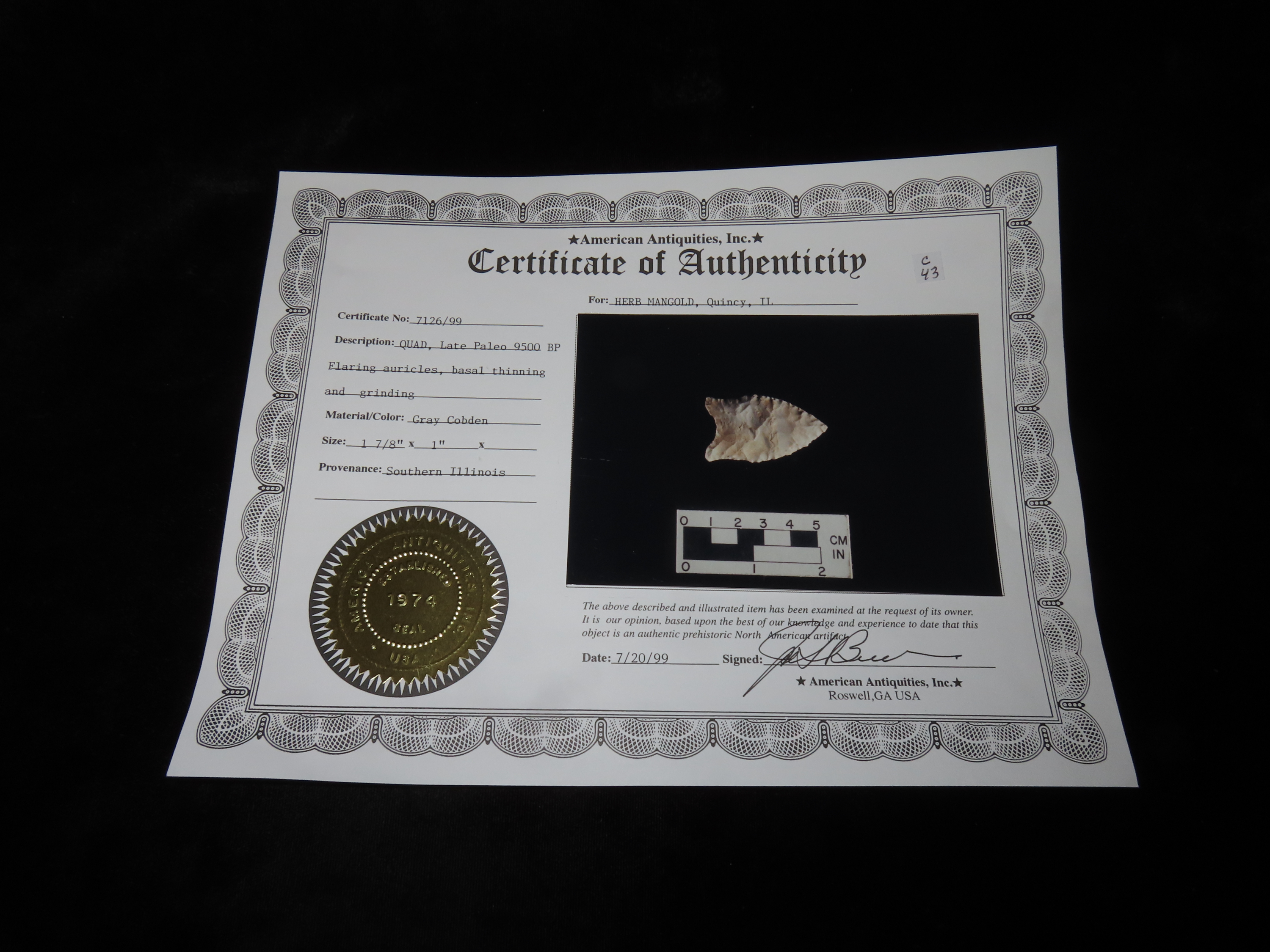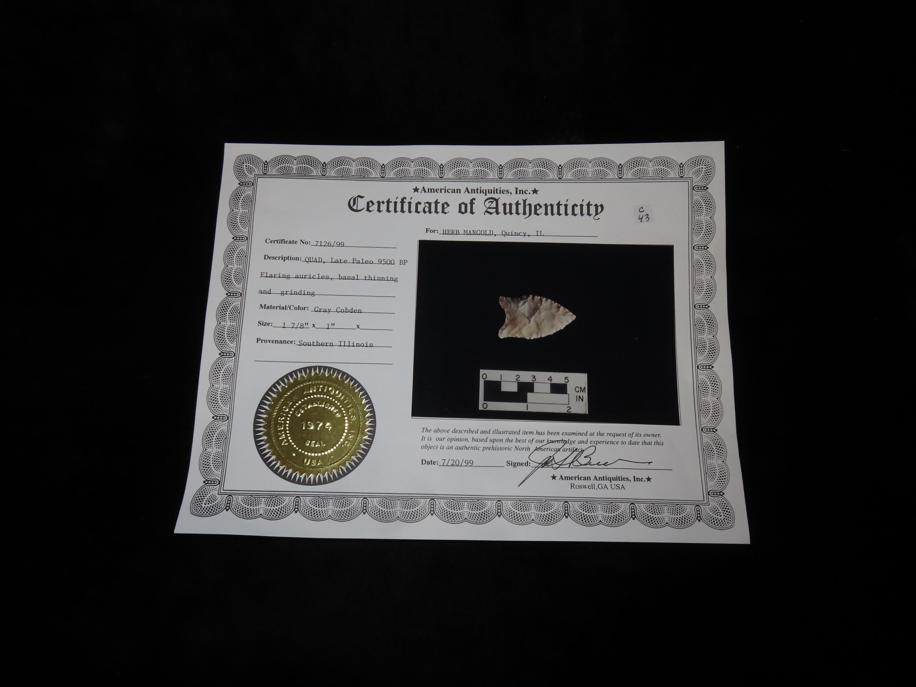 1 7/8" x 1" Quad. Late Paleo. 9,500 BP. Gray Cobden. Southern IL. American Antiquities COA, Ex. Herbert Mangold Collection