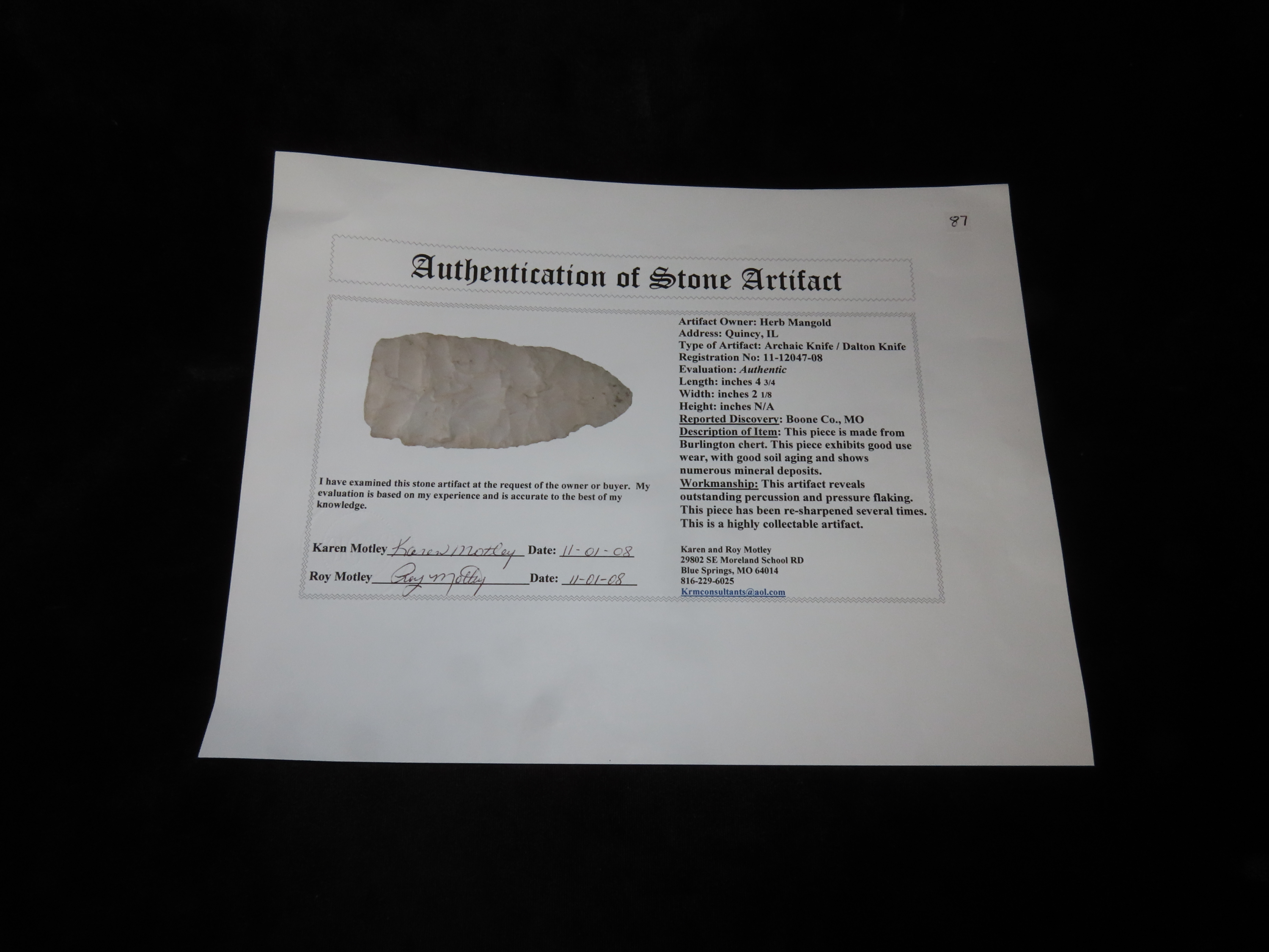 4 3/4" x 2 1/8" Archaic / Dalton Knife, Found in Boone Co. Missouri, Ex. Herbert Mangold Collection
