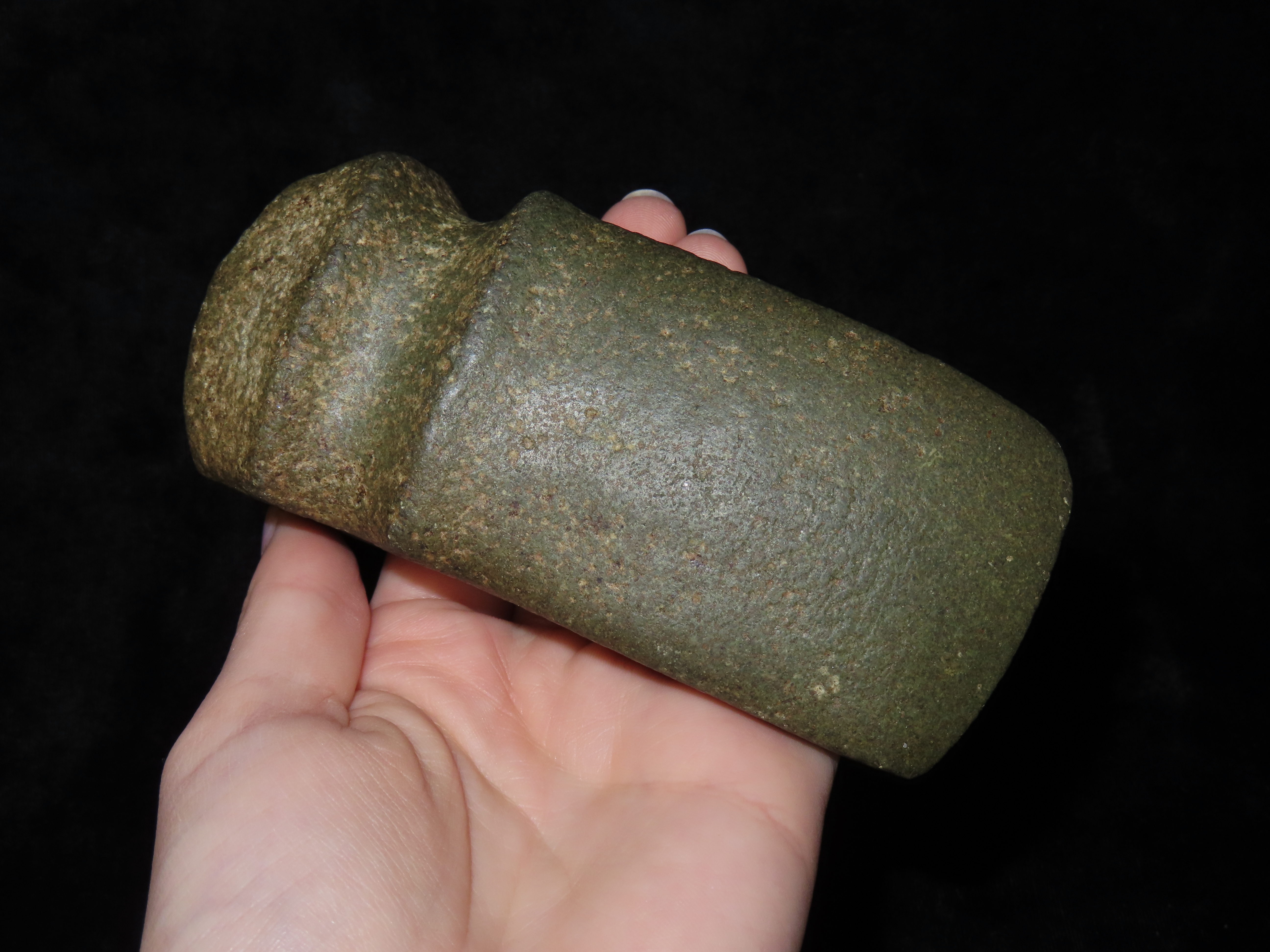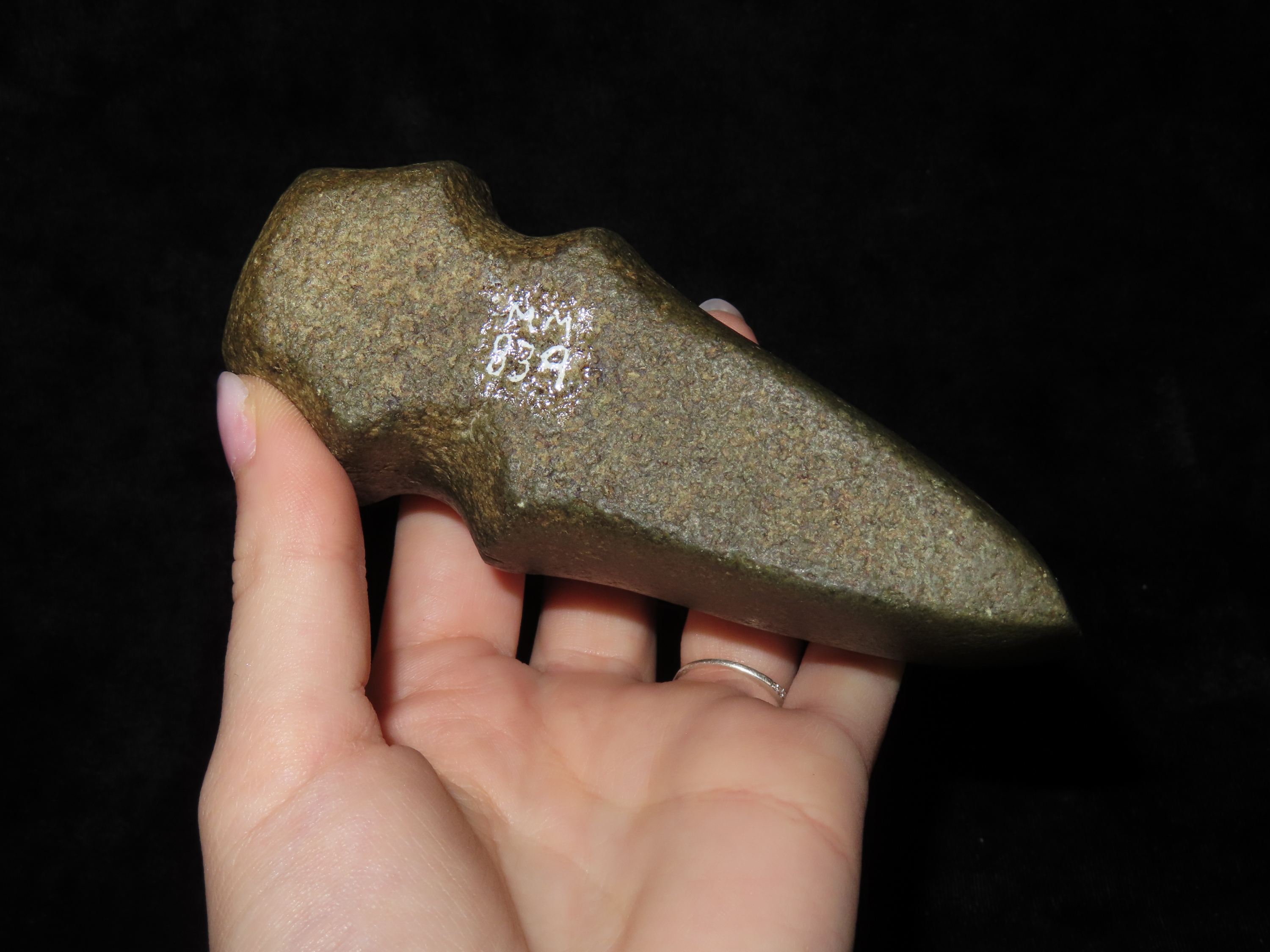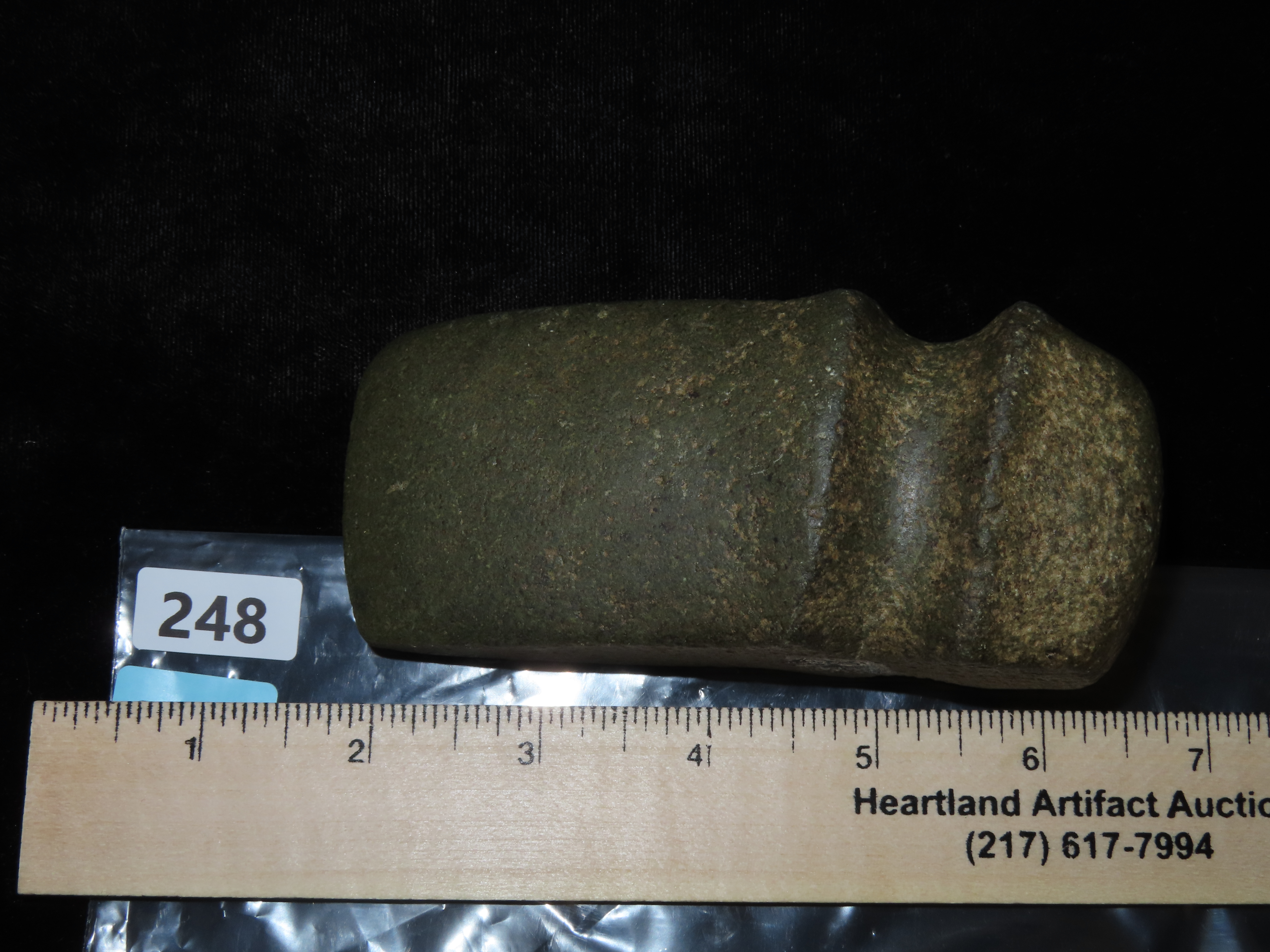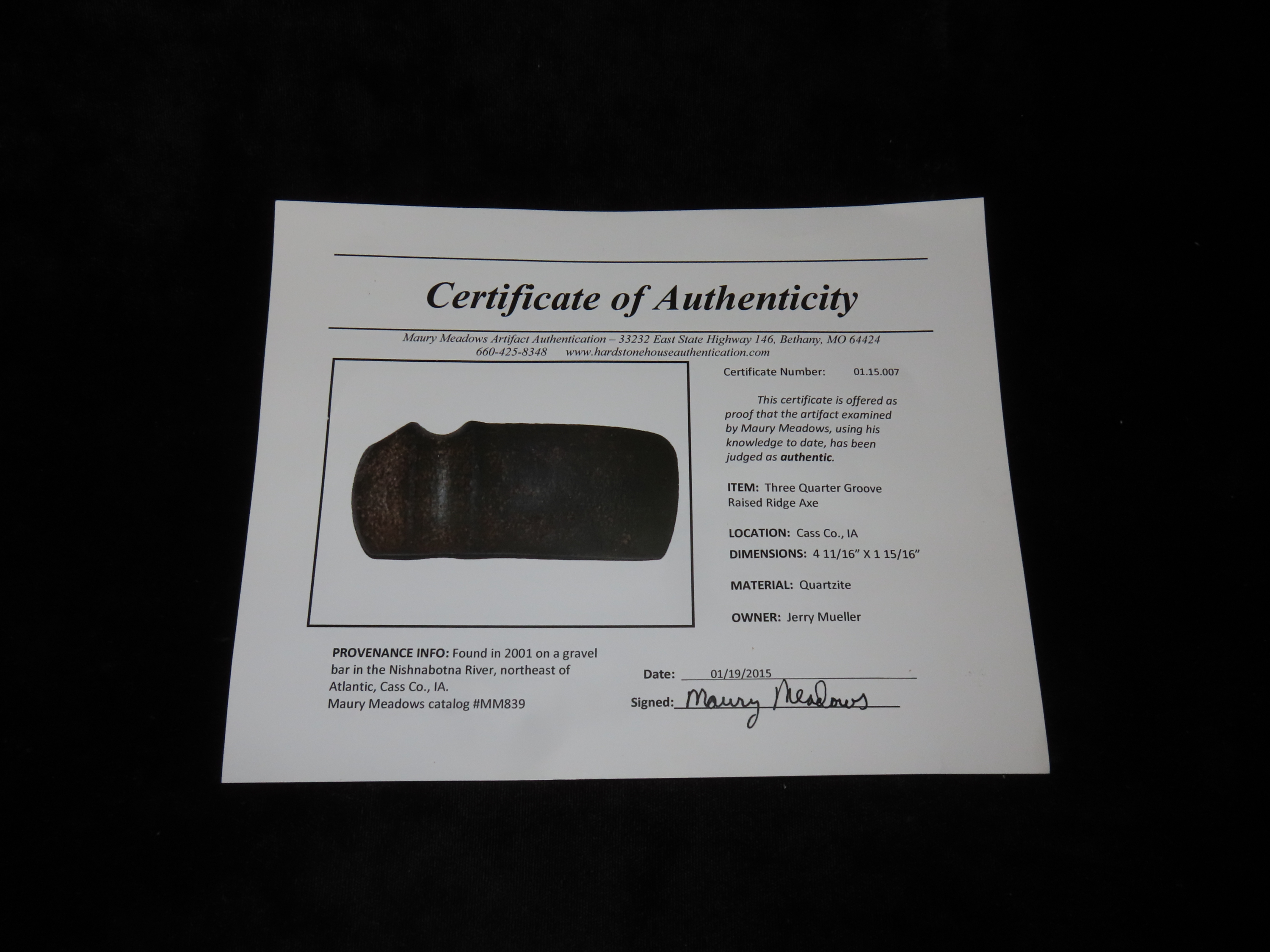 4 11/16″ x 1 15/16″ Three Quarter Groove Raised Ridge Axe made of Quartzite, Meadows COA, Found in Cass Co, IA., Ex Maury Meadows