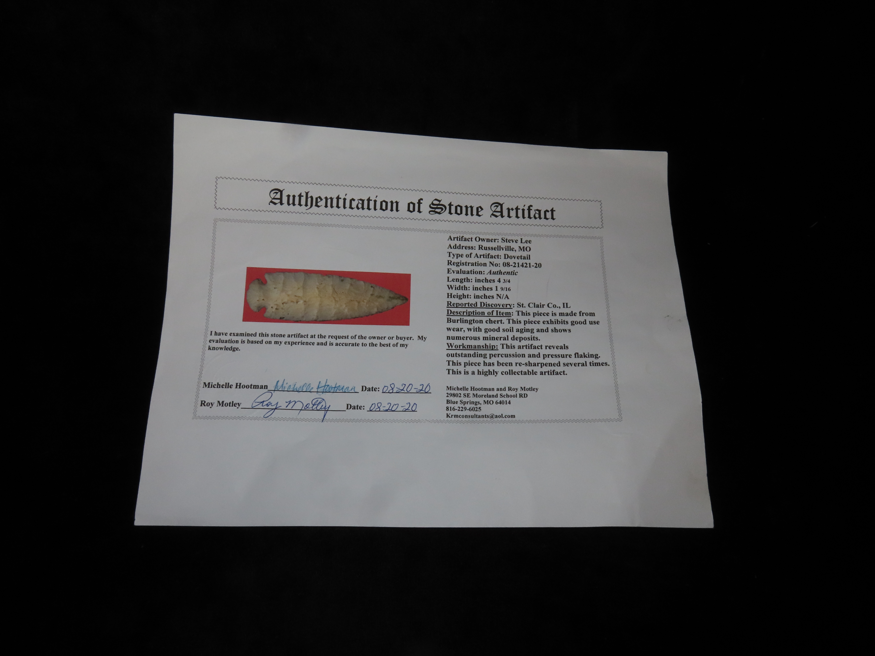 4 3/4" x 1 9/16" Dovetail Made of Burlington Chert, Motley COA, Found in St. Clair Co, IL.
