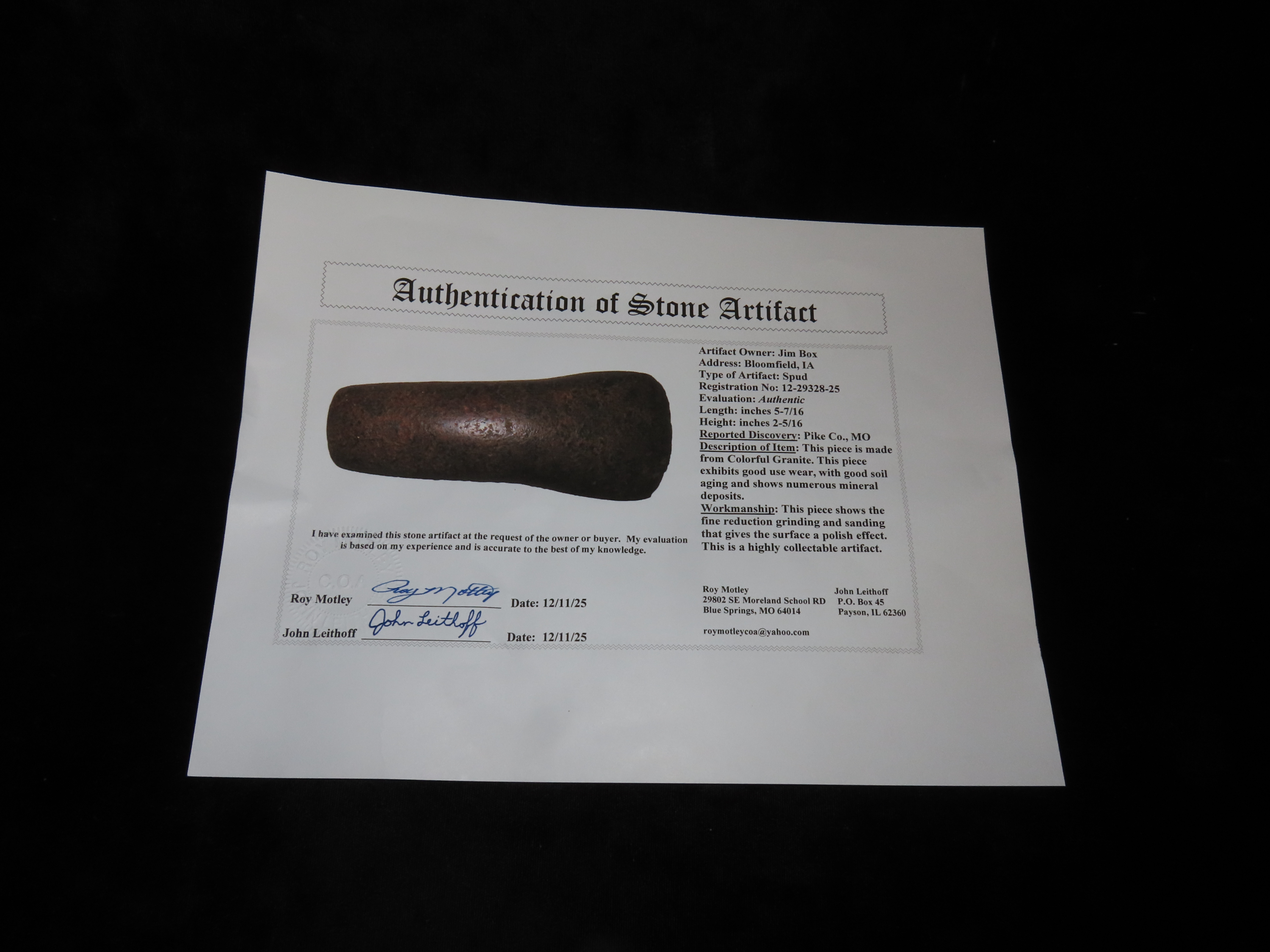 5 7/16″ x 2 5/16″ Spud, Made of Colorful Granite, Motley / Leithoff COA, Pike Co, MO.
