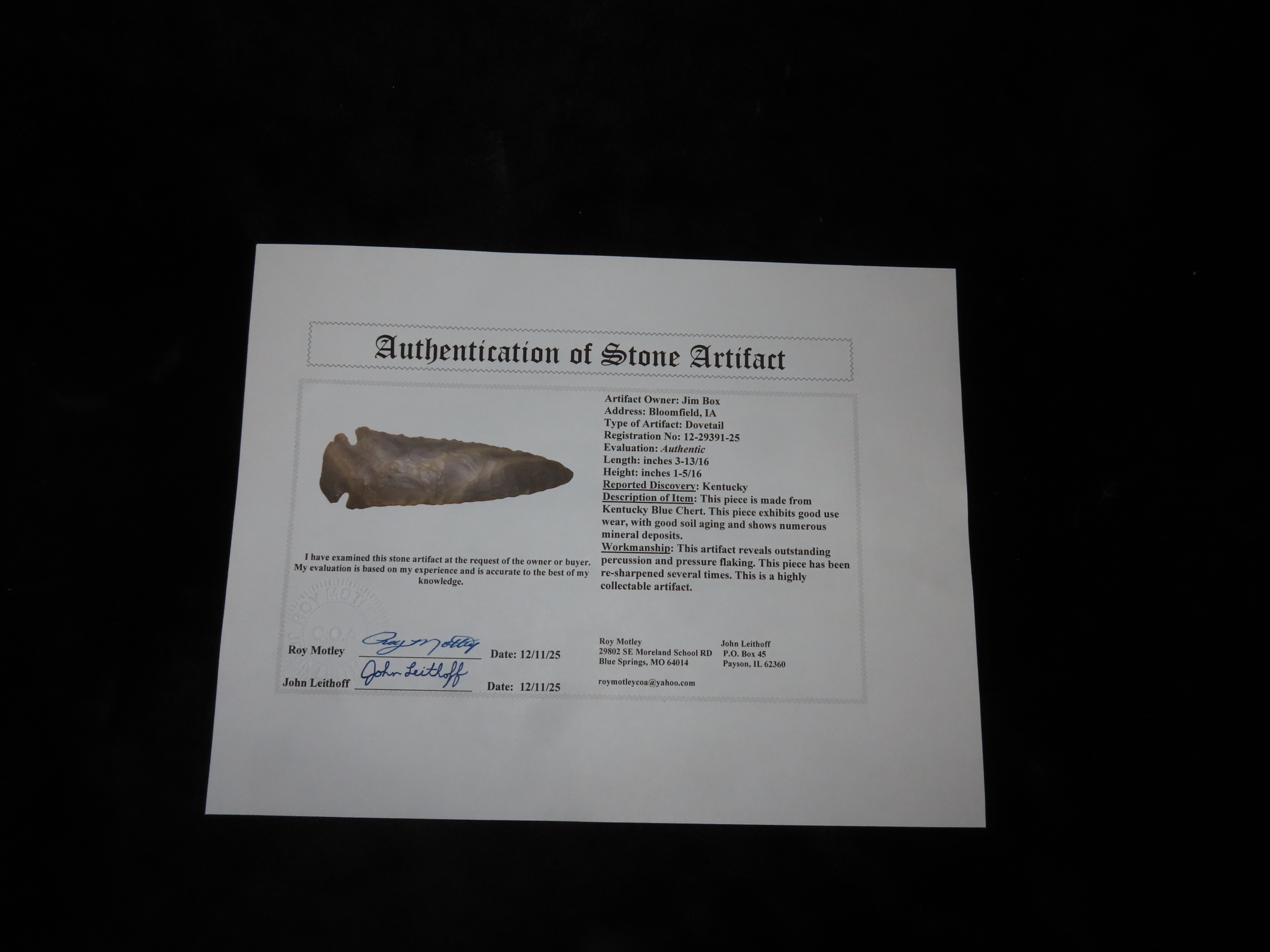 3 13/16″ x 1 5/16″ Dovetail, Motley / Leithoff COA, Made of Kentucky Blue Chert, Kentucky