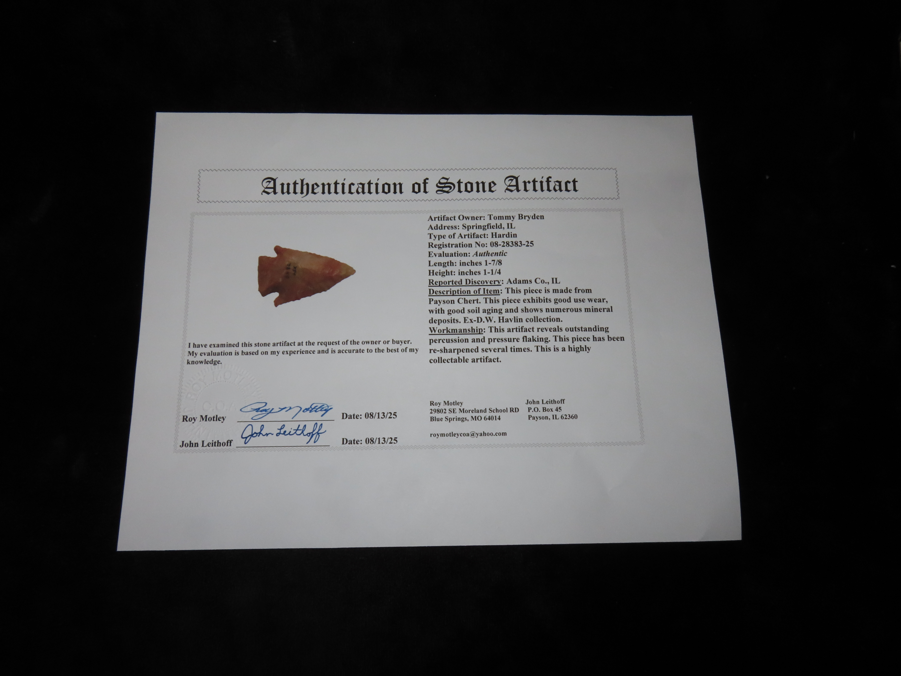 1 7/8″ Hardin, Motley / Leithoff COA, Adams County, IL, Payson Chert, Ex. D.W. Havlin Collection
