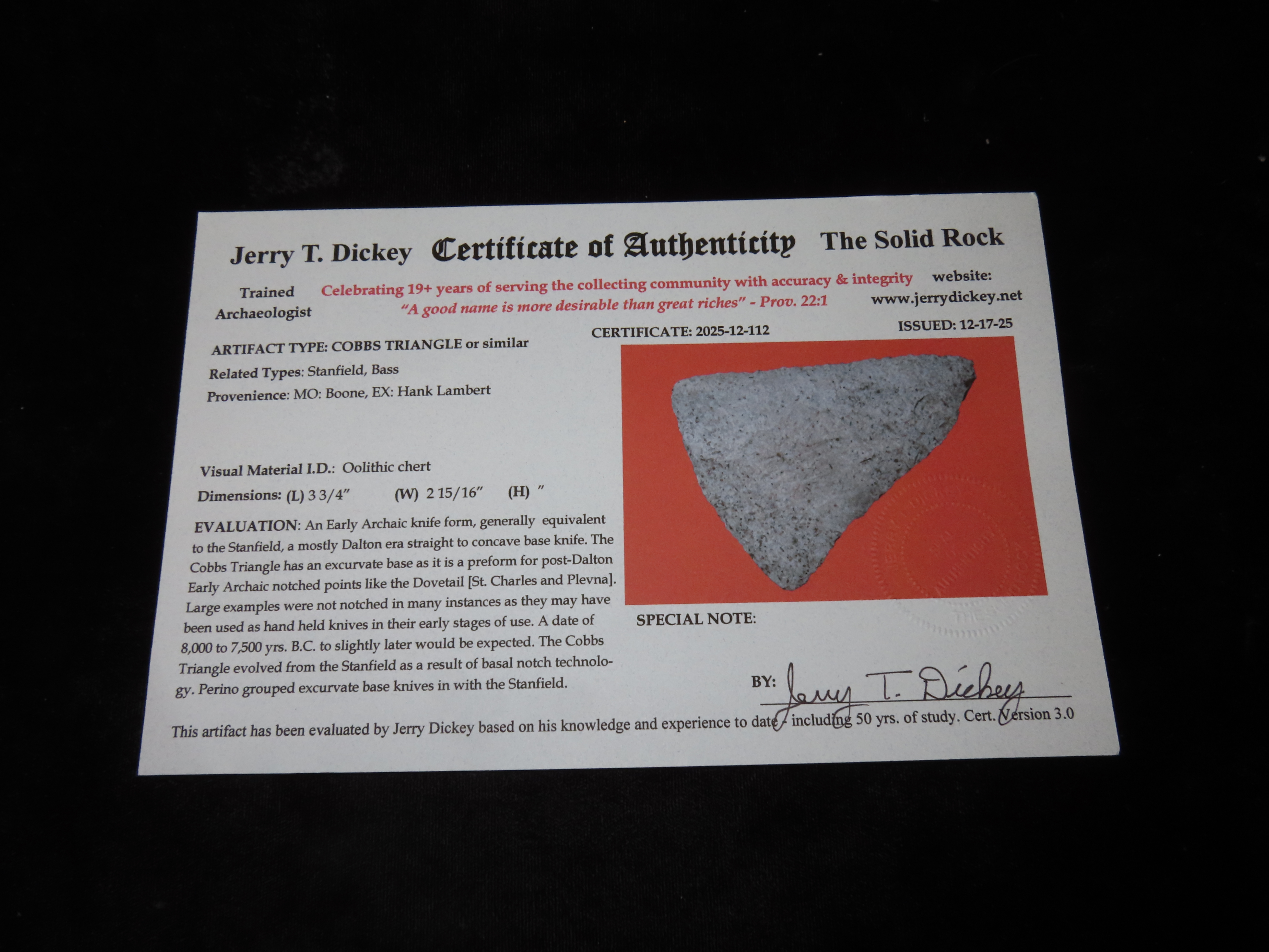 3 3/4″ Cobbs Triangle, Dickey COA, Boone County, MO, Dolomitic Chert, Ex. Hank Lambert Collection