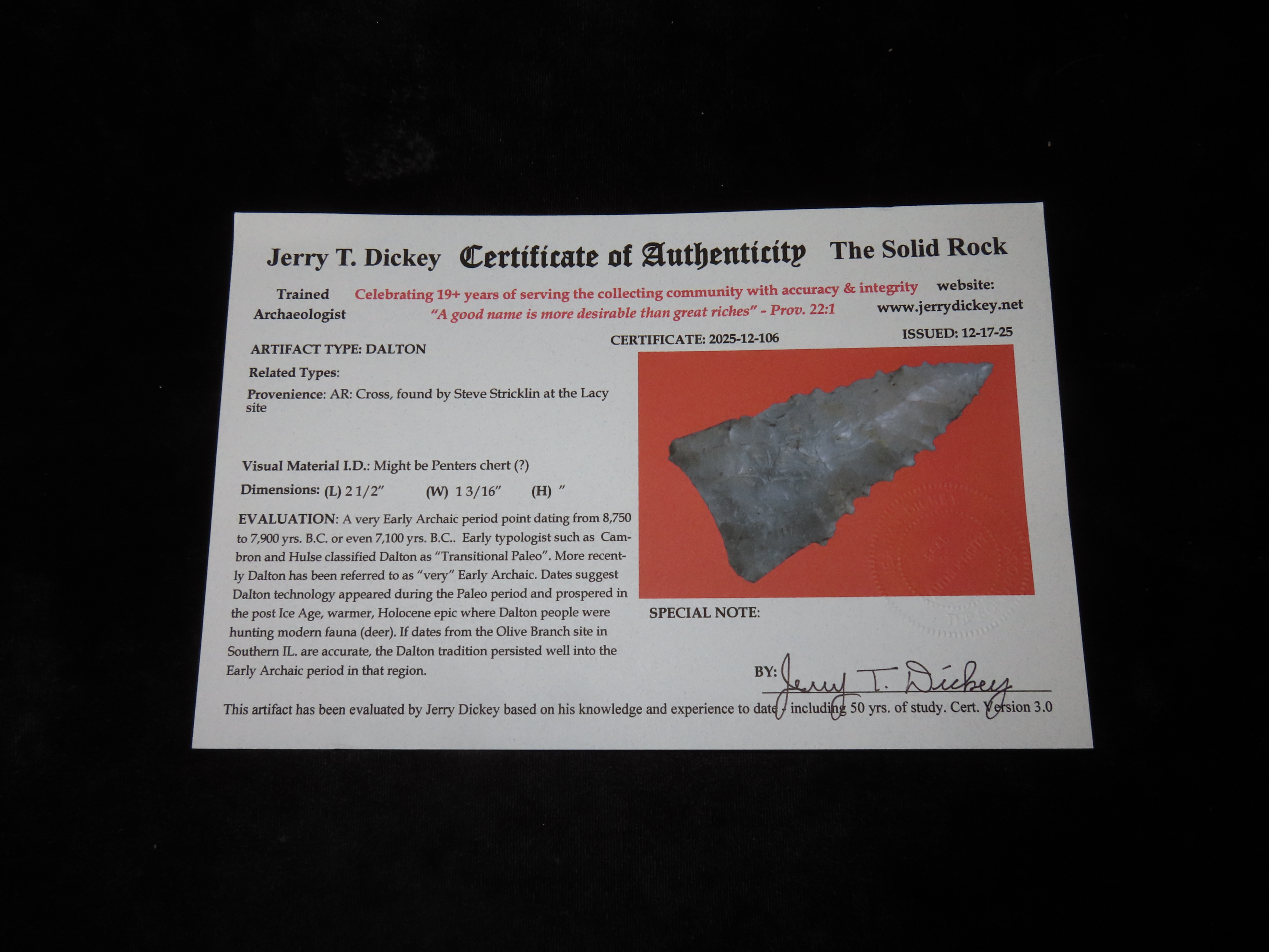 2 1/2″ Cockie Burr Dalton, Dickey COA, Cross County, Arkansas, Penters Chert, Found by Steve Strickin at the Lacy Site