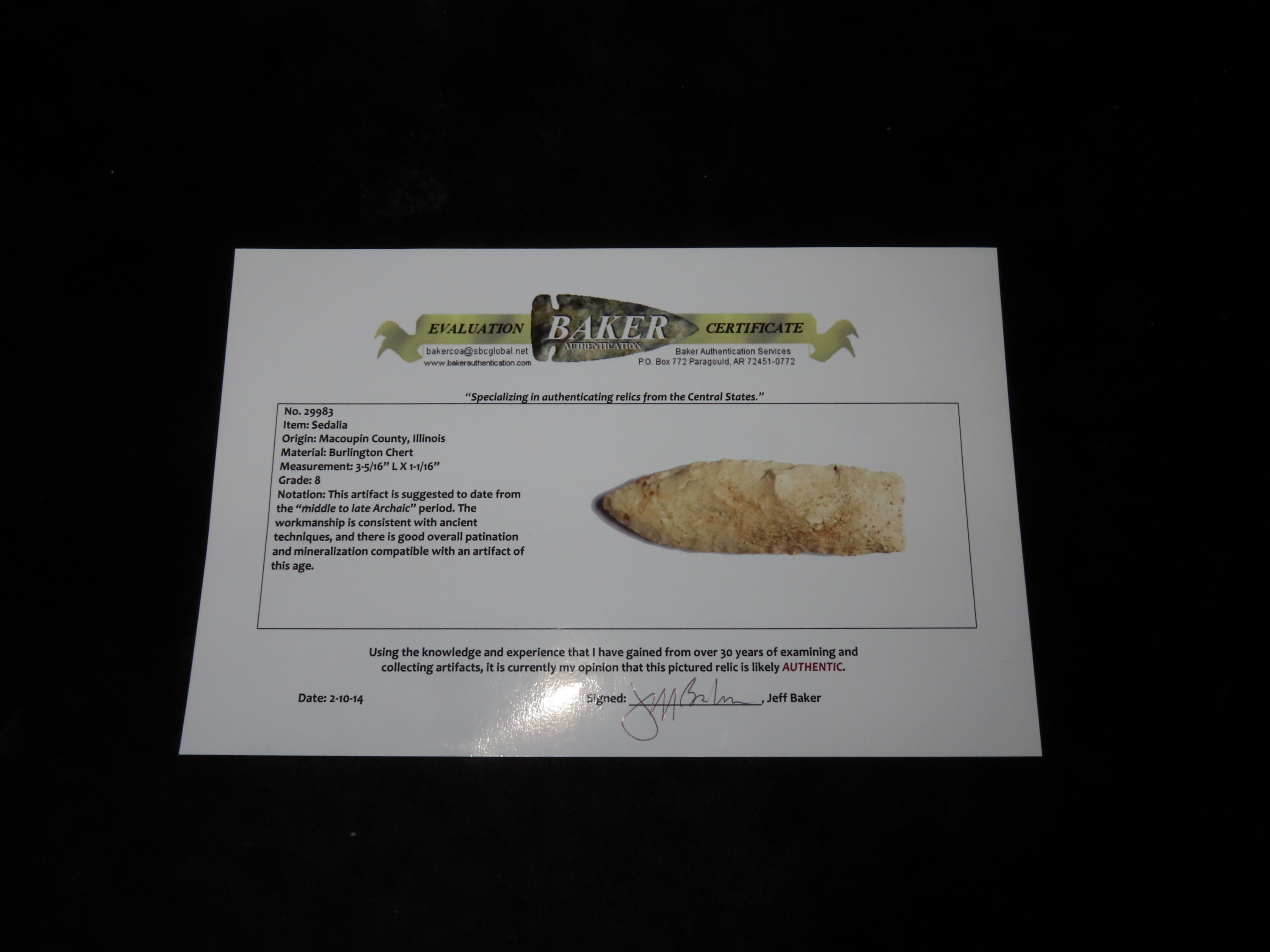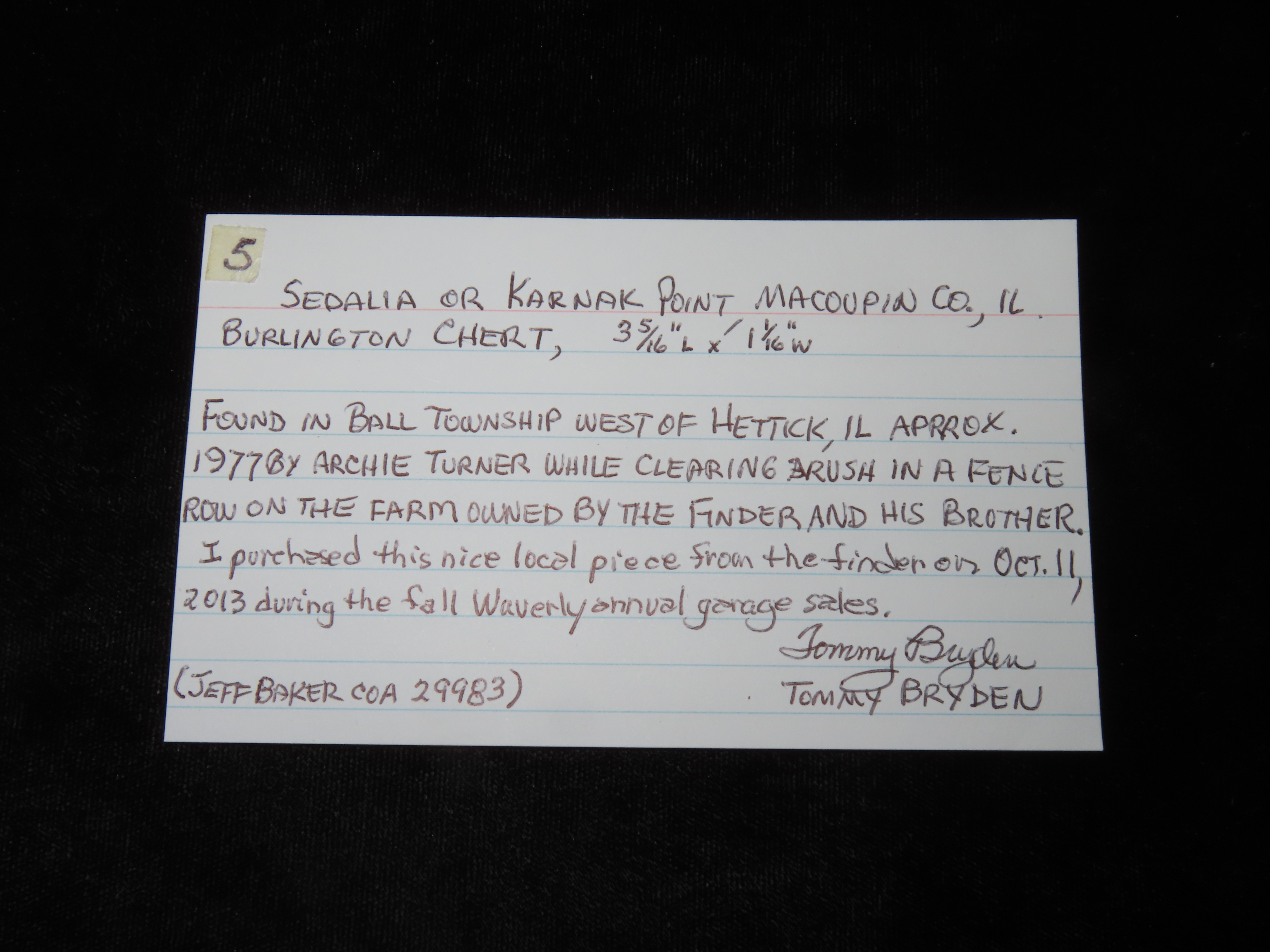 3 5/16″ Sedalia, Macoupin County, IL, Found west of Hettick, IL, Made of Burlington, Found by Archie Turner, Jeff Baker COA, Ex Tommy Bryden