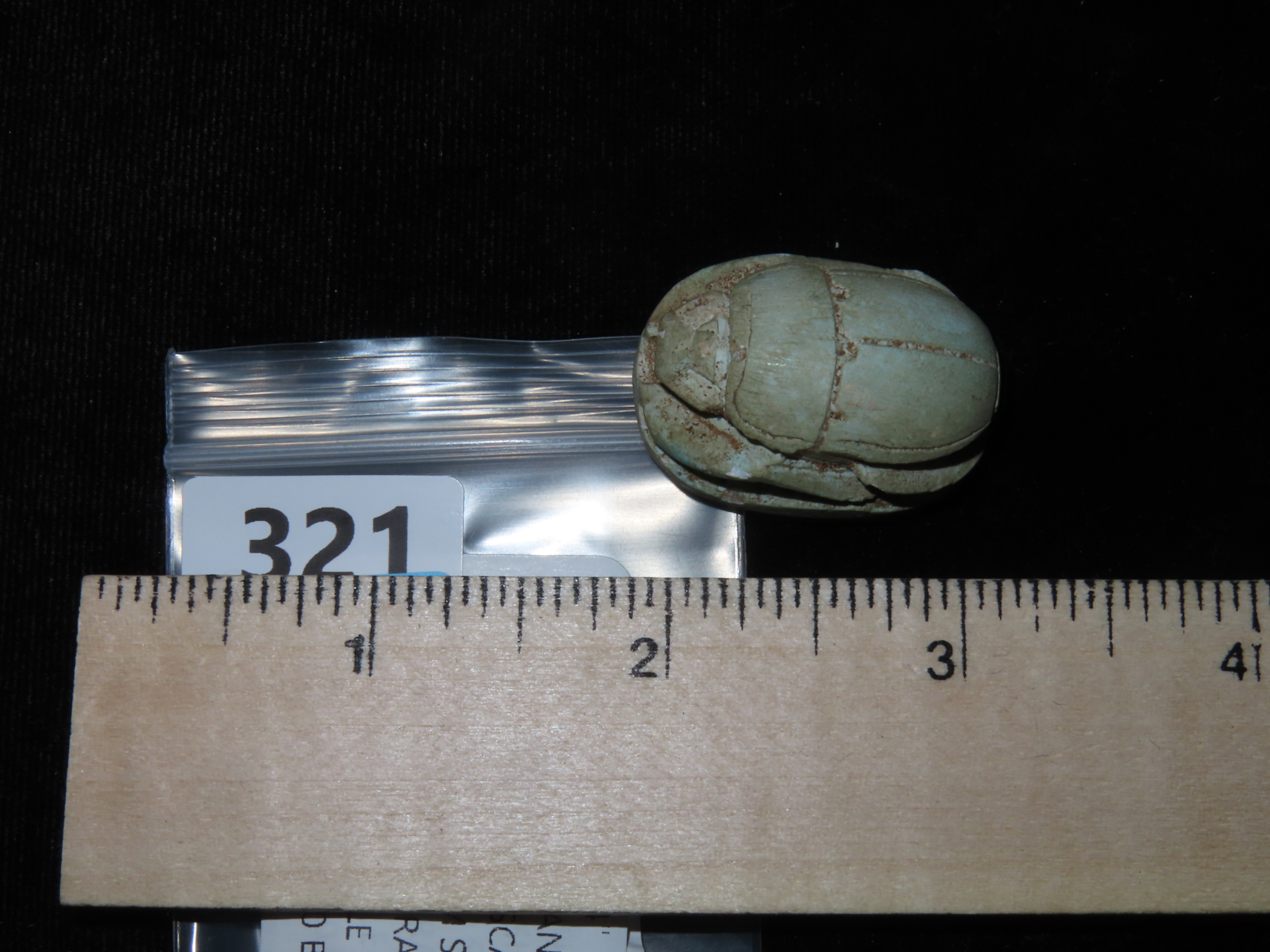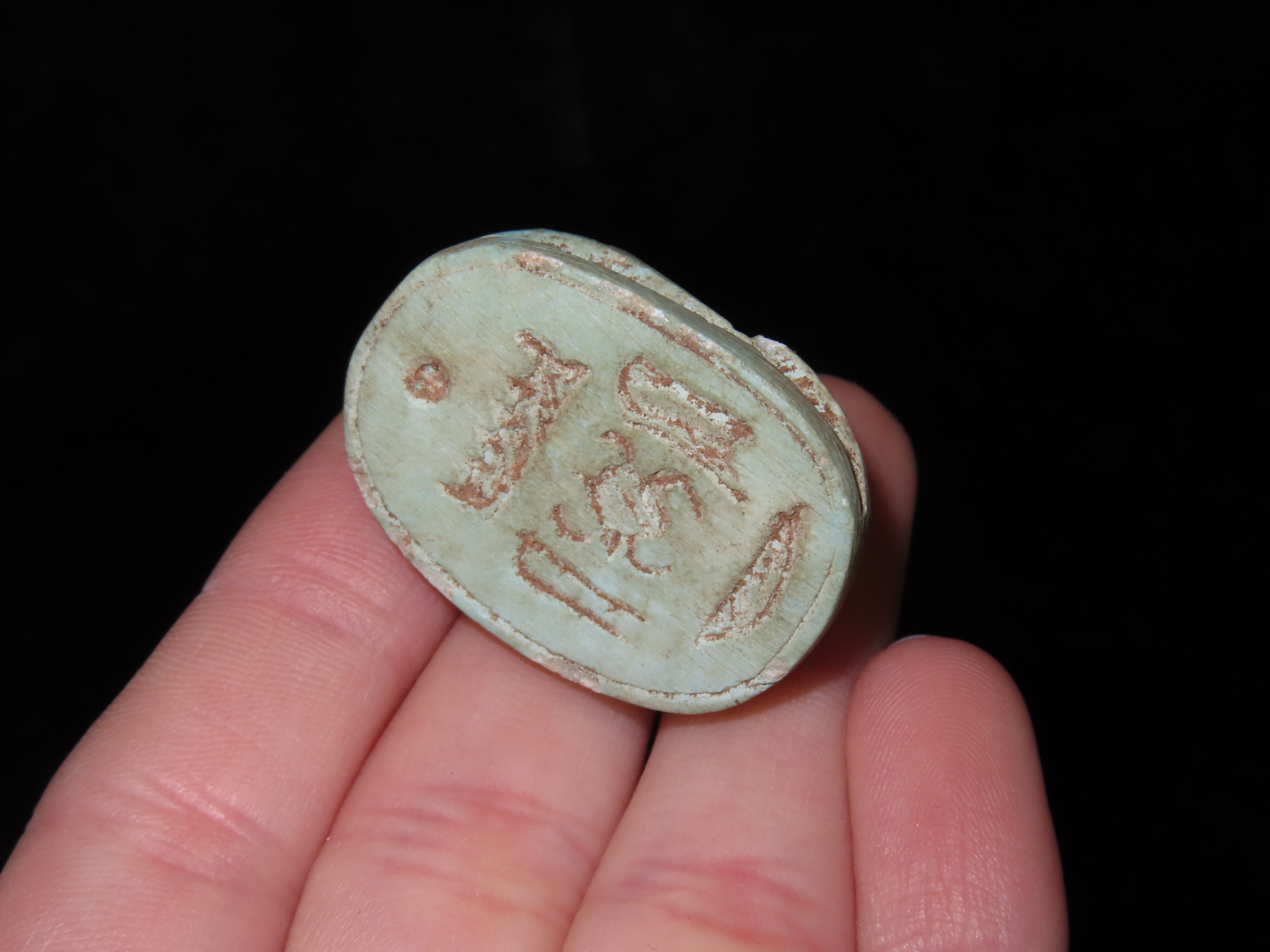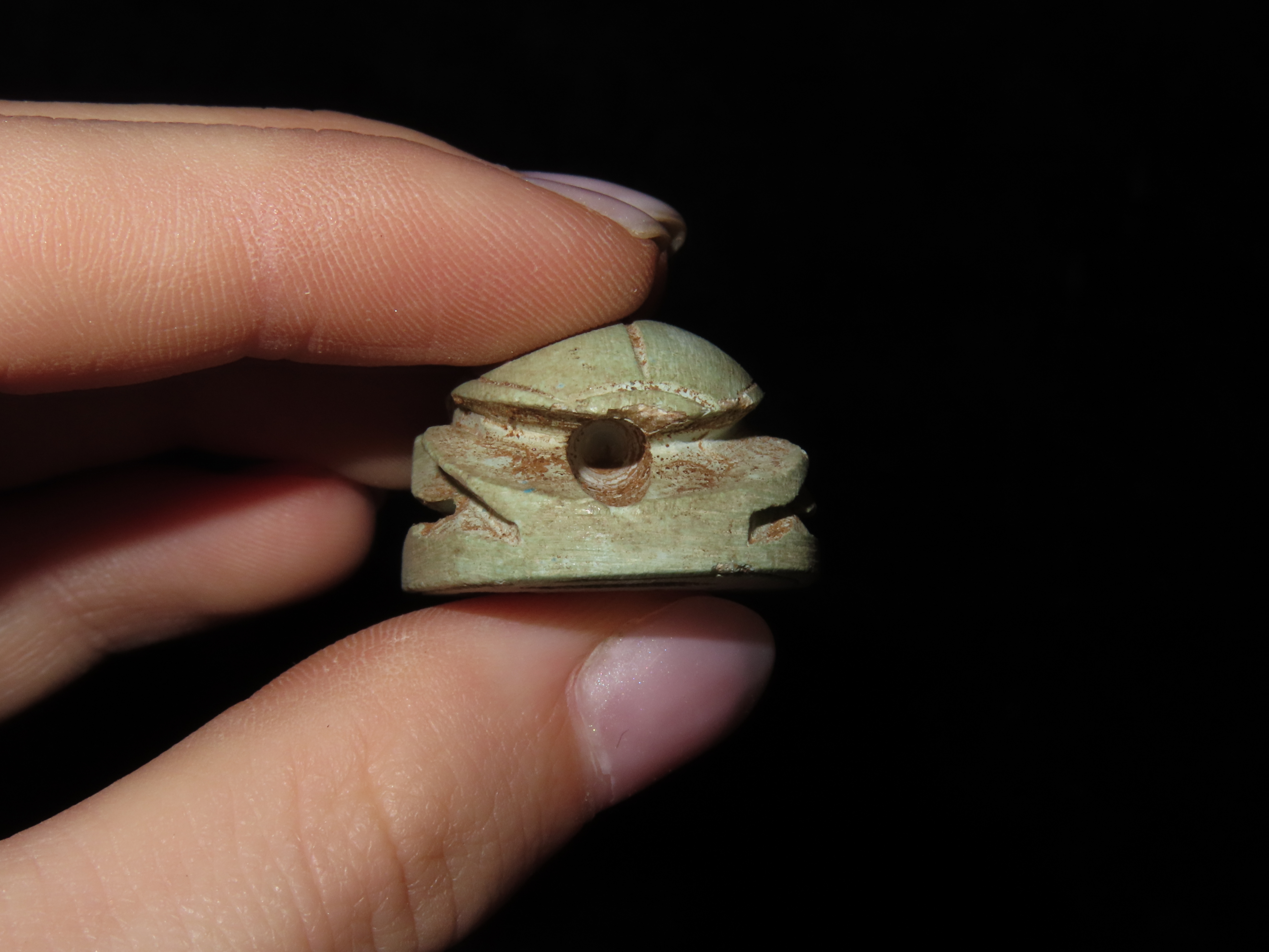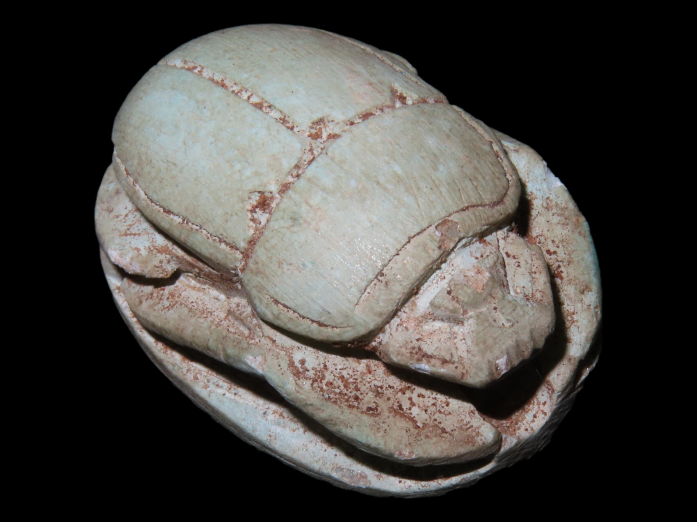 1 1/4" Eqyptian Scarab. Inscribed bottom symbolizing rebirth, regeneration and eternal cycle of life. 3000 - 2150 BC