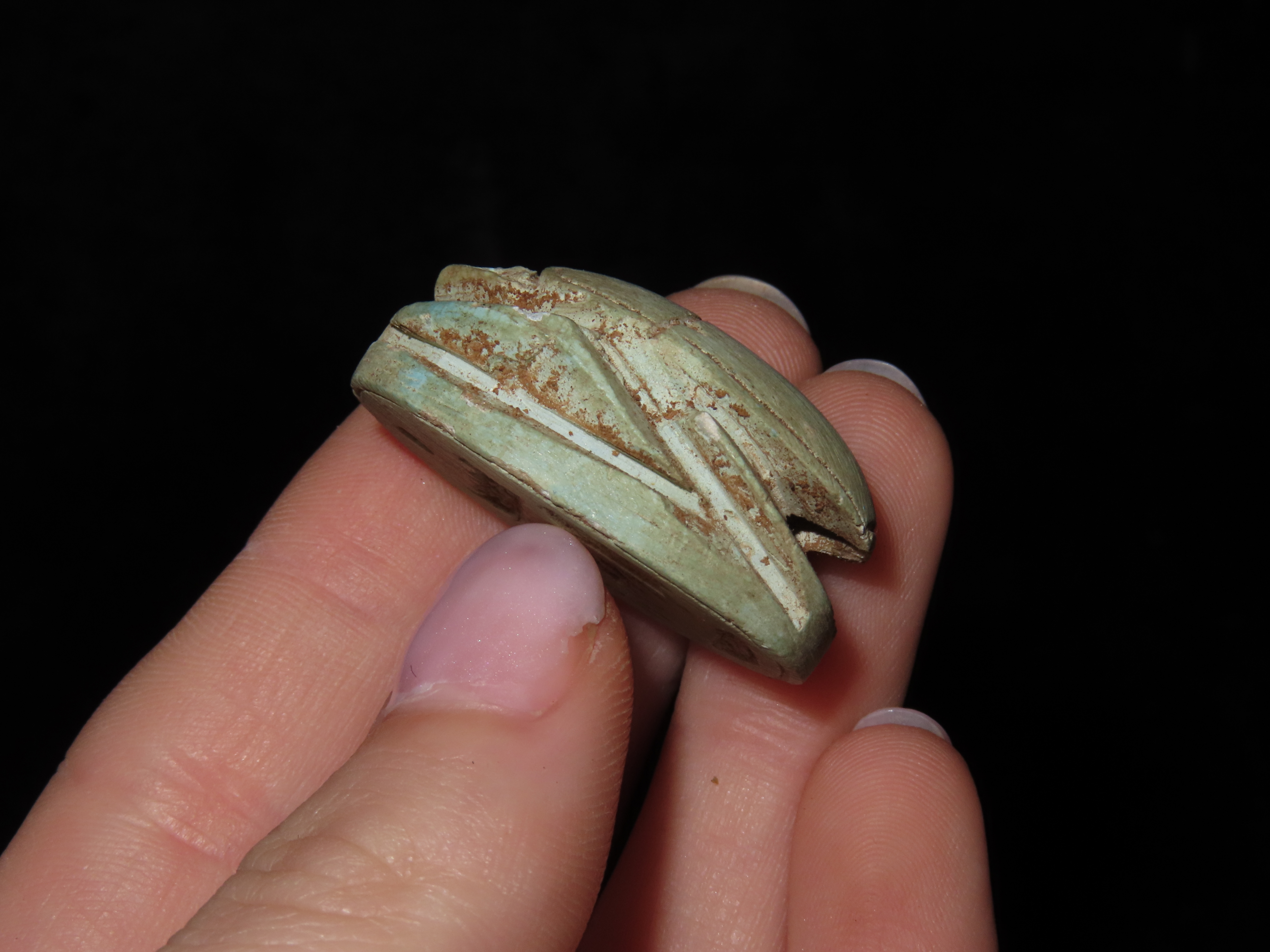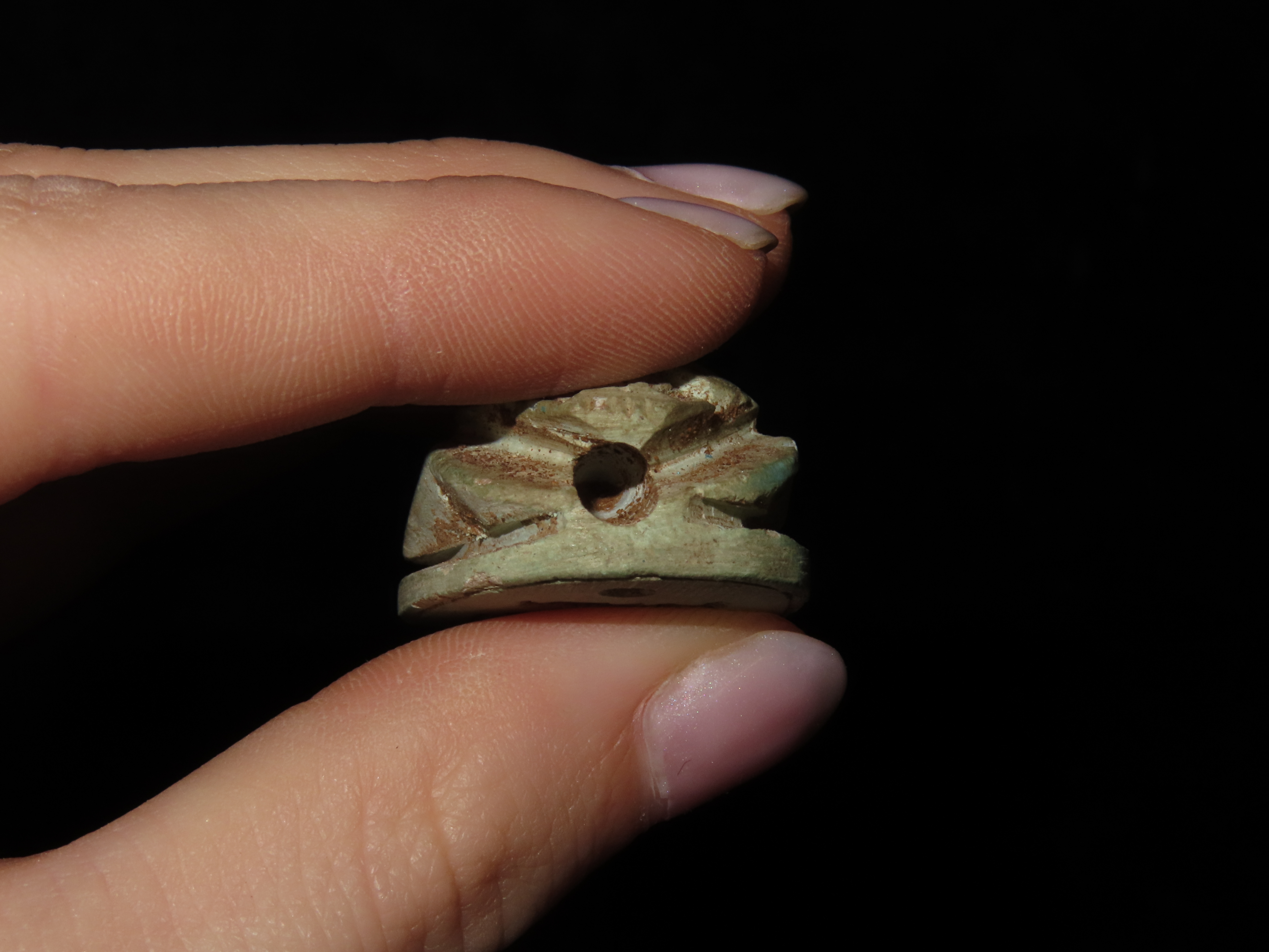 1 1/4″ Eqyptian Scarab. Inscribed bottom symbolizing rebirth, regeneration and eternal cycle of life. 3000 – 2150 BC