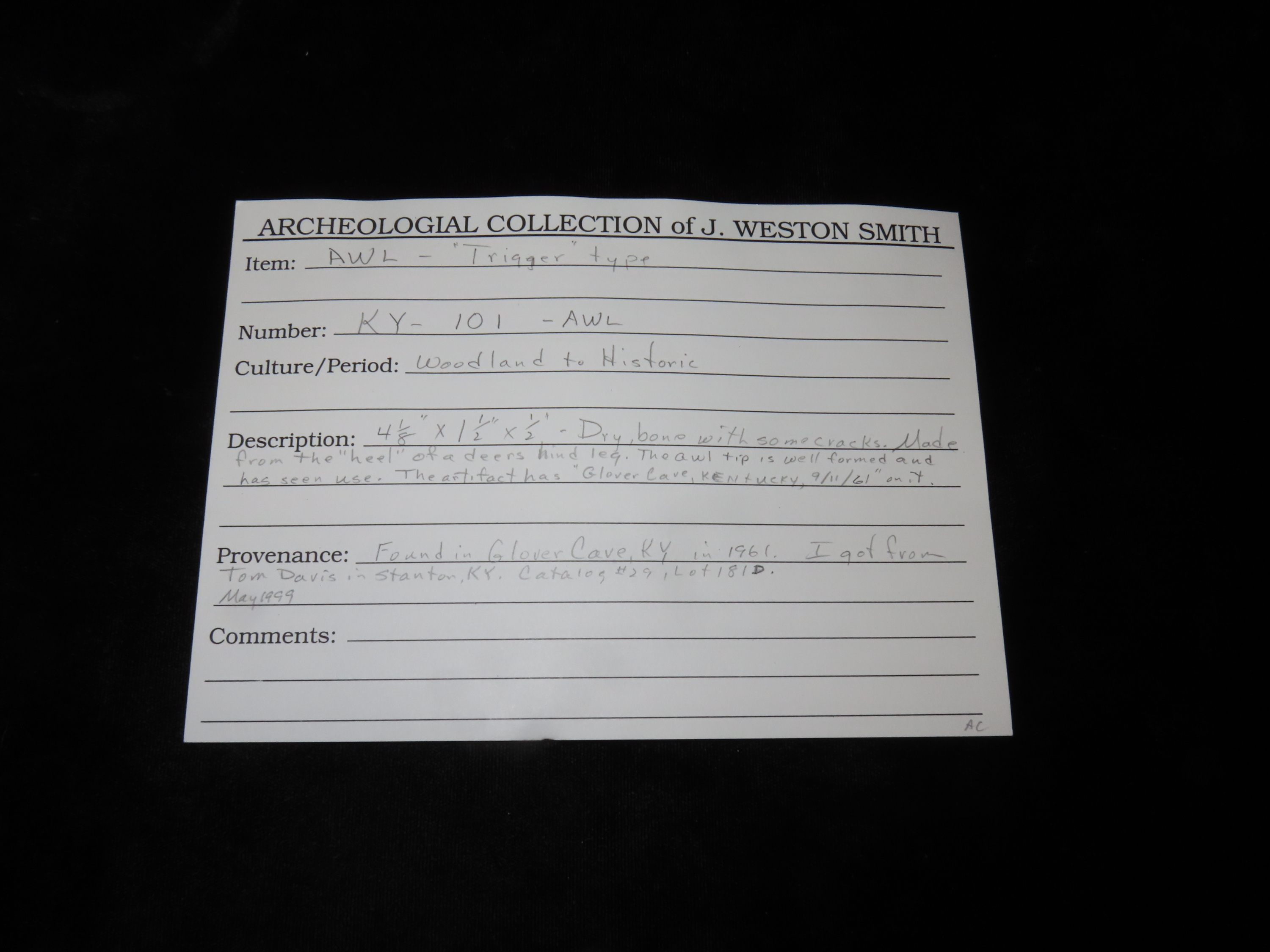4 1/8″ x 1 1/2″ x 1/2″ Awl – Trigger type. Bone. Glover Cave, KY