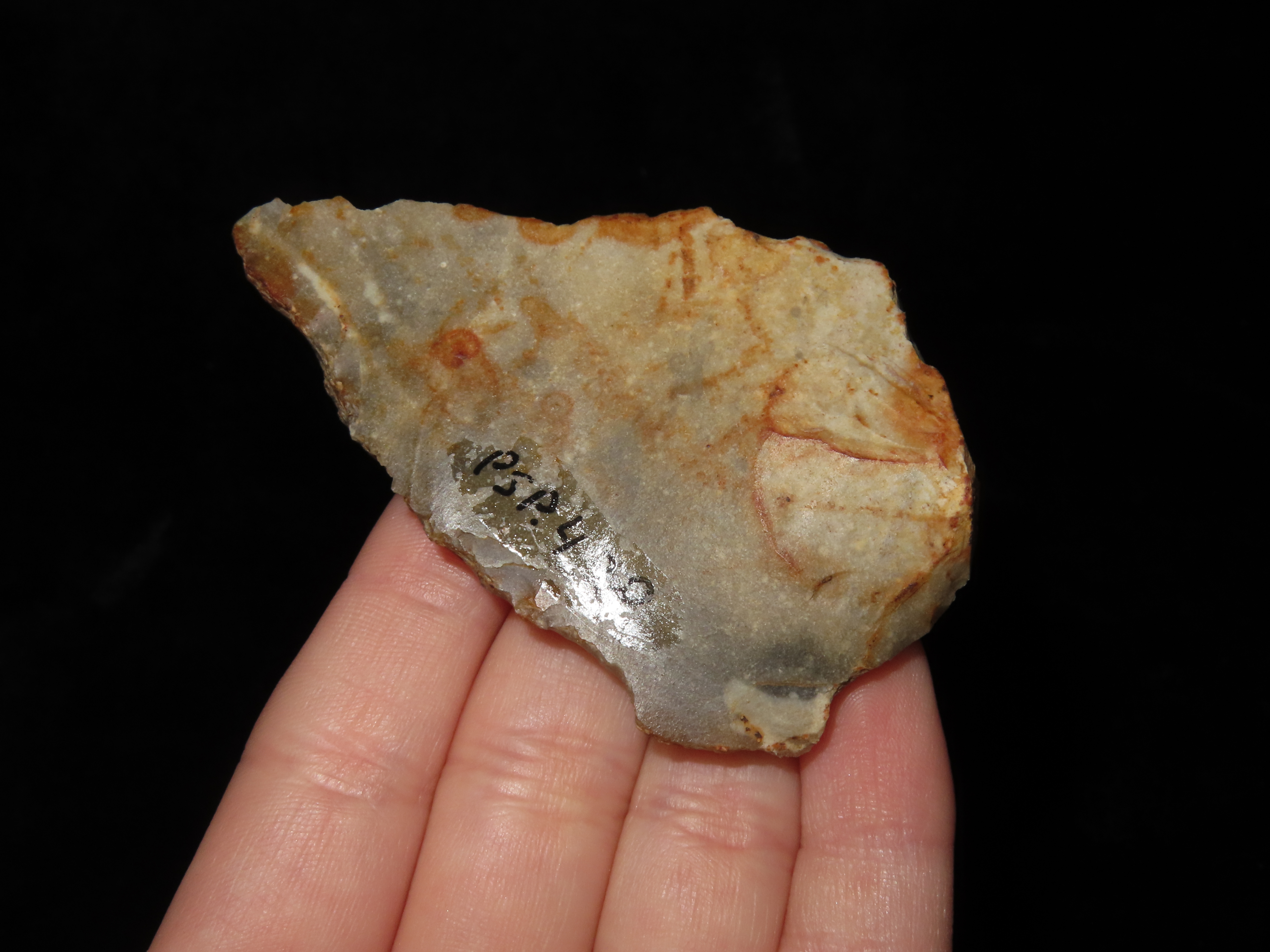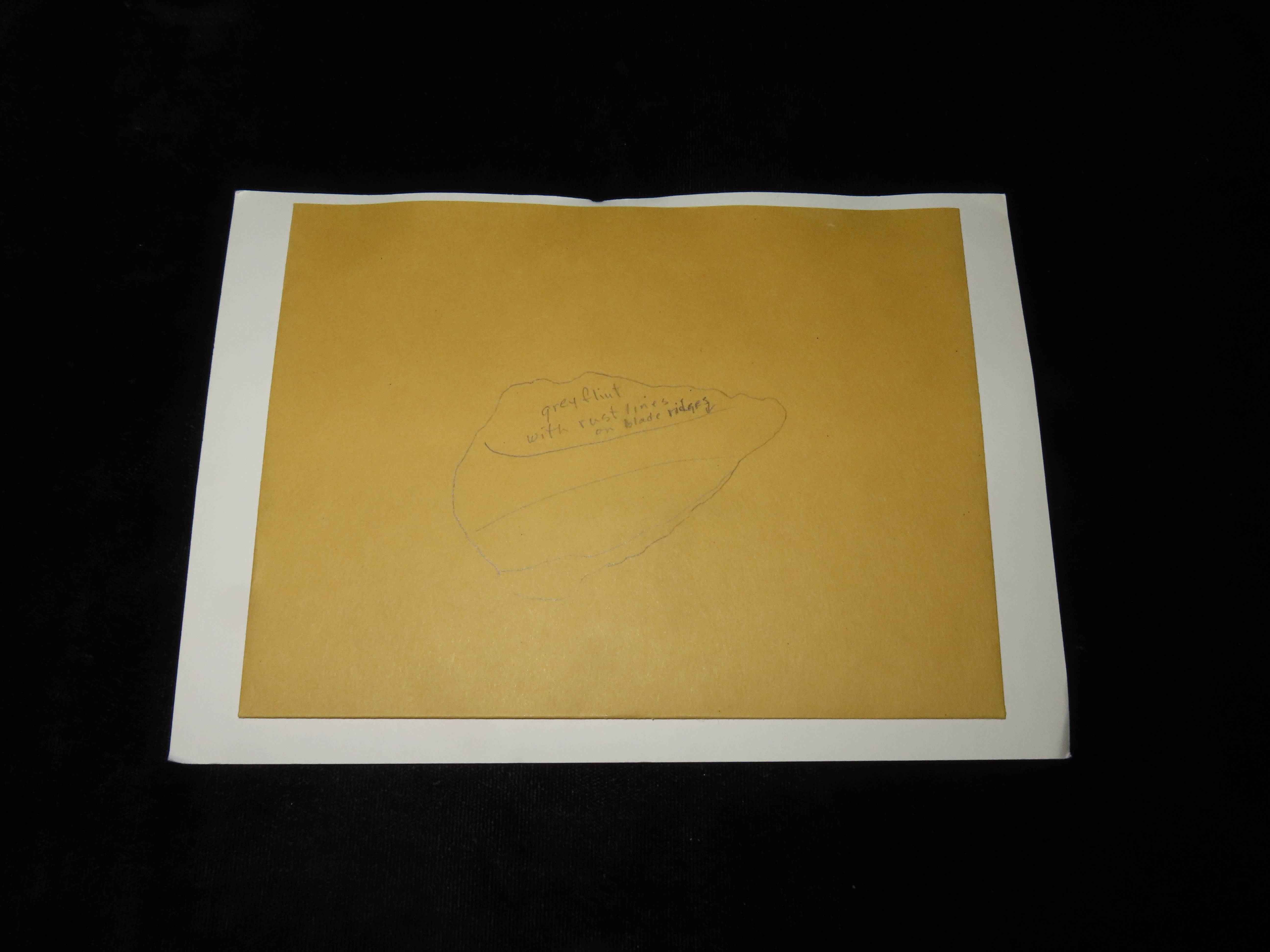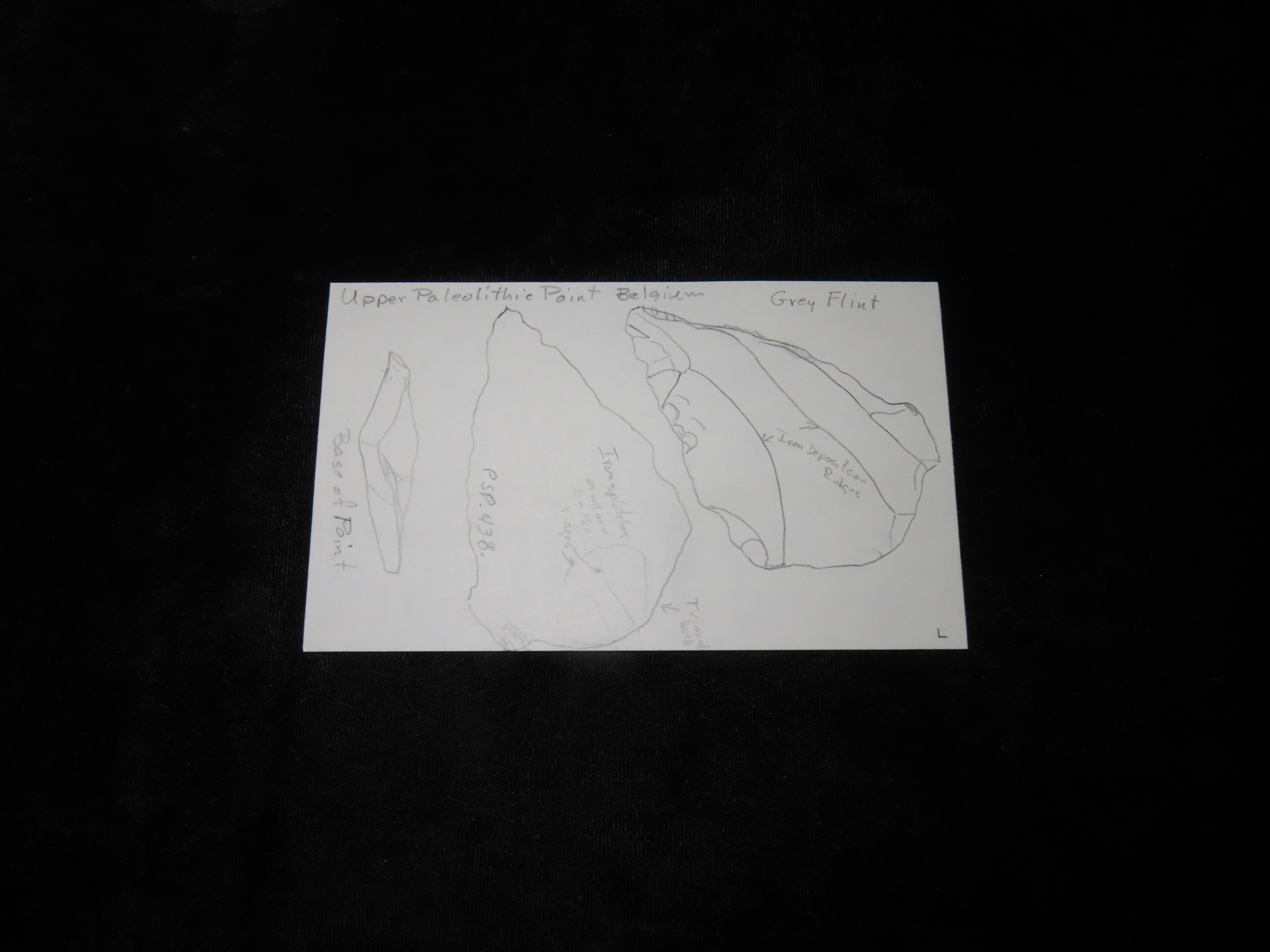 2 7/8″ x 1 3/4″ x 1/2″ Levallois Arrowhead. Gray prepared core. Belgium.