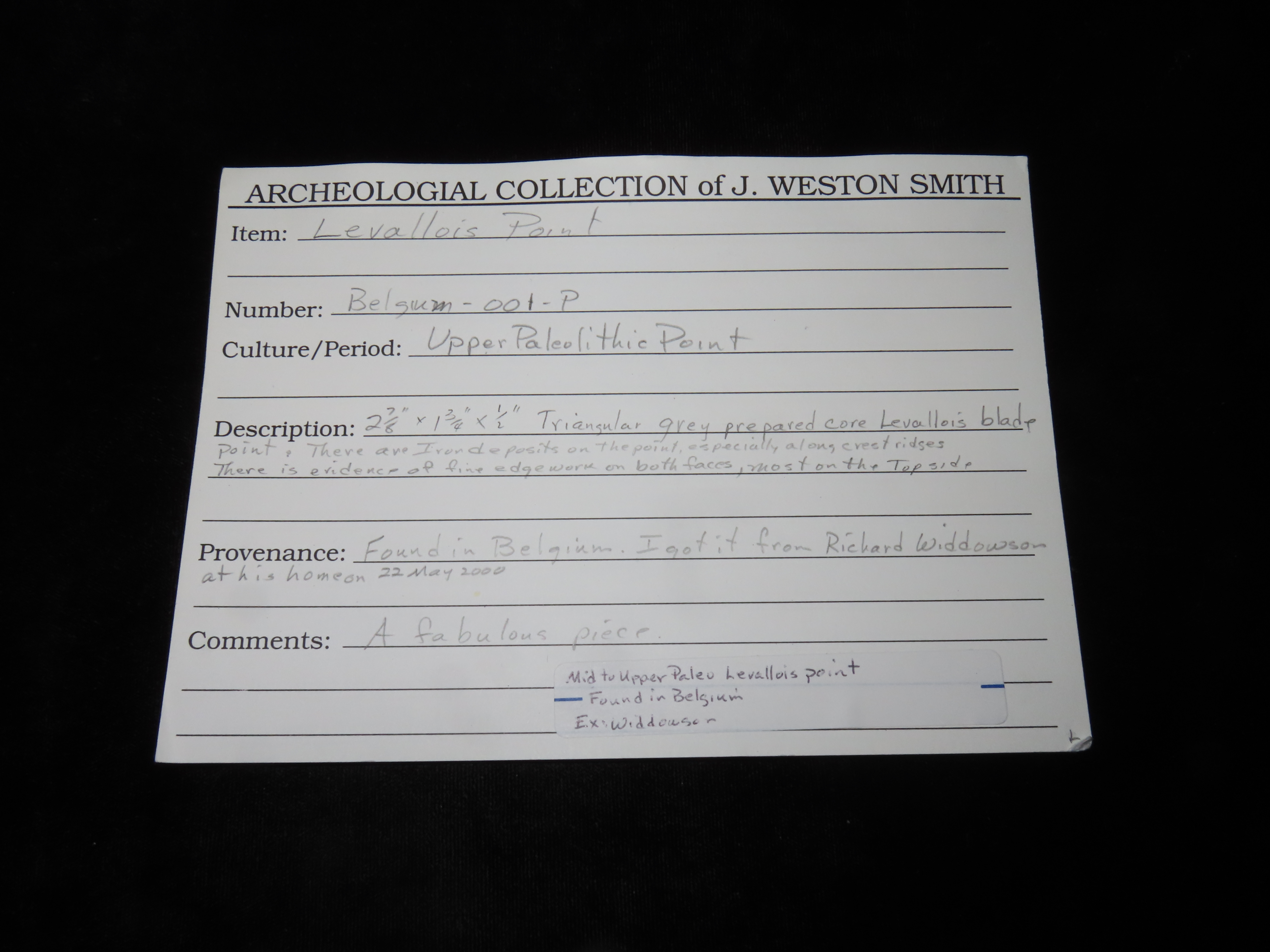 2 7/8" x 1 3/4" x 1/2" Levallois Arrowhead. Gray prepared core. Belgium.
