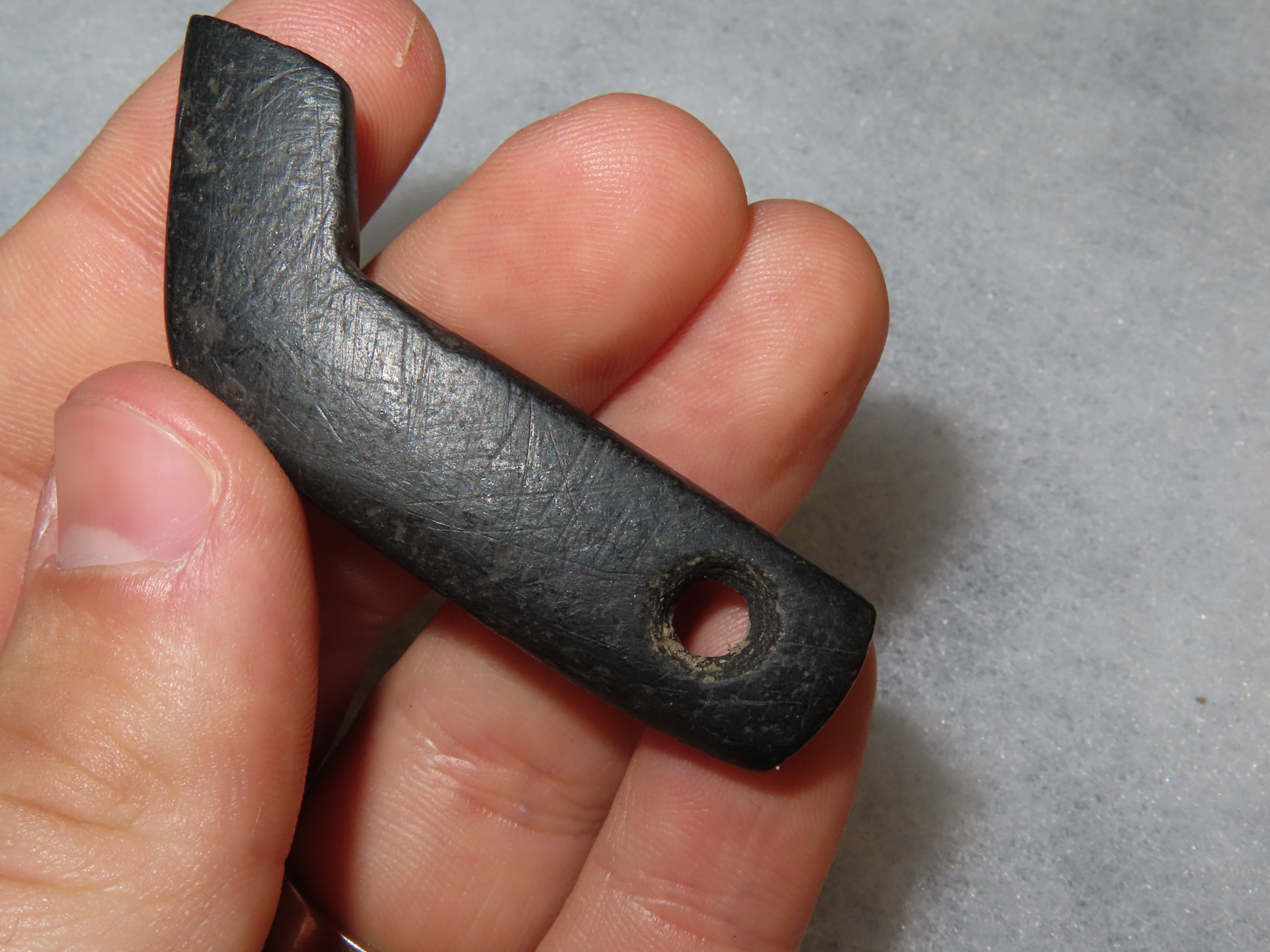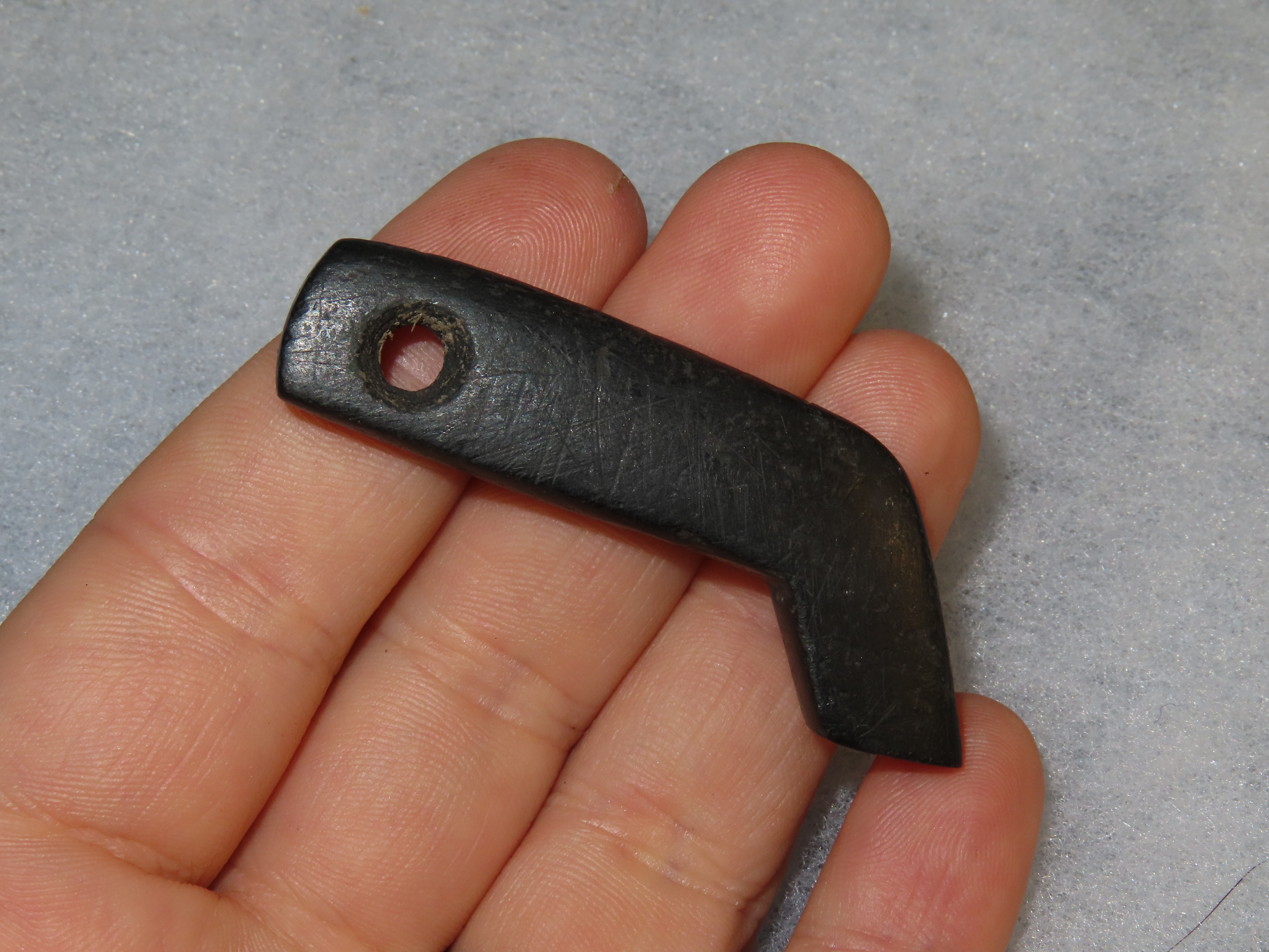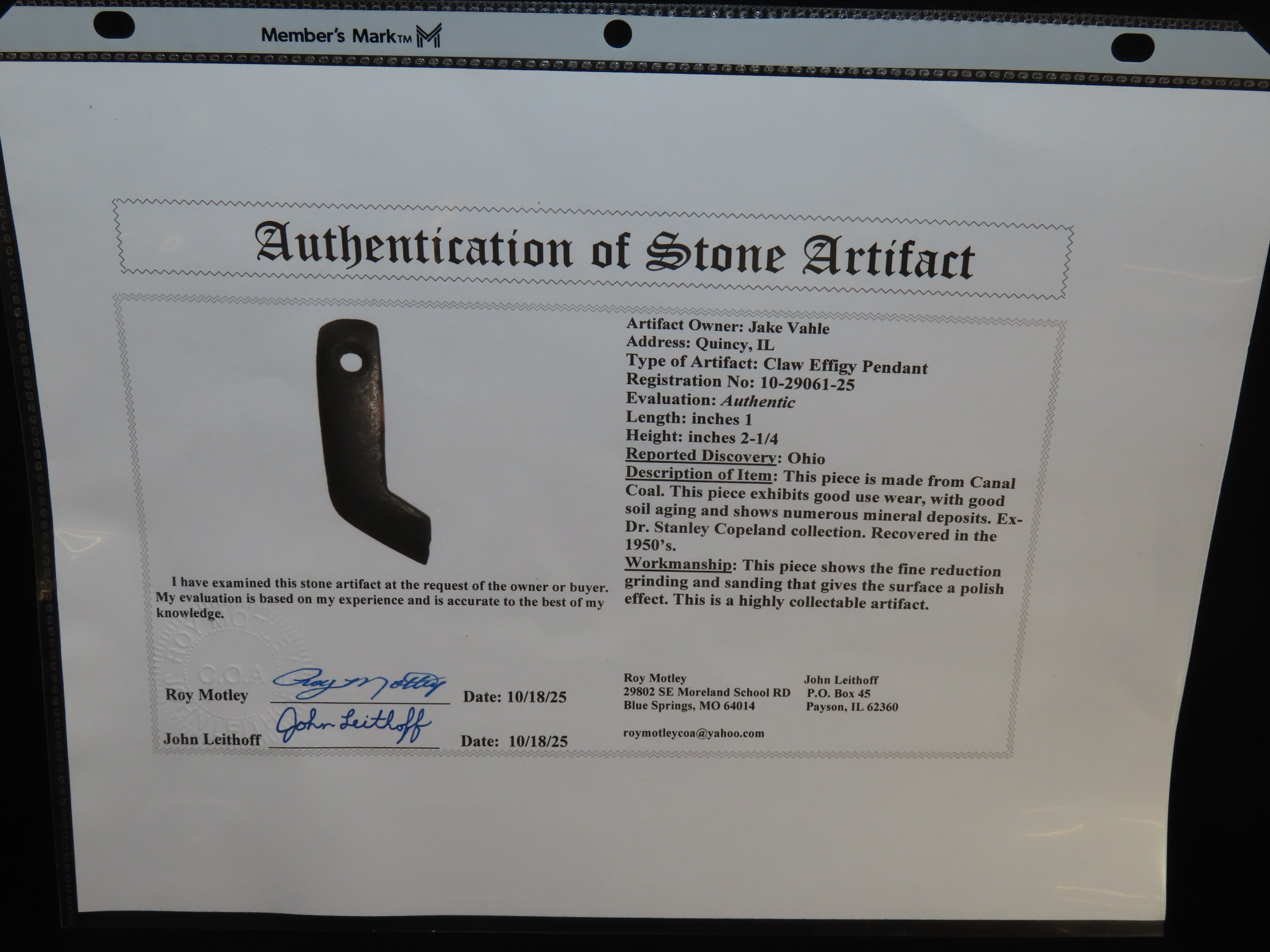 2 1/4″ x 1″ Effigy Claw Pendant, Canal Coal, Motley / Leithoff COA, Recovered in the 1950s in Ohio, Ex Dr. Stanley Copeland